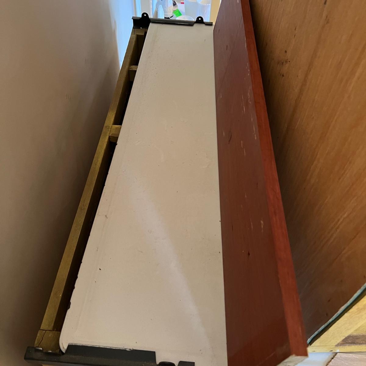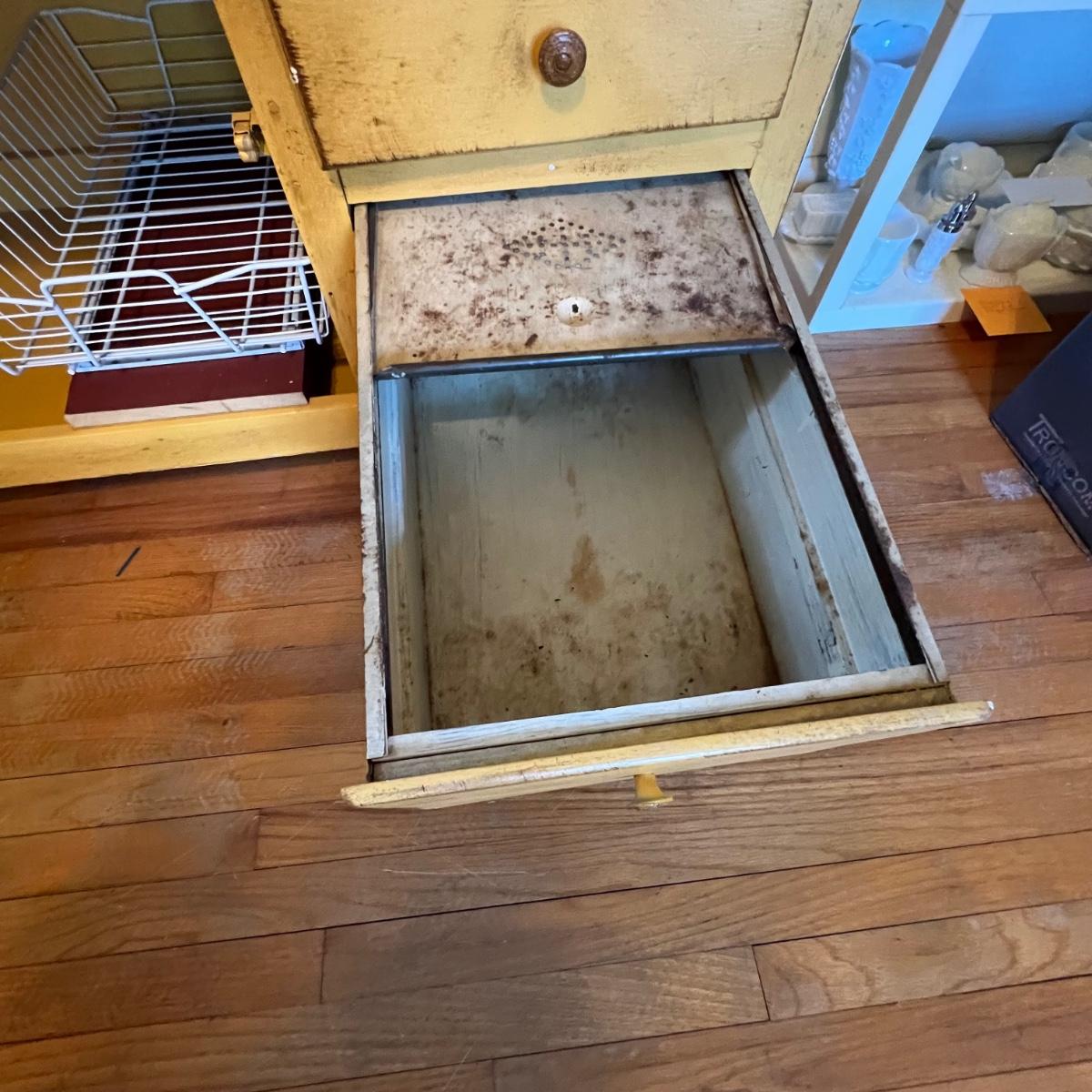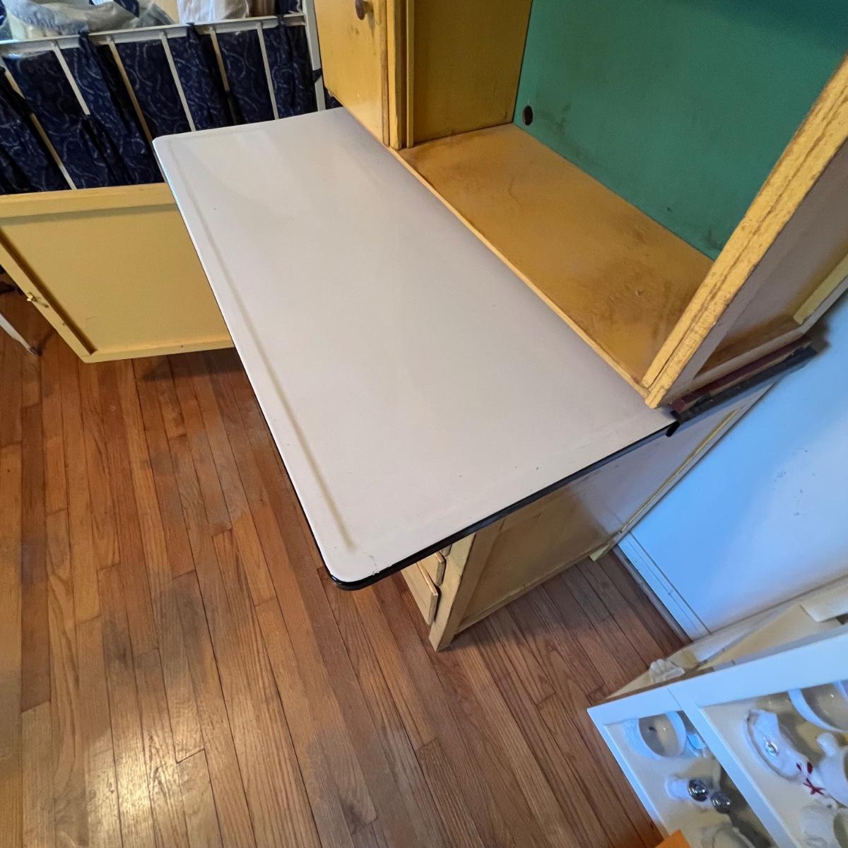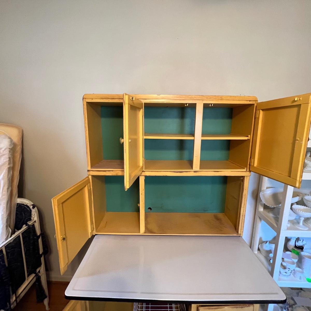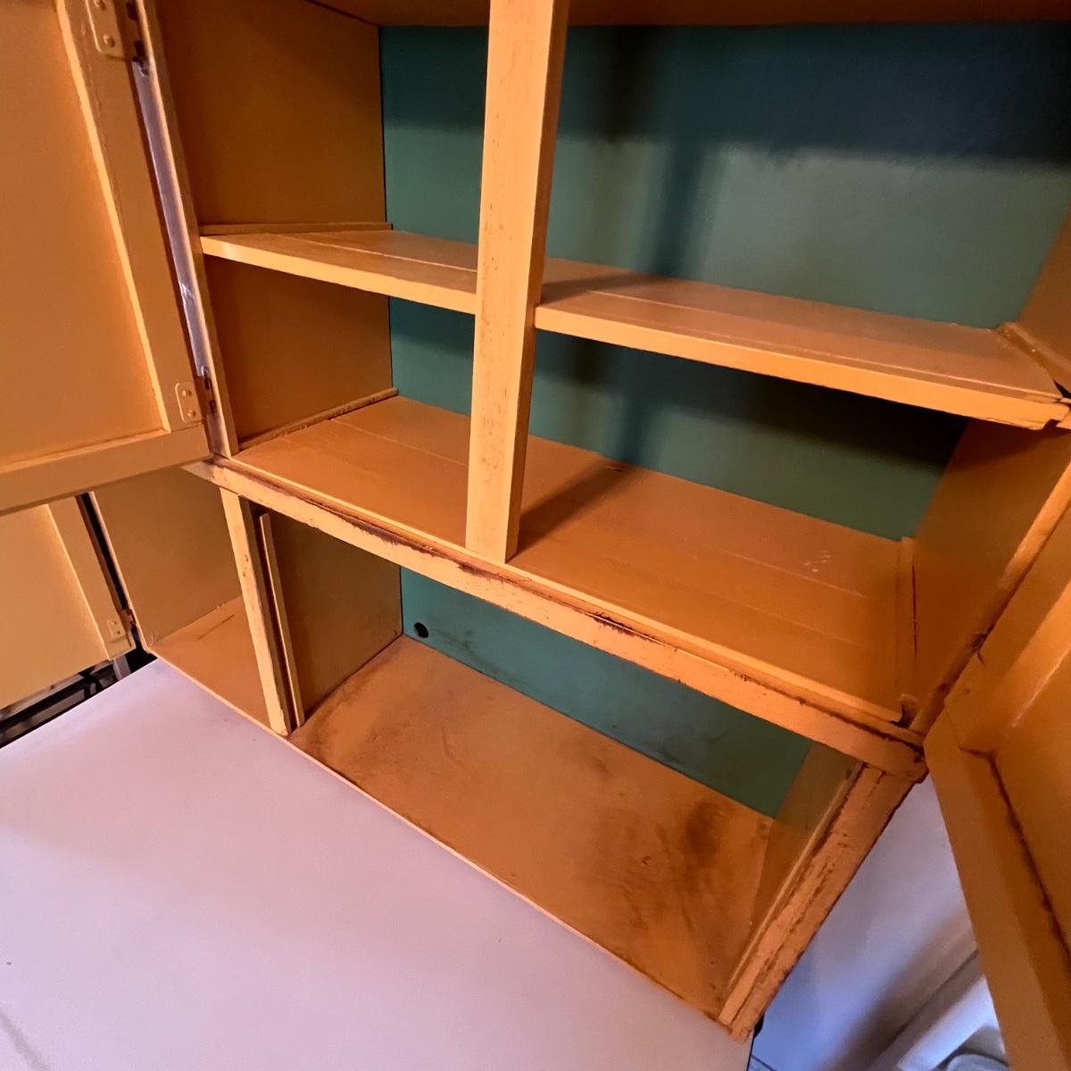 This Hoosier style cabinet is two pieces. Lower section has one cabinet flanked by three drawers with the bottom drawer having its original metal lid. Enameled top work surface has the top section resting on it. This section has two open sections and two with doors (note it has a hole to feed electrical cable through). See images as there have been modifications made over the years. Wood is a distressed yellow paint. Latter images show a piece of wood that the top section rests on to protect the enamel surface; this piece of wood is removable.