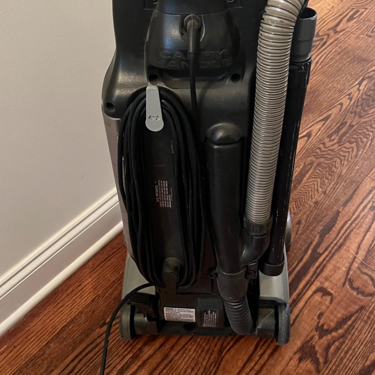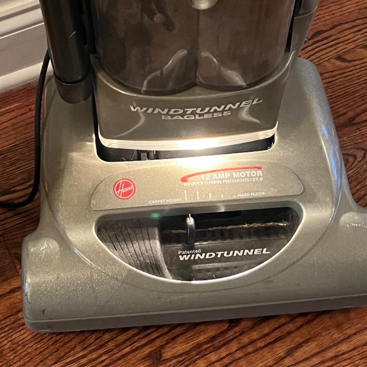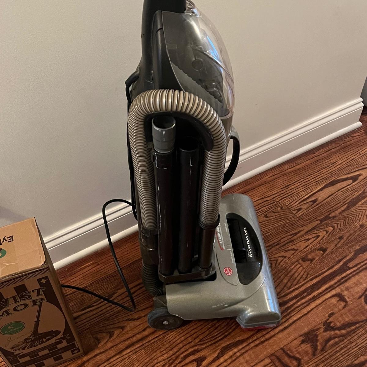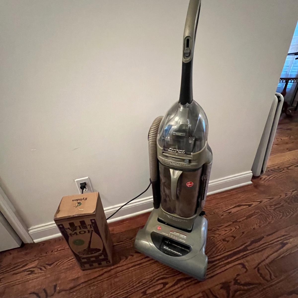 Hoover WindTunnel vacuum is bagless. Powered on when tested and measures 15” x 15” x 44”H. Also includes a new in box twist mop.