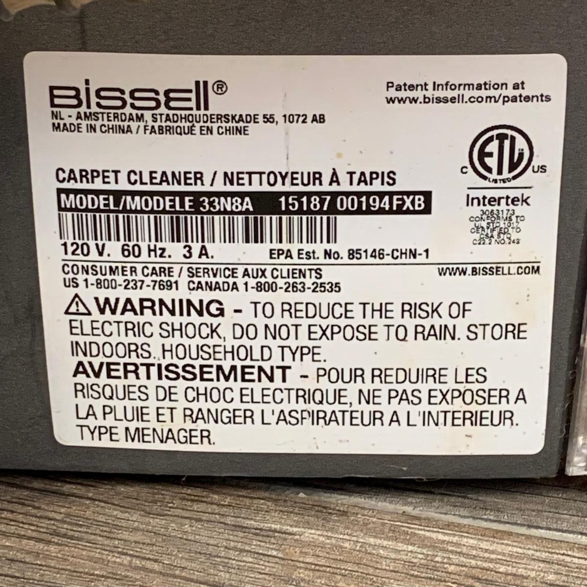 Two items in this lot include a Hoover Dual Power Max Carpet Washer and a Bissell Spotbot Pet. Both items power on when plugged in. The Hoover is Model FH51000. A bag with attachments is included. There is some liquid in the Hoover that is likely water or a cleaning solution. The Bissell is Model 33N8A. Both items have been used and are a bit dirty.