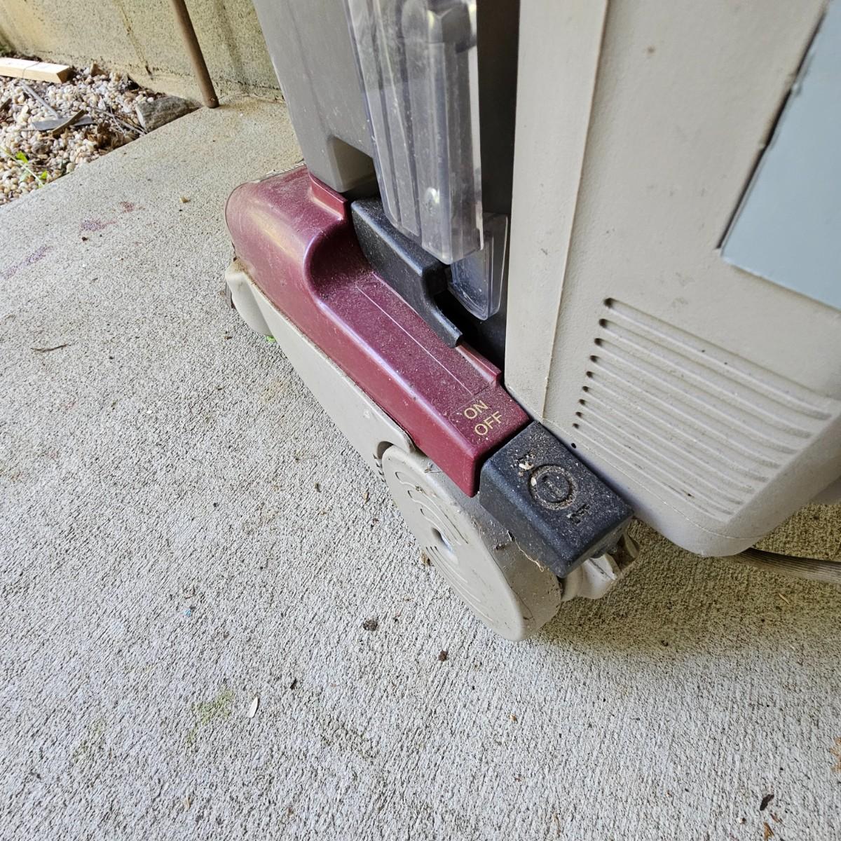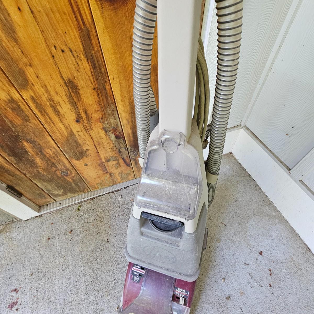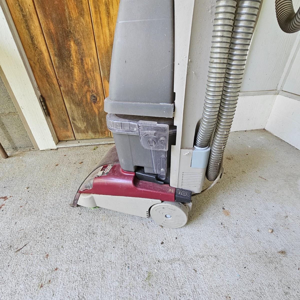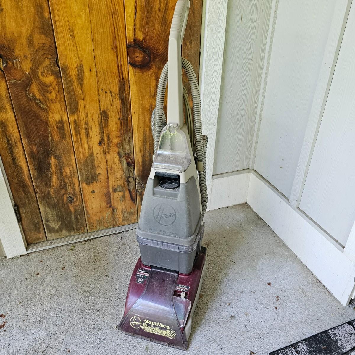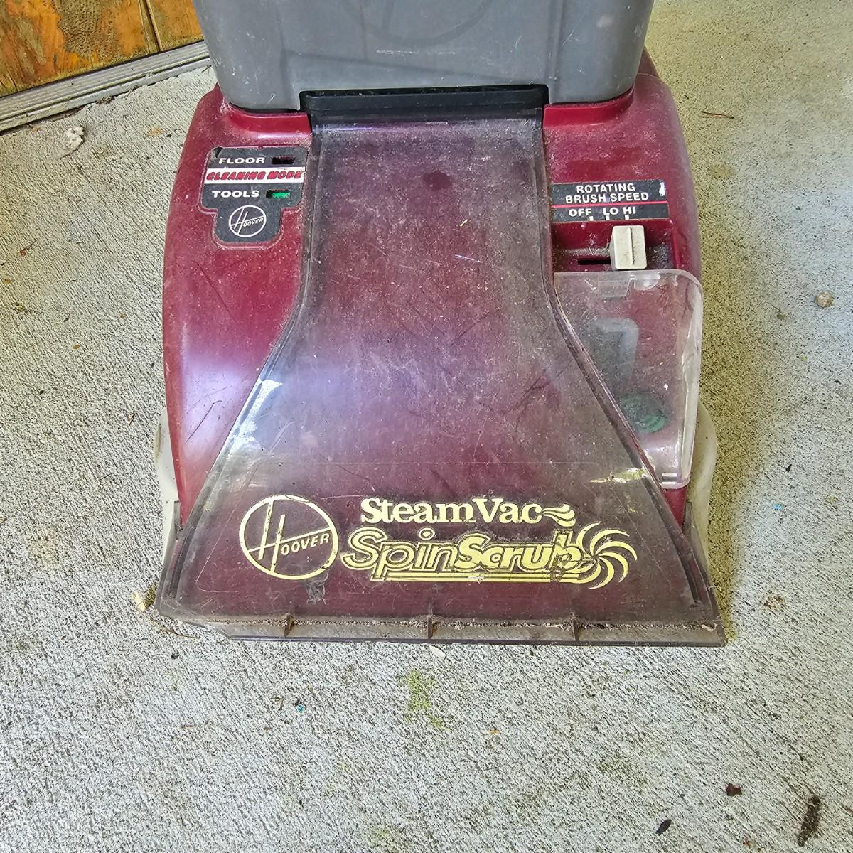 One Hoover steam vacuum unit with Spin Scrub capability. Upright floor model, adjustable speed on brush. No attachments. Powered on when plugged in. Small corner missing on lower front intake. See photos for details. Local pickup only.