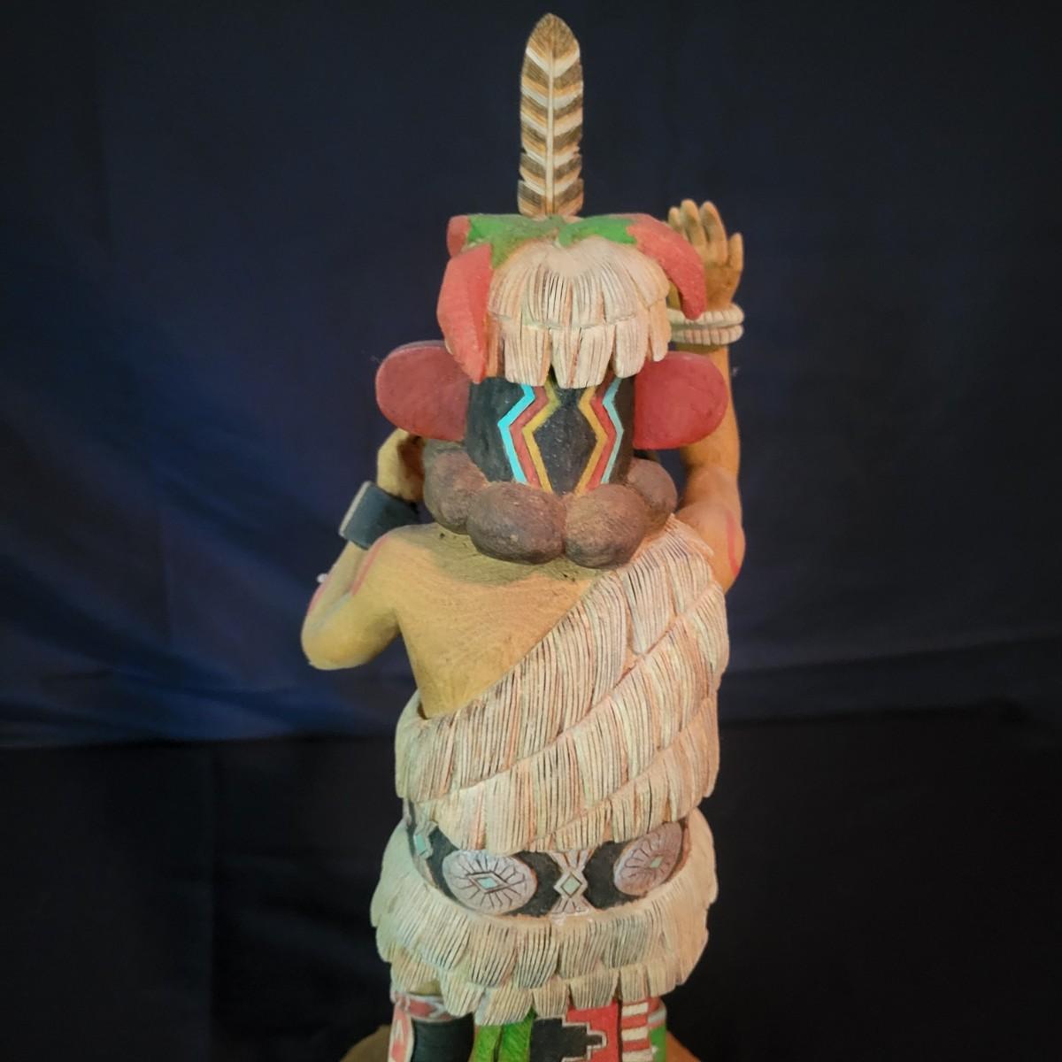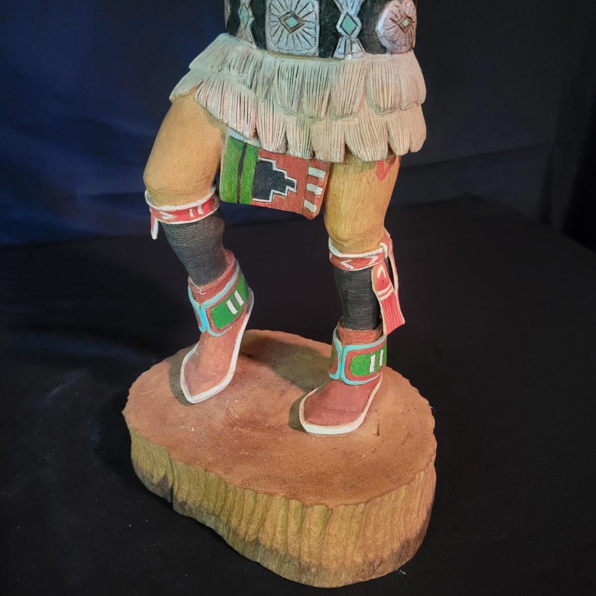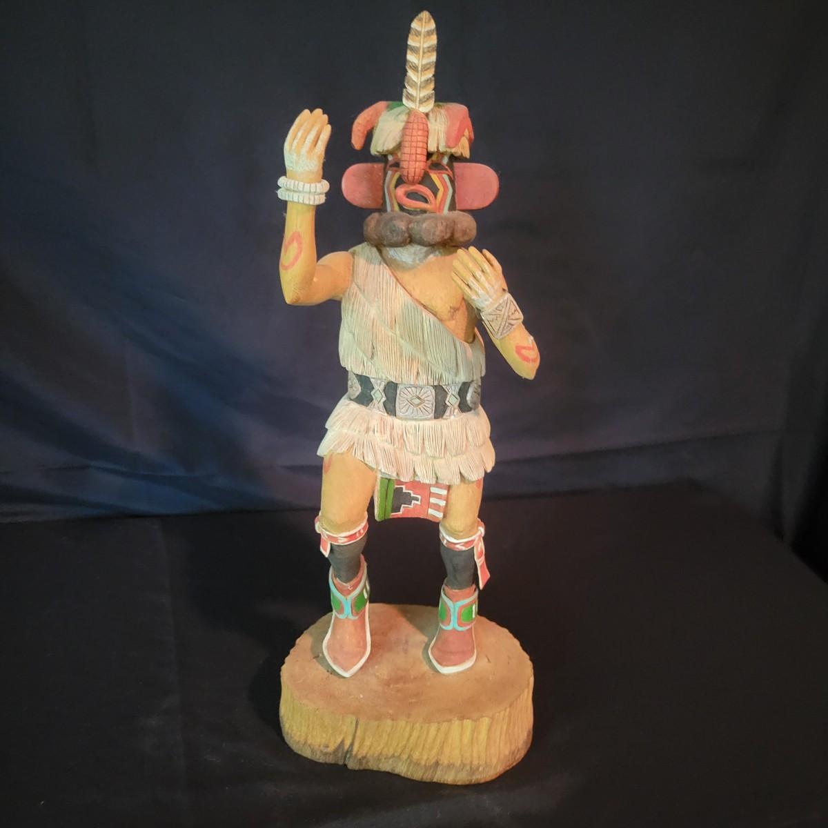 A hand carved cottonwood Kachina with the number 1950 written on its base. If features exquisite detail and rich colors. It measures approximately 6" x 4.5" x 16"H. Shipping available