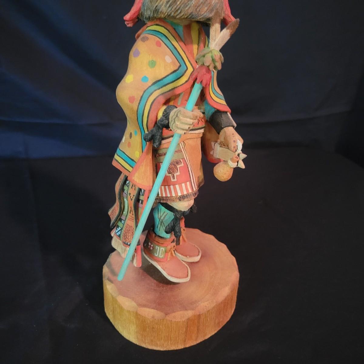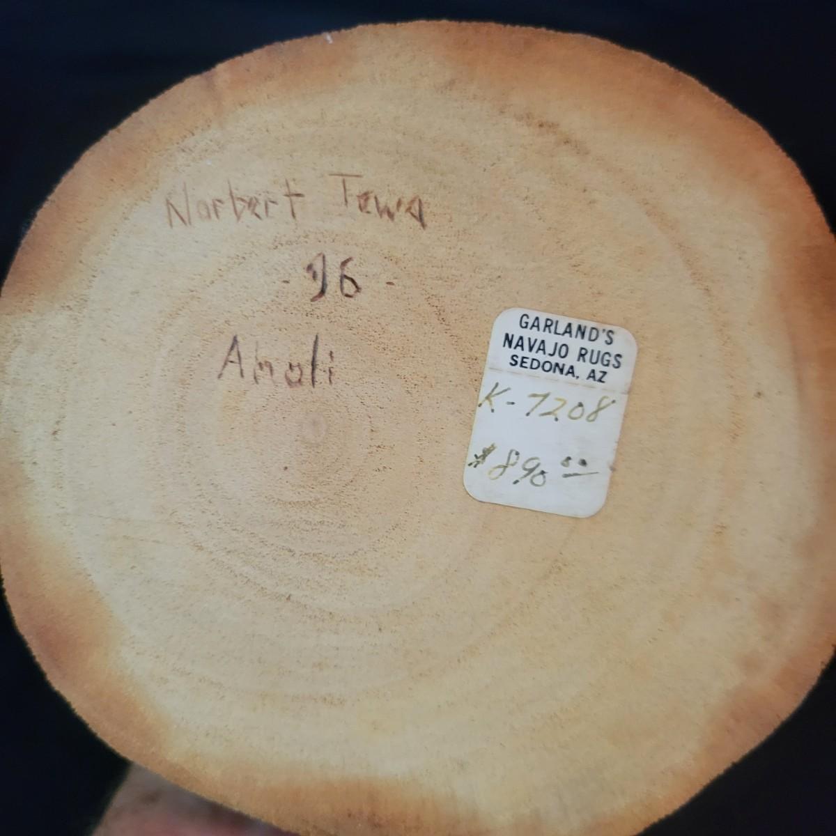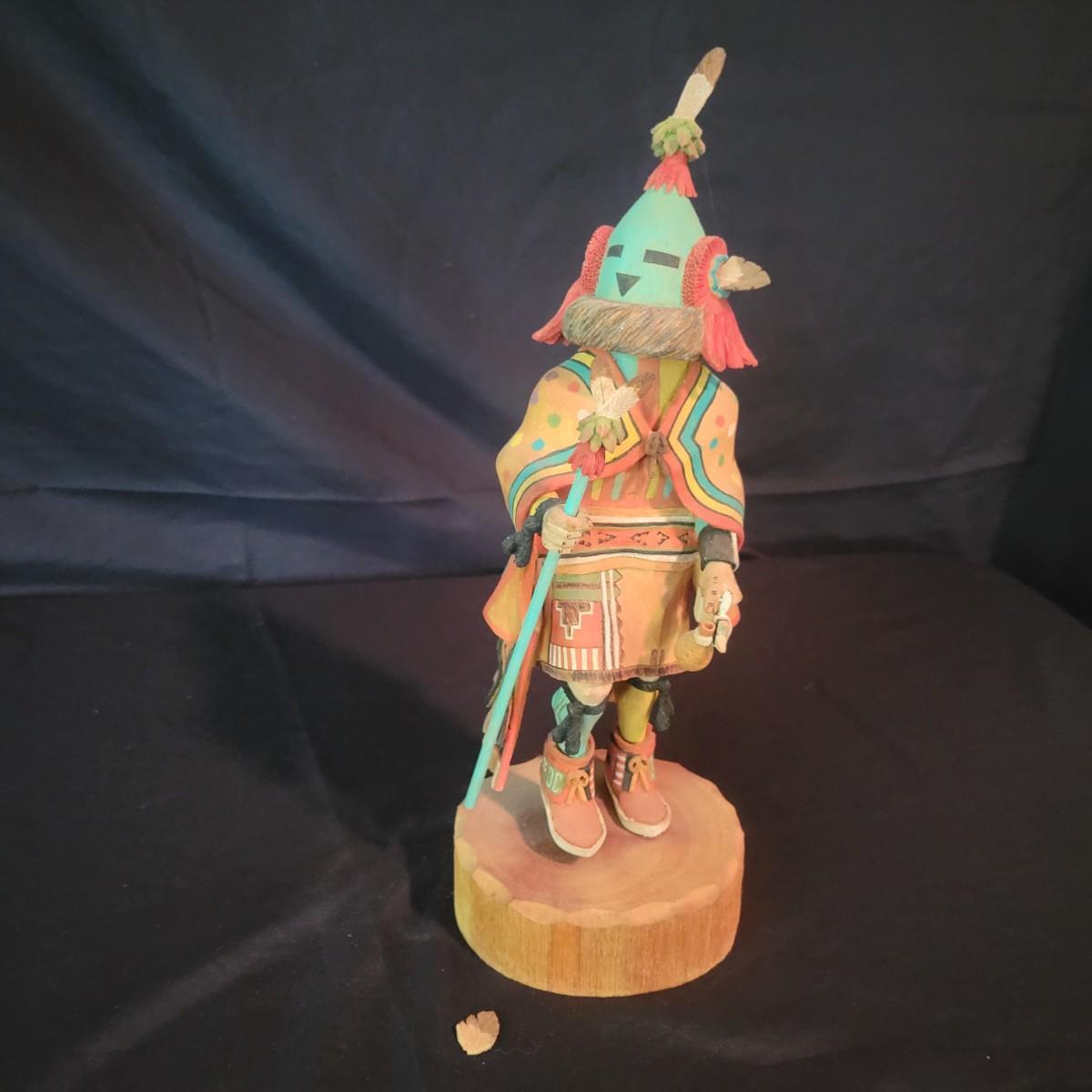 A wooden Hopi Kachina doll signed by Norbert Tewa. This piece has exquisite detail and vivid coloring. It measures approximately 4.5'D x 13"H. An ear on the carving is broken, but is included and could be repaired. Shipping available