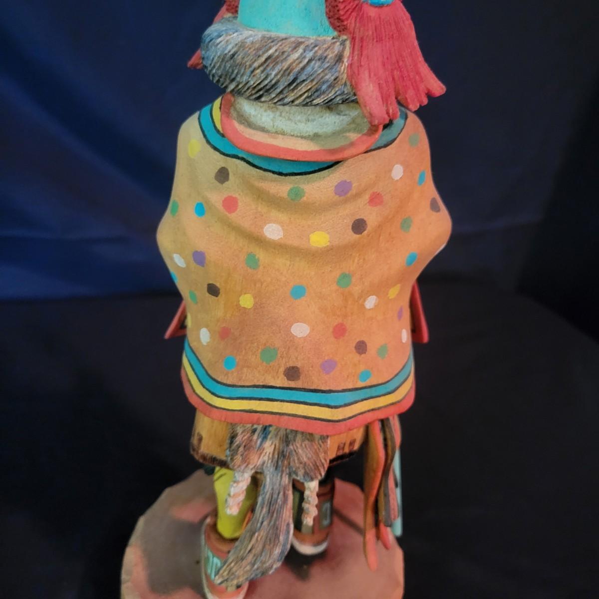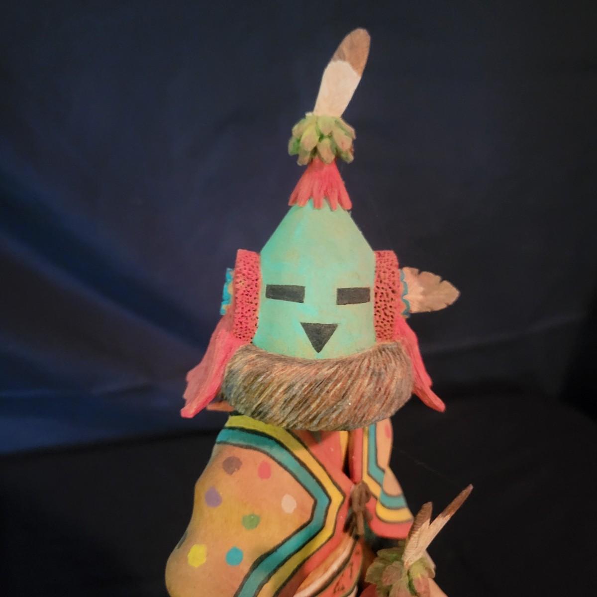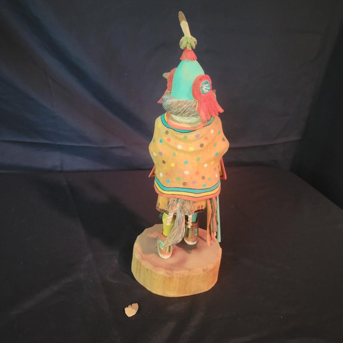 A wooden Hopi Kachina doll signed by Norbert Tewa. This piece has exquisite detail and vivid coloring. It measures approximately 4.5'D x 13"H. An ear on the carving is broken, but is included and could be repaired. Shipping available