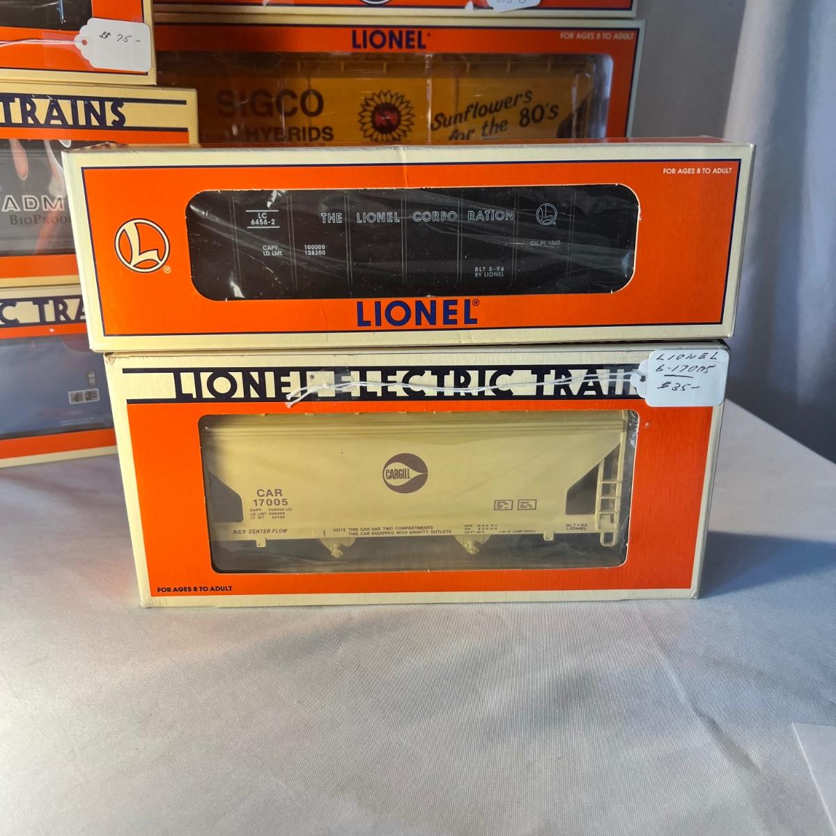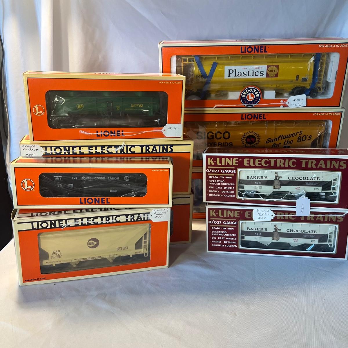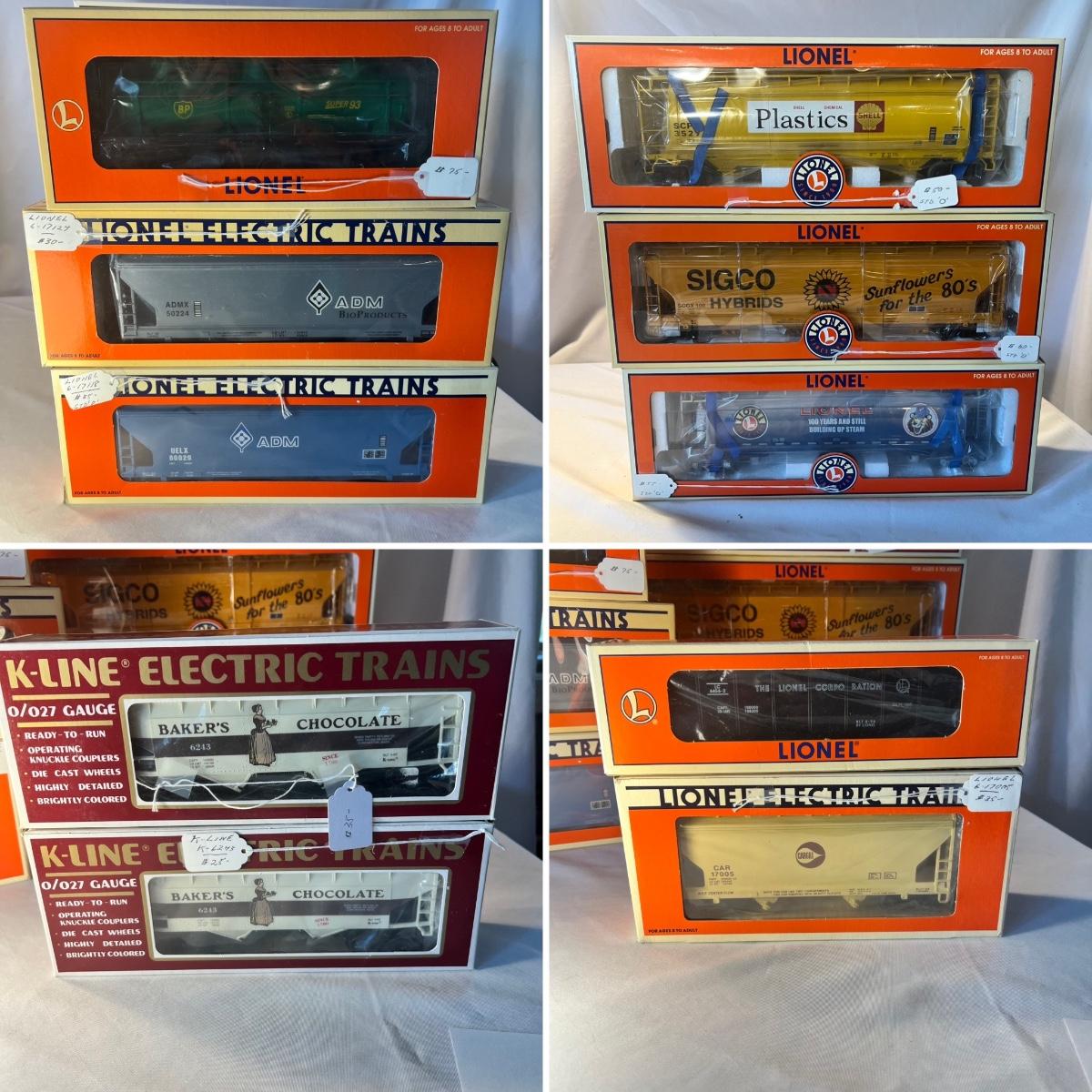 Eight Lionel and two K-Line hoppers. All come with their original boxes, see pics for full inventory. The Sigco Sunflowers for the 80’s measures approximately 3.5” x 3” x 14” long. Please note that any price tag seen on an item was not put there by Sterling Transitions and does not reflect the current value of the item.