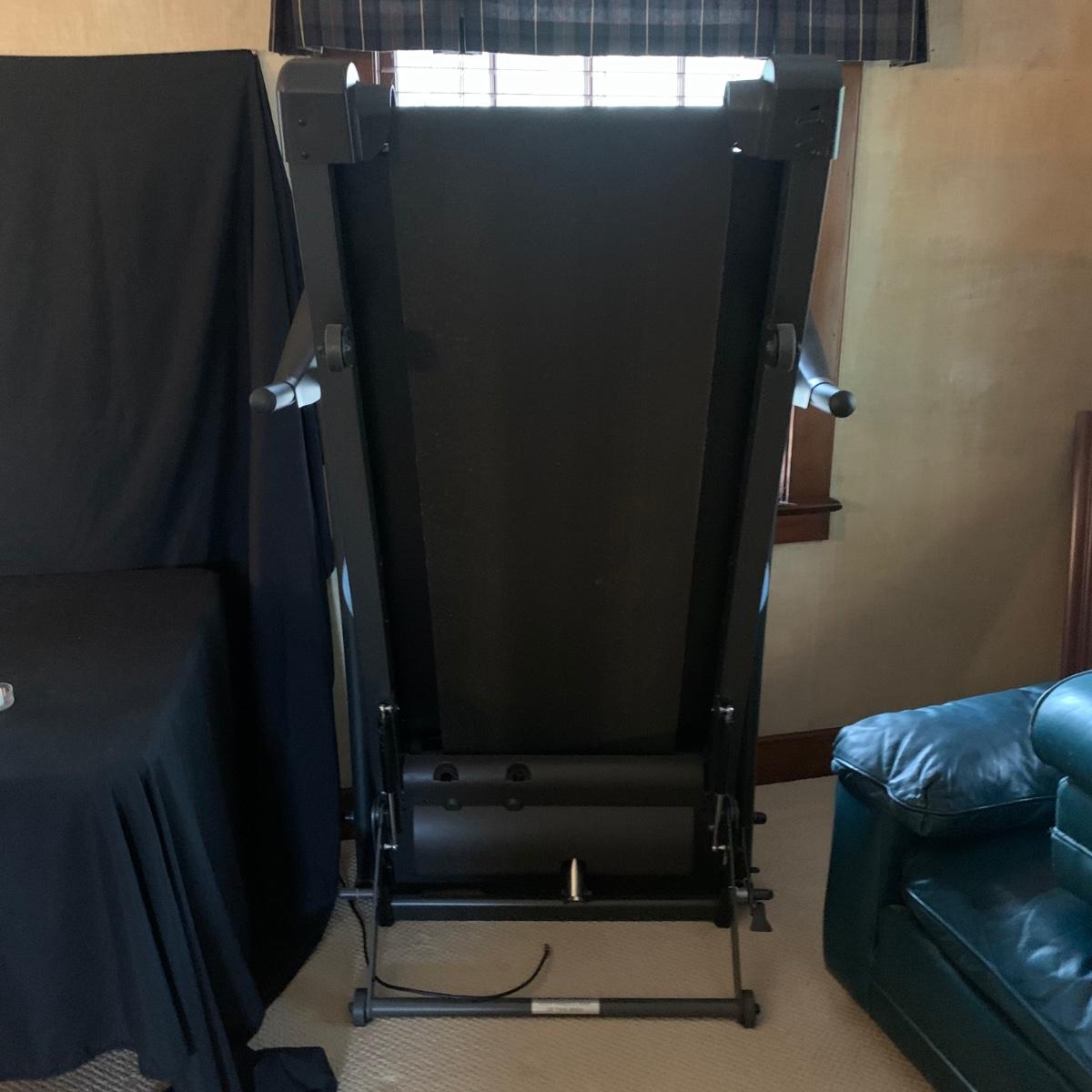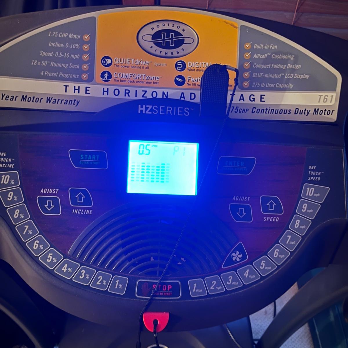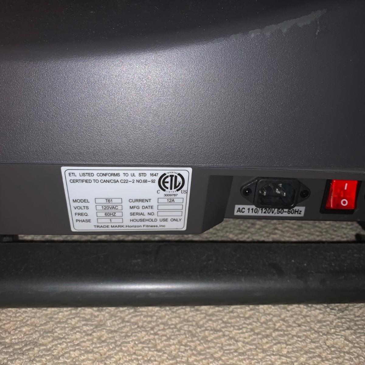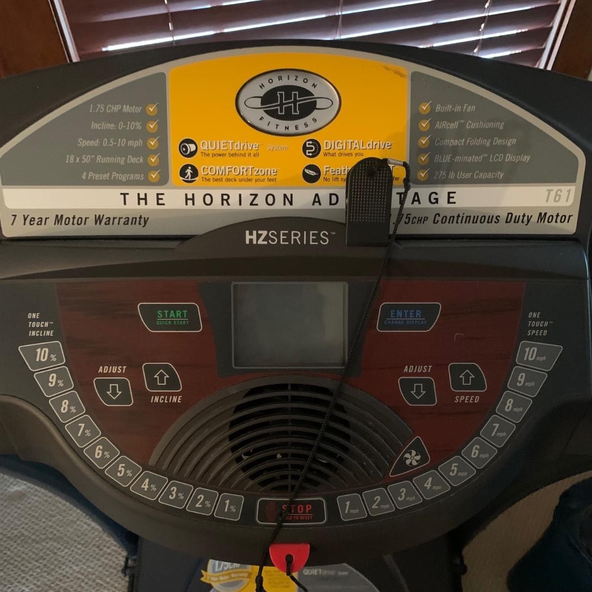 Horizon Fitness treadmill. Treadmill features featherlight lift system for easy storage. Treadmill measures approximately, 35” x 66” x 55”H. Treadmill powered on when plugged in. Please see photos for more details. Local pickup only. Winning bidder must bring assistance to help move and load this item due to its weight and/or size. Item will have to be moved down a flight of stairs and to the exit.