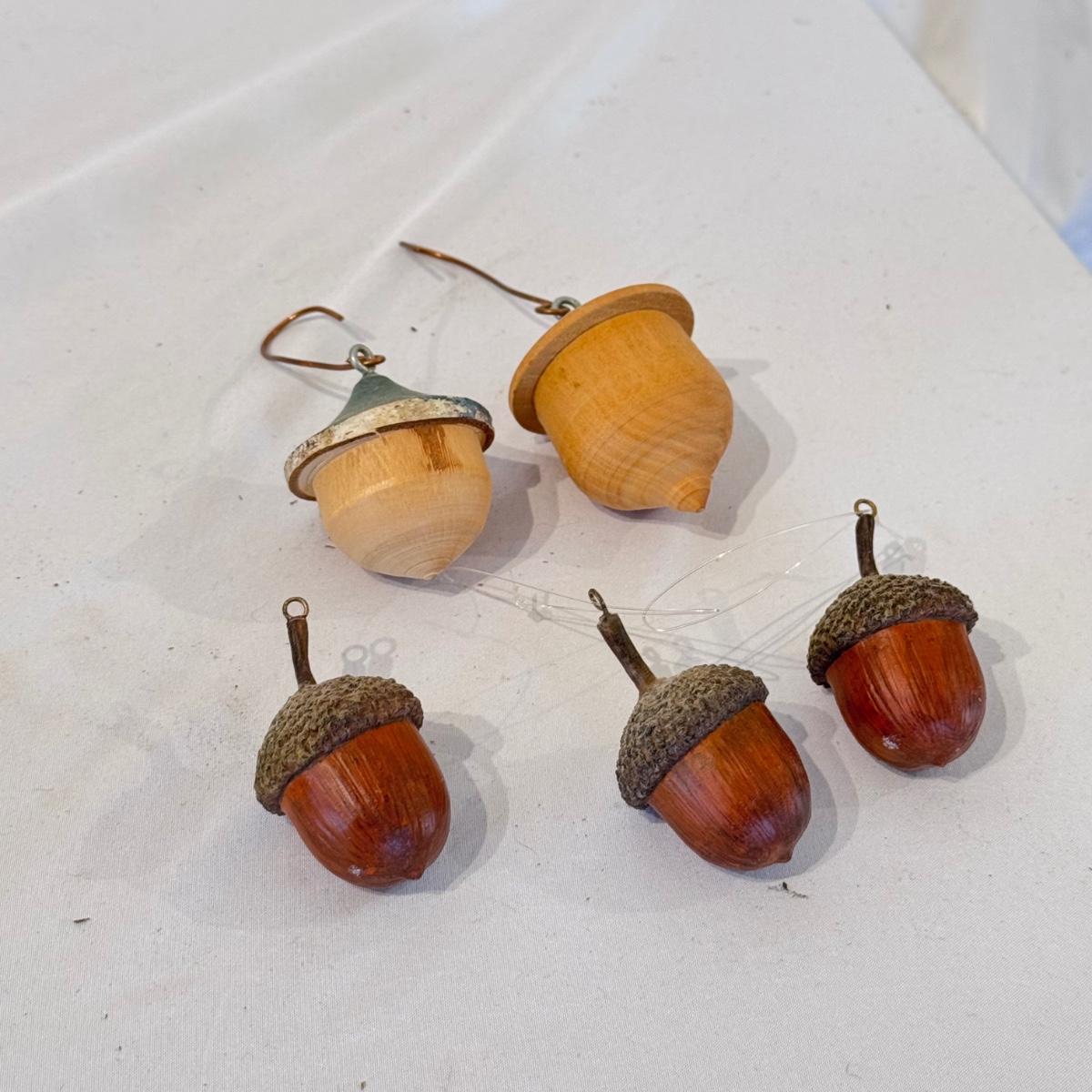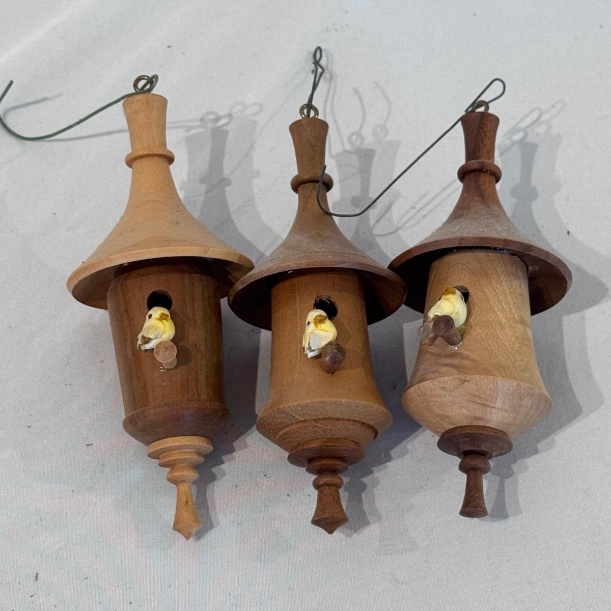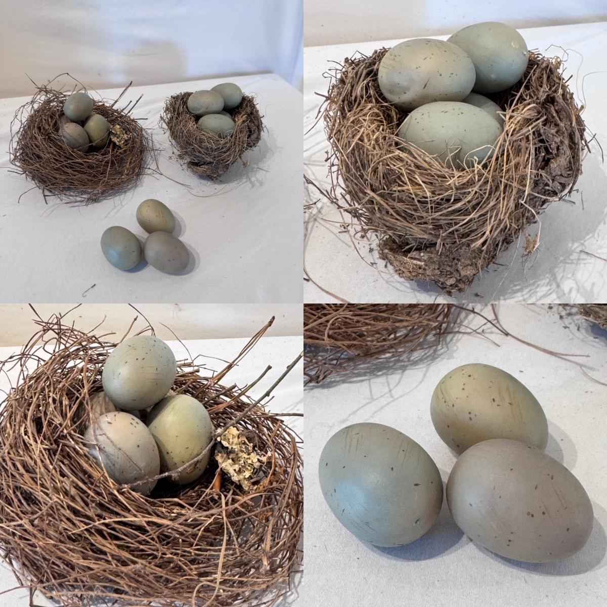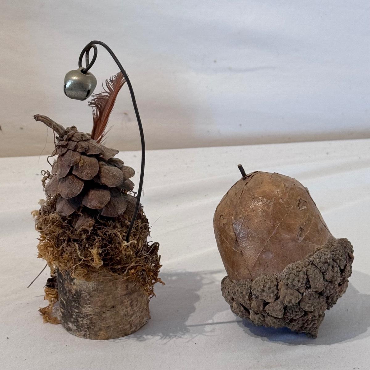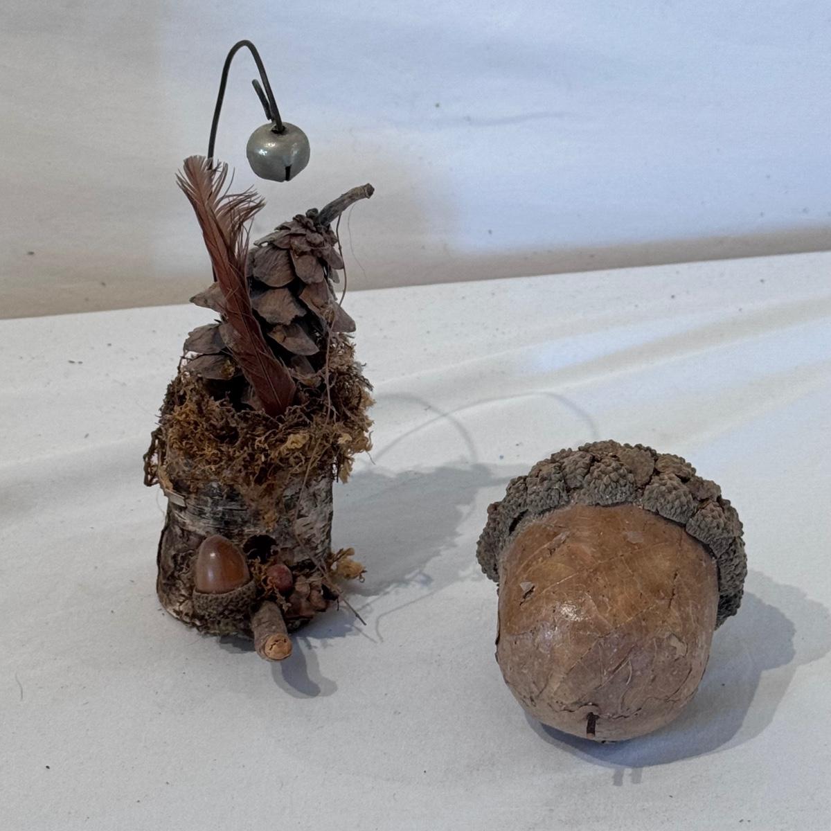 This lot includes one large hornet’s nest hive, a couple Robin nests with eggs, a wood carved fairy, three house ornaments made of wood and mushrooms, three birdhouse ornaments, and more. The birdhouse ornaments are signed with C. Gibson. Also included in this lot are five wooden acorn ornaments, two painted squash, and so much more. See pictures for all items included. The hornet’s hive is the largest item that measures 40” x 11” x 10”H. Local pickup only.