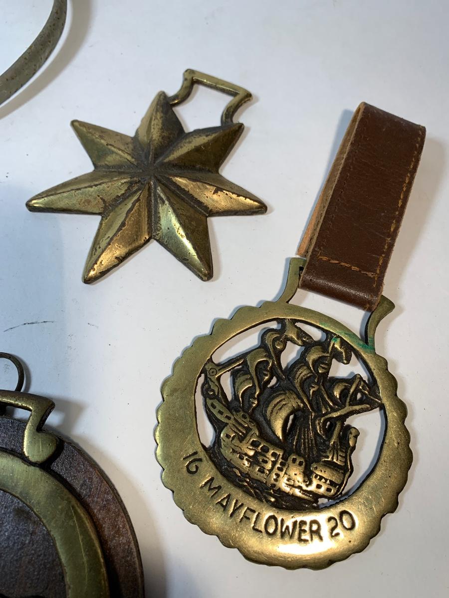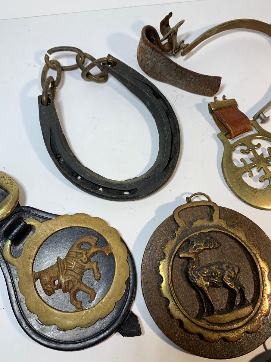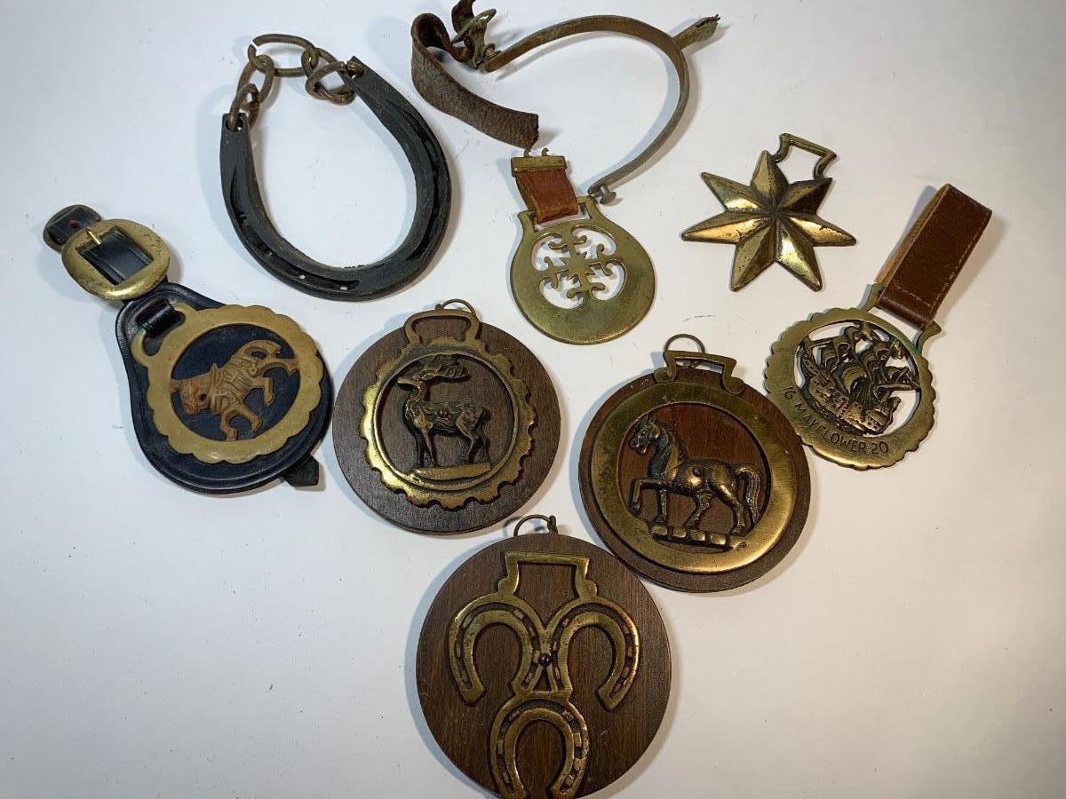 7 old horse brasses a stirrup and a lucky horseshoe