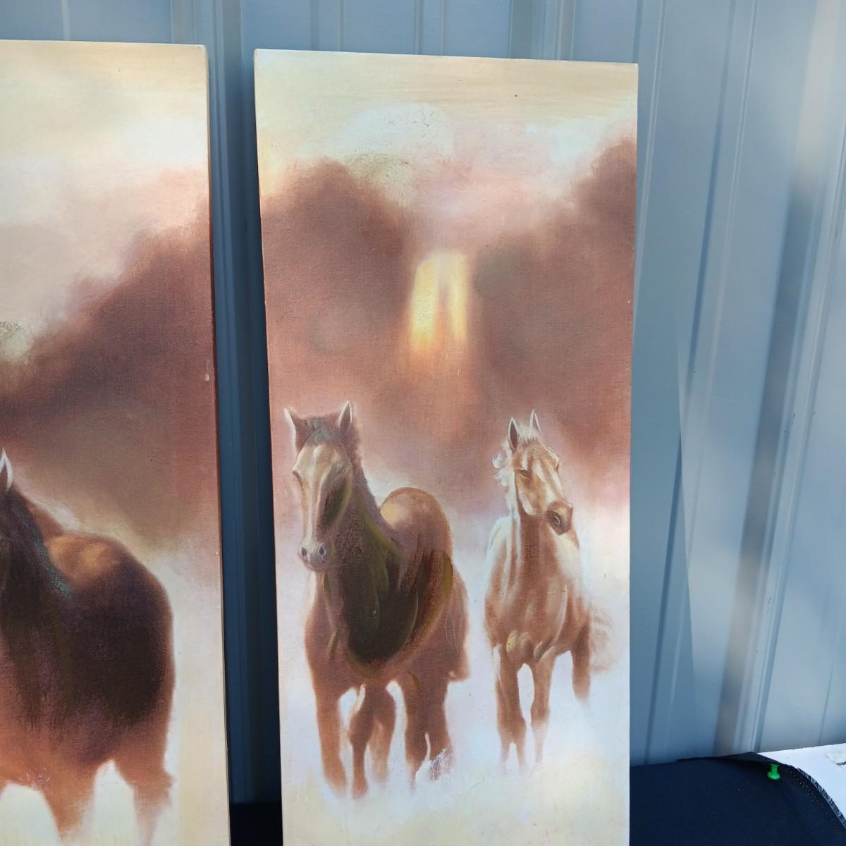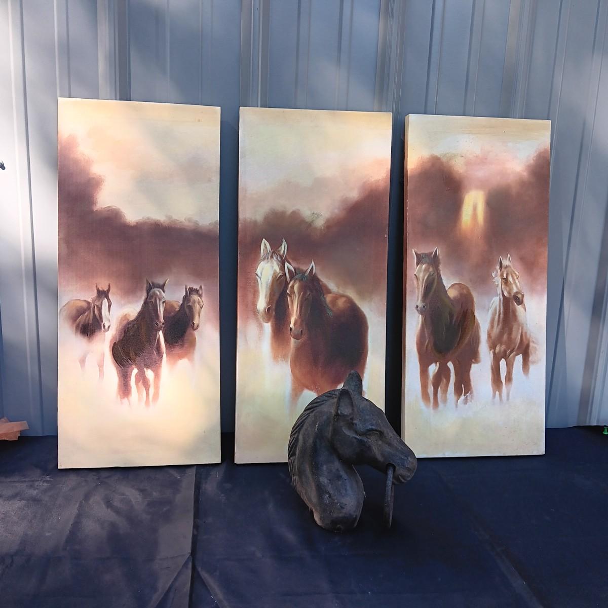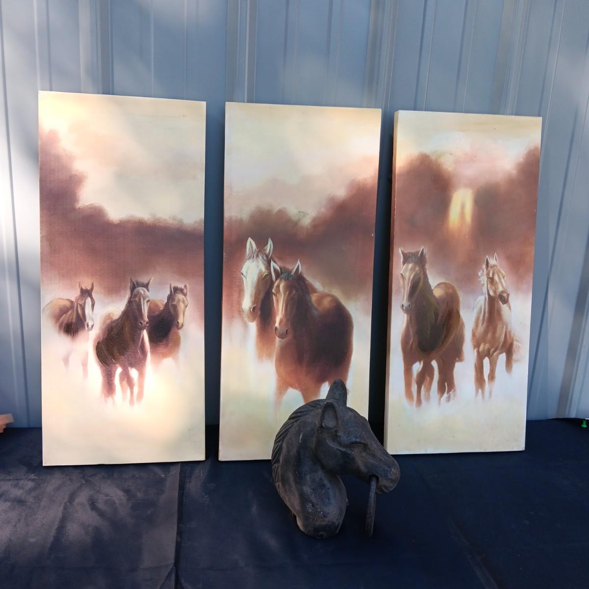 HORSE CANVAS PICTURES STRETCHED ON WOOD FRAMES AND A CAST IRON HORSE HEAD POLE TOPPER