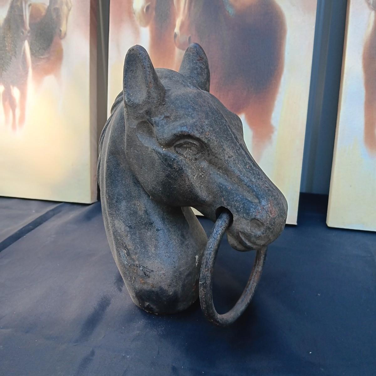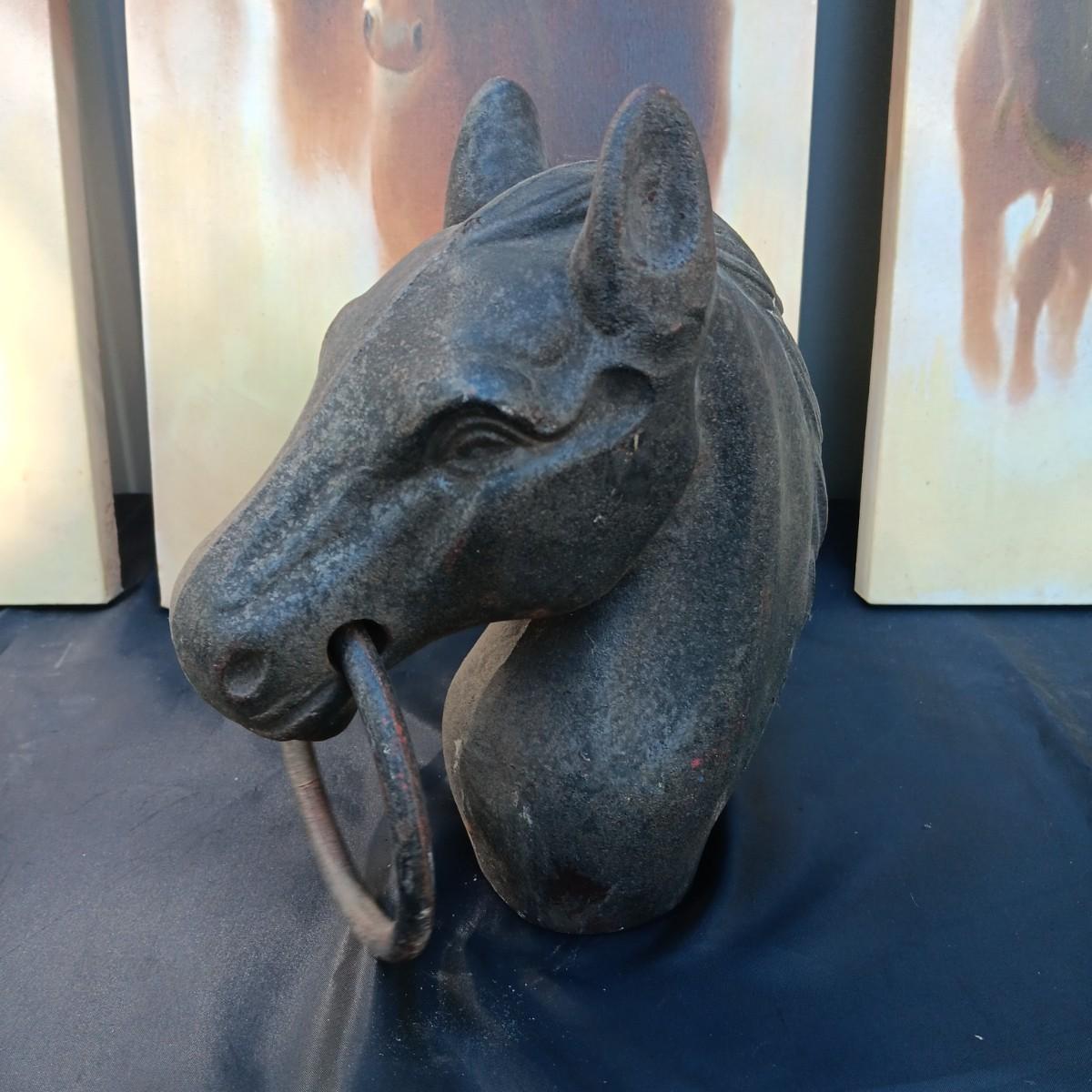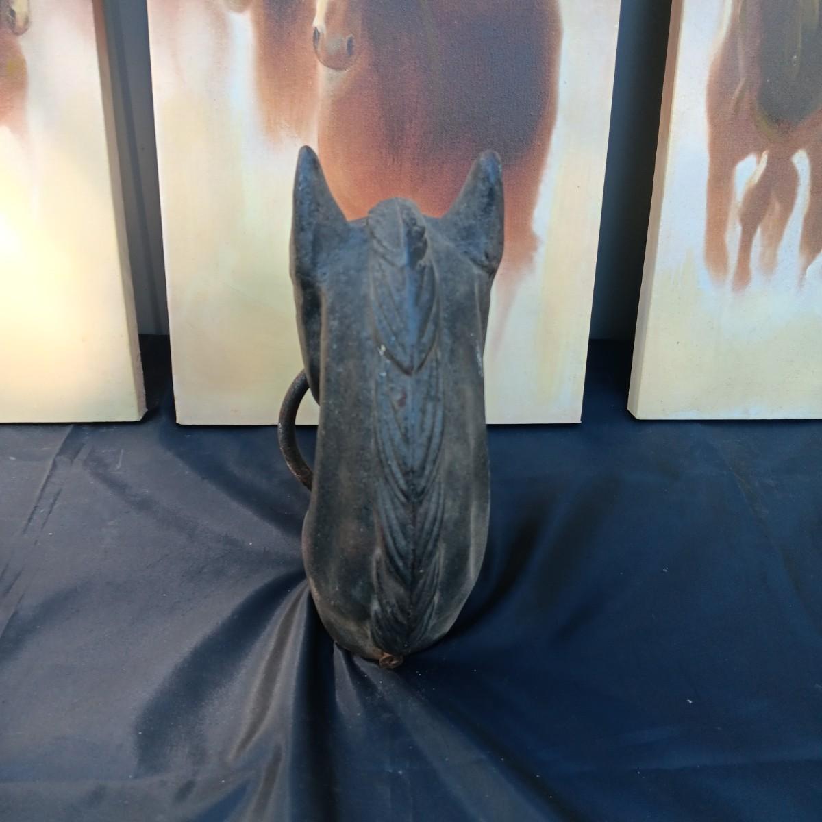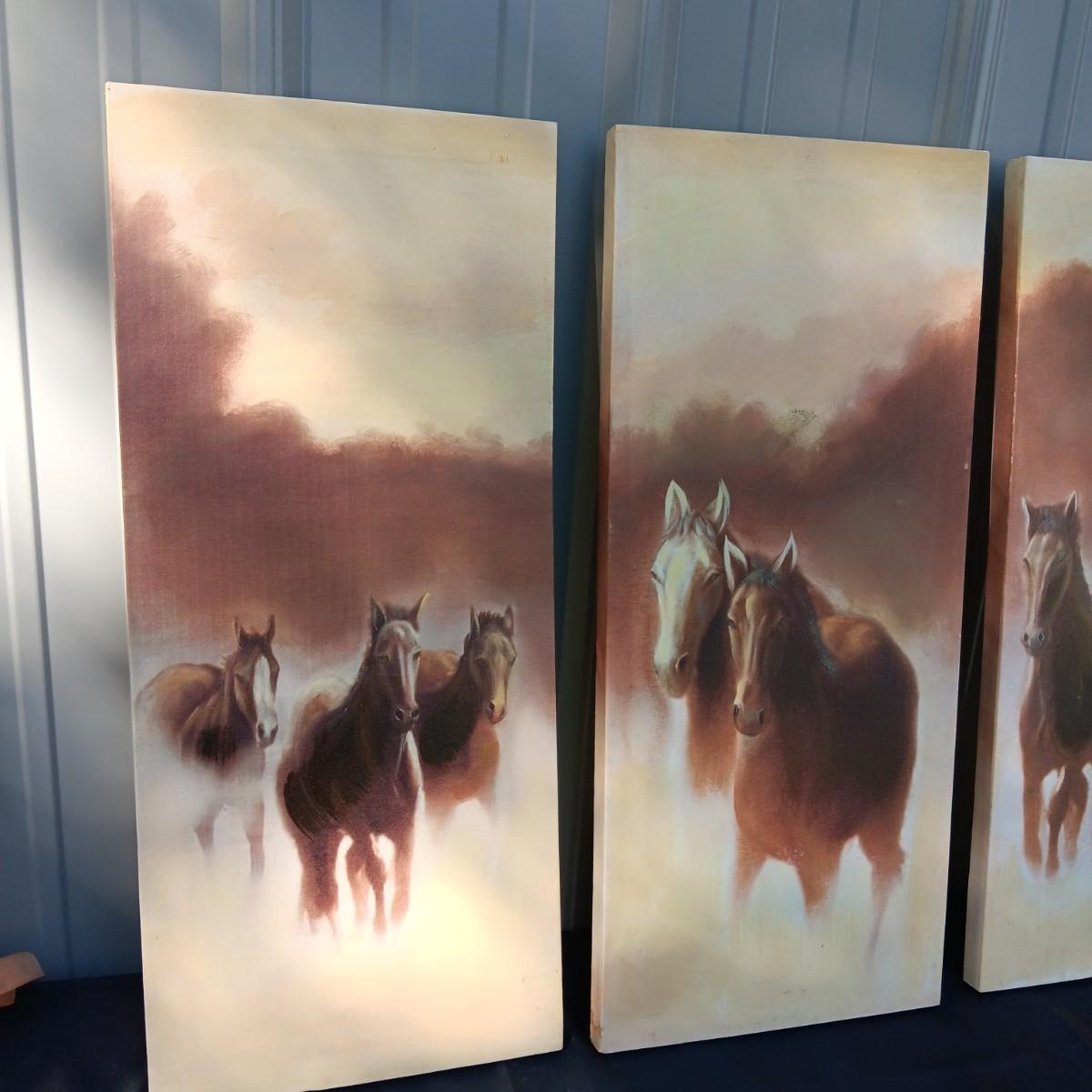 HORSE CANVAS PICTURES STRETCHED ON WOOD FRAMES AND A CAST IRON HORSE HEAD POLE TOPPER