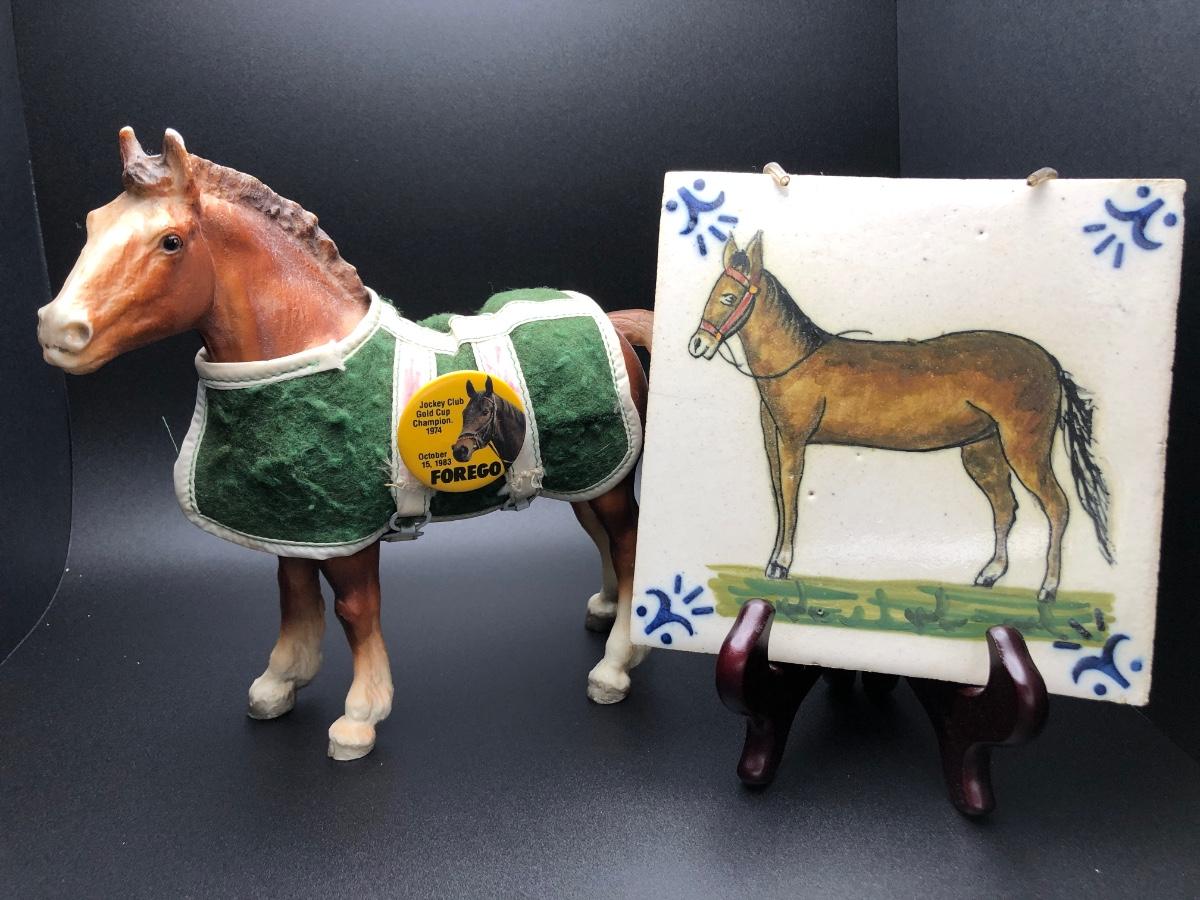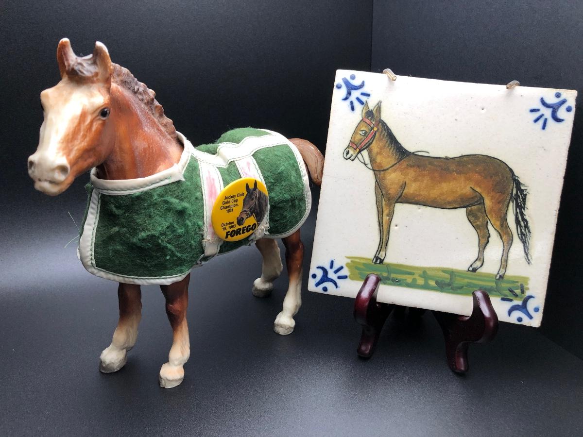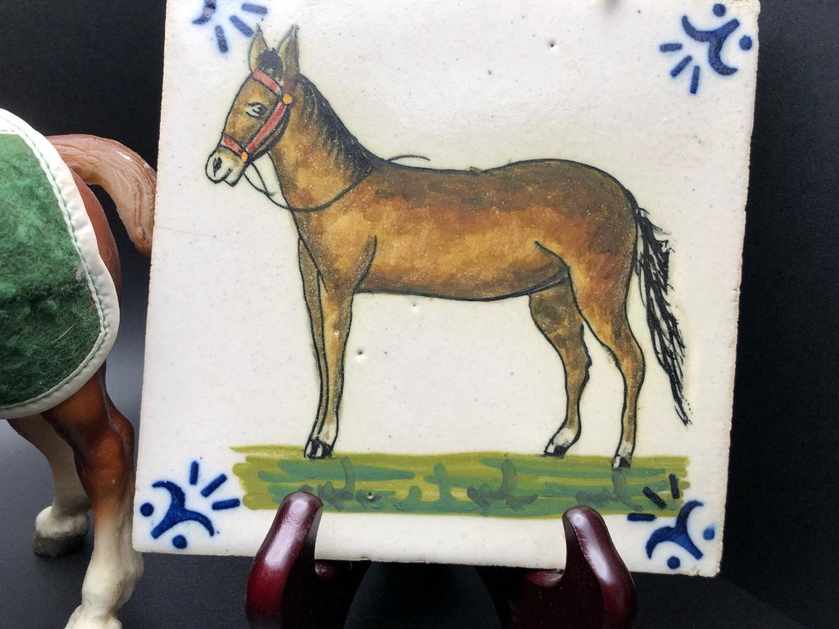 Horse Collectors Lot; Ceramic Tile, Horse Figurine & Pin