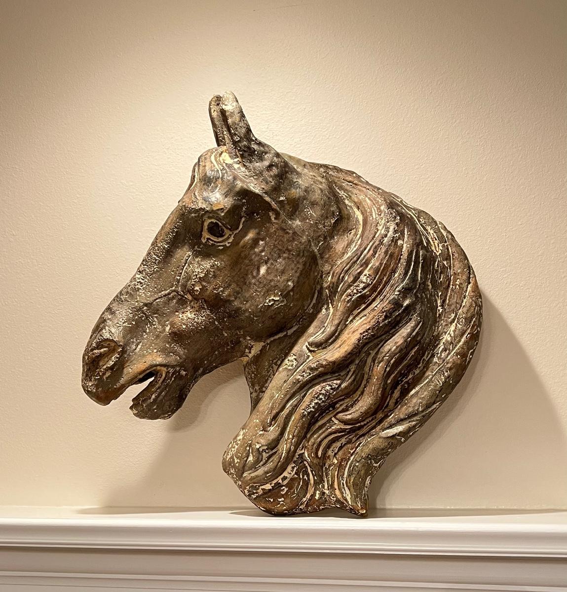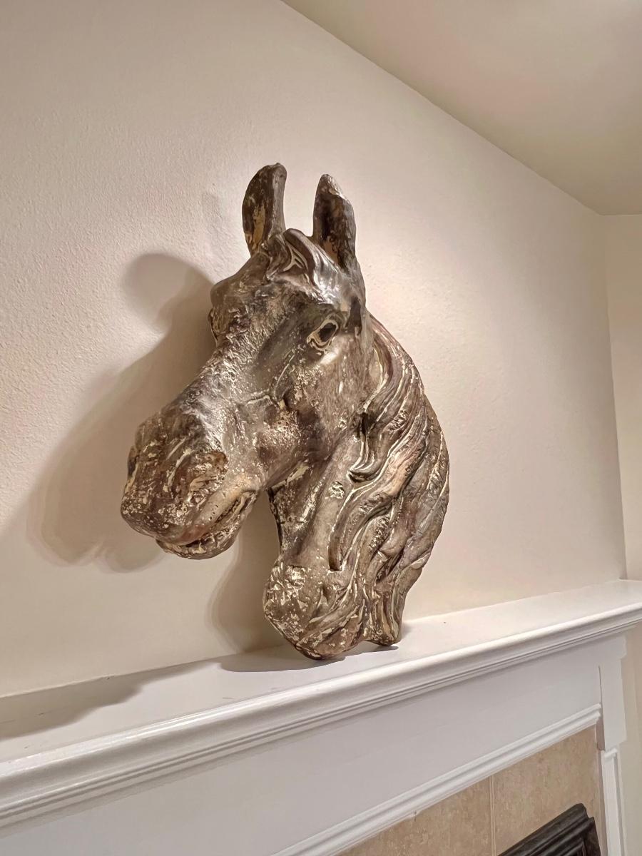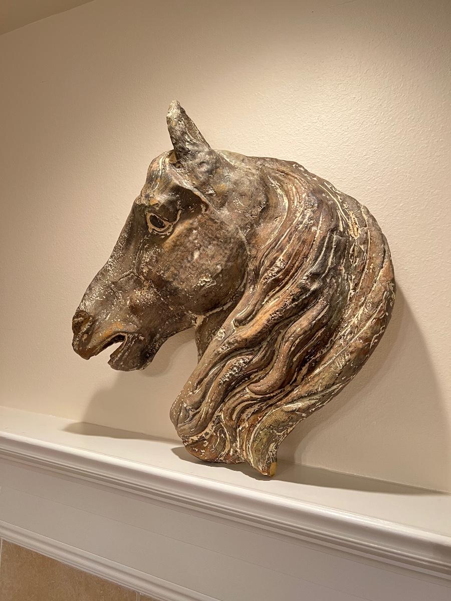Amazing horse head is Made of Styrofoam and is very lightweight. Has a small piece of Styrofoam missing that can easily be camouflaged with a little paint. See Photos