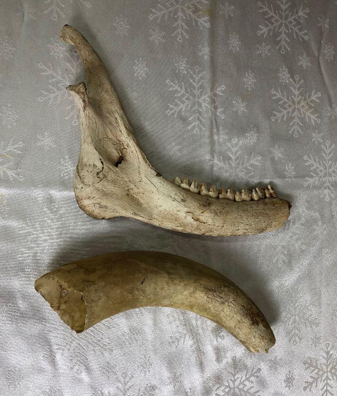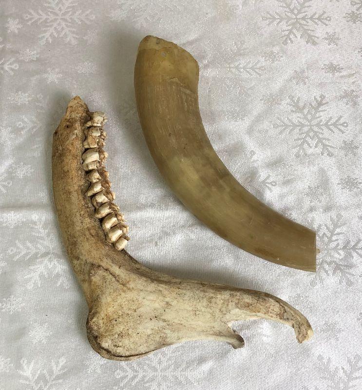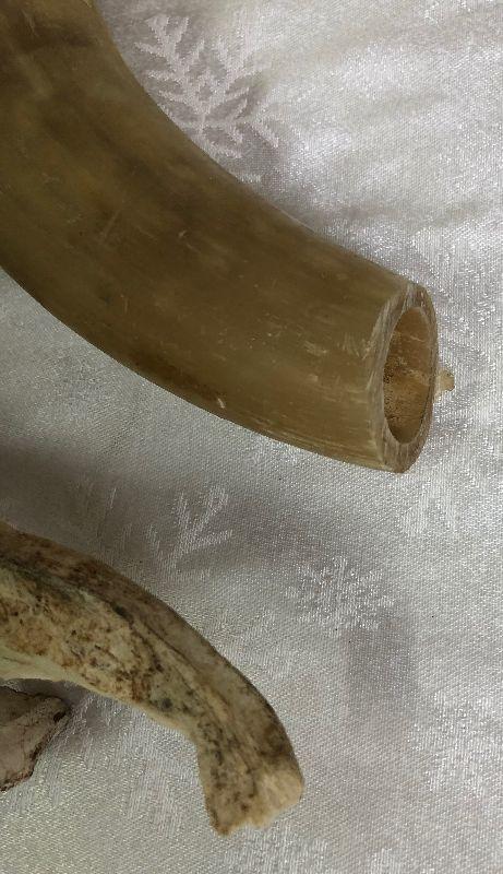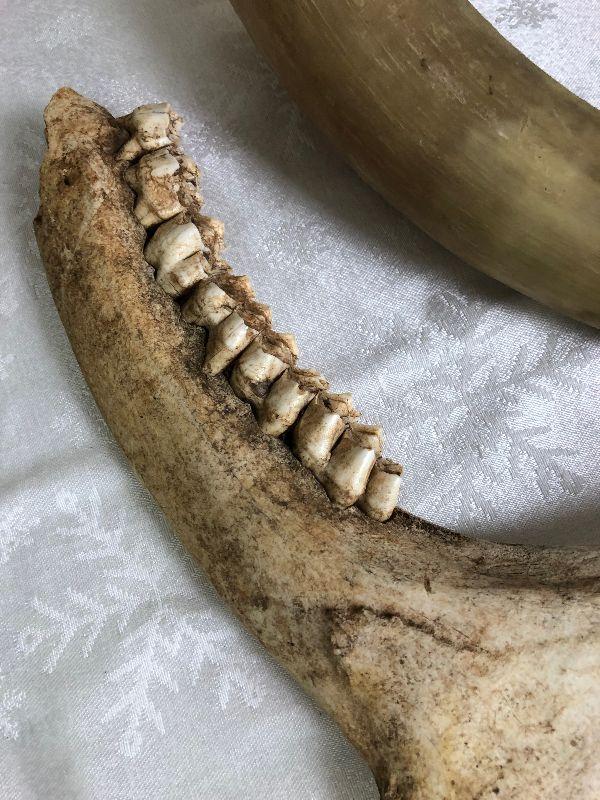 As shown here is an antique horse's jawbone and a cow's horn...