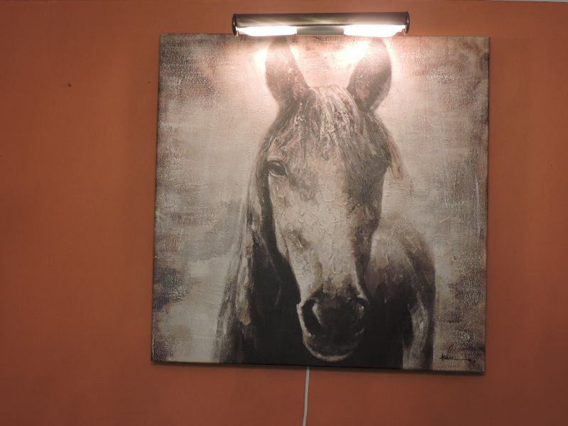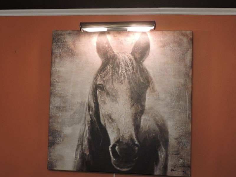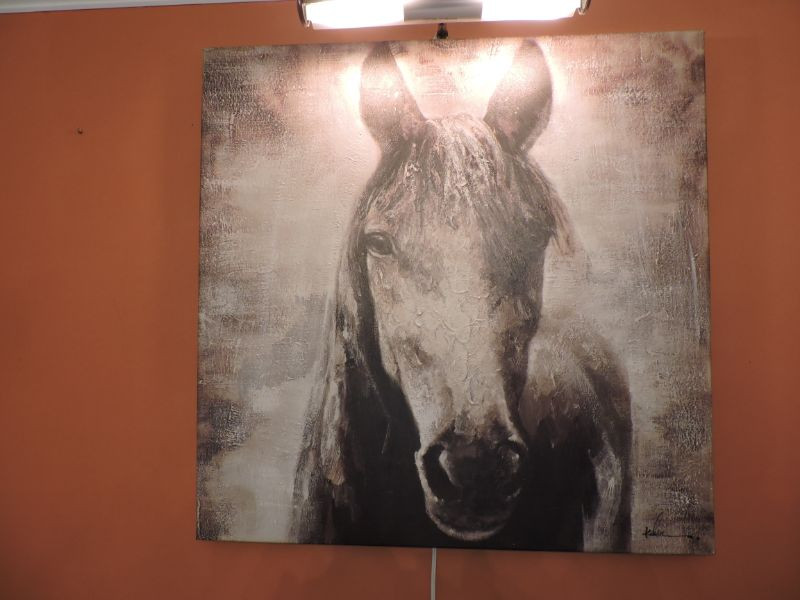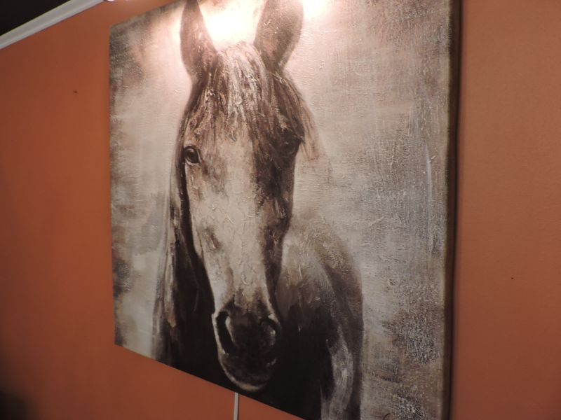 Beautiful hand-painted and signed oil on canvas. The horse is beautifully captured monotone. Would be a stunning addition to any art collection. 28”x28”x1.5”. Gallery light not included.