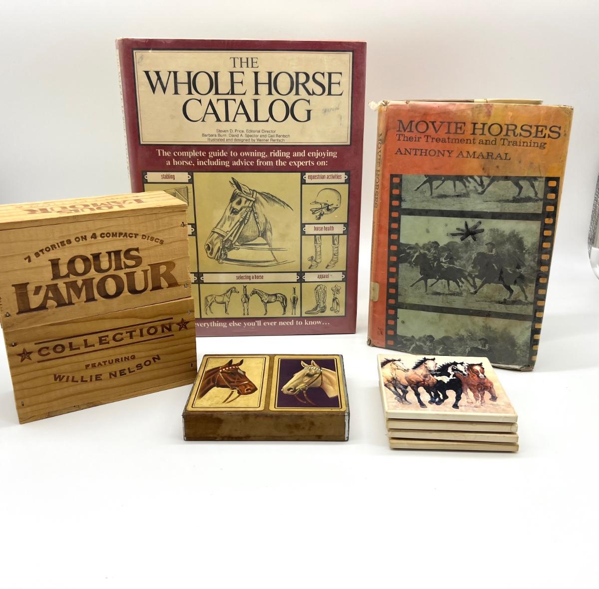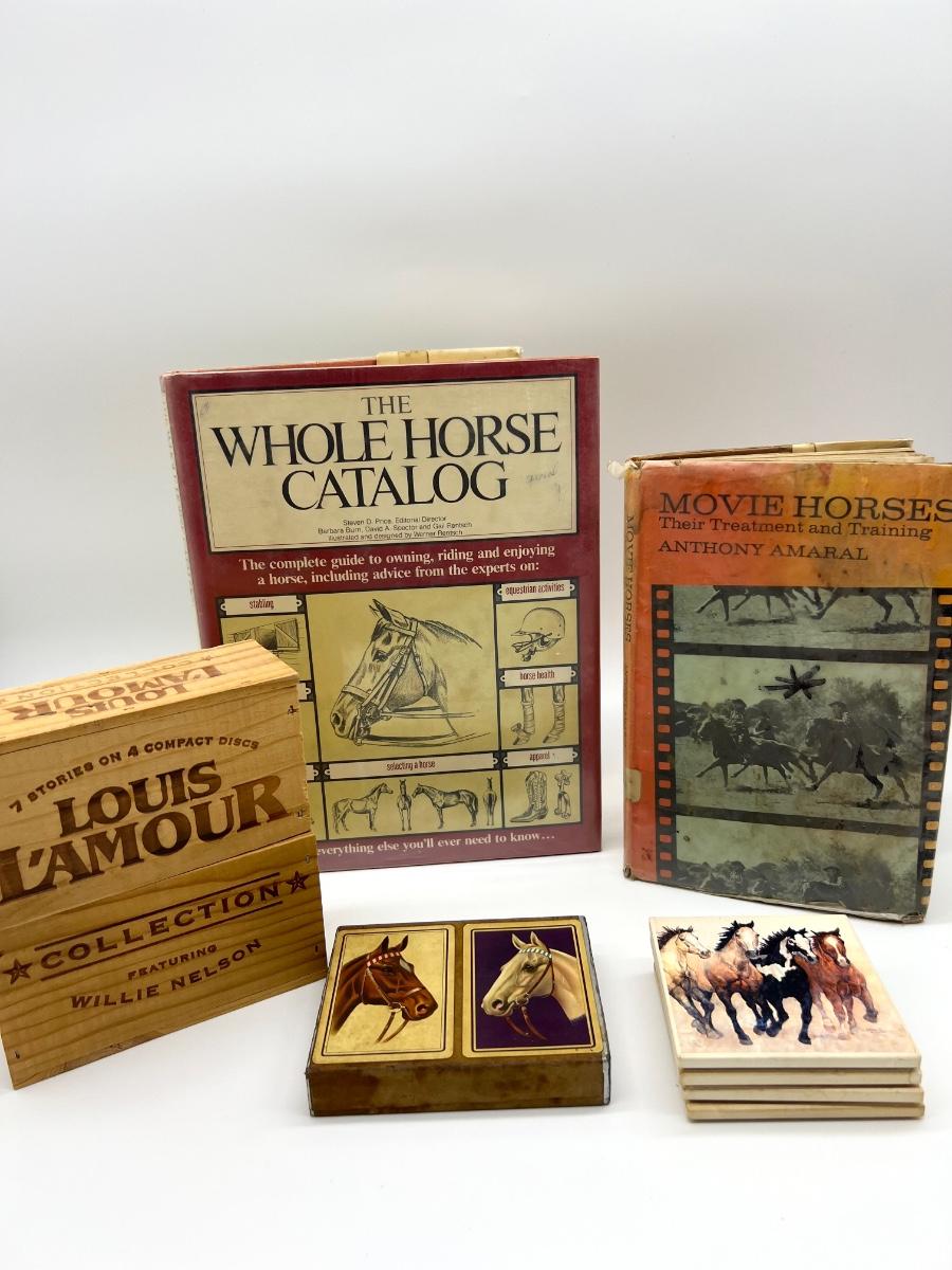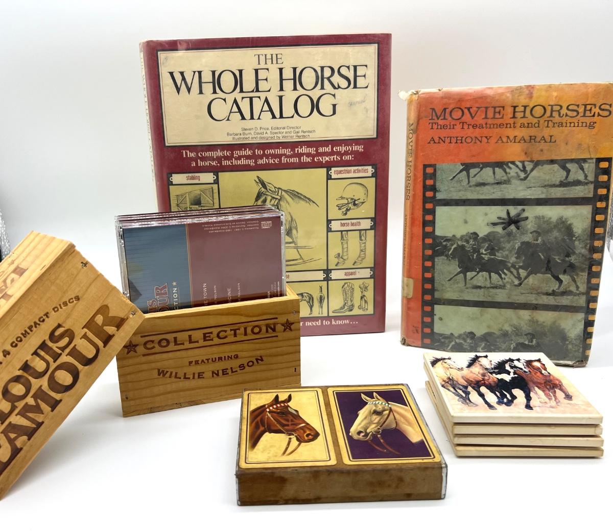 Horse Lot & CD Collection featuring Willie Nelson. Also, Includes vintage book, The Whole Horse Catalog. Vintage book, Movie Horses. Set of horse playing cards, 4 horse coasters, and Willie Nelson CD Set.