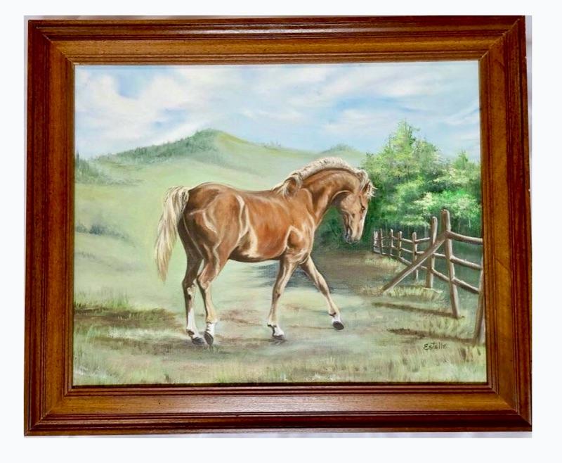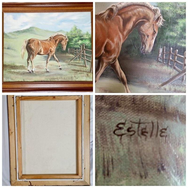 Lovely oil painting in wood frame. In very nice condition. Signed "Estelle"