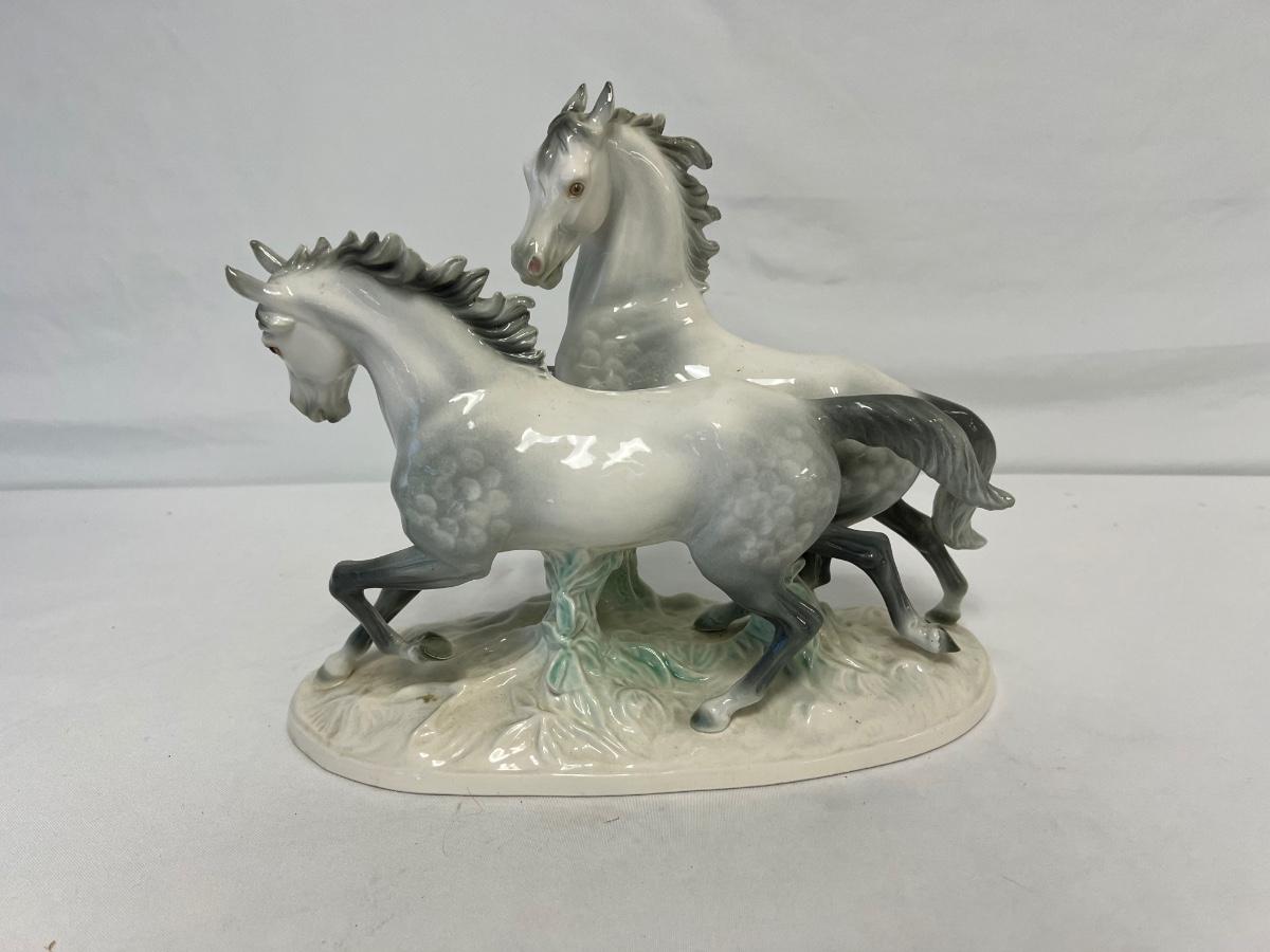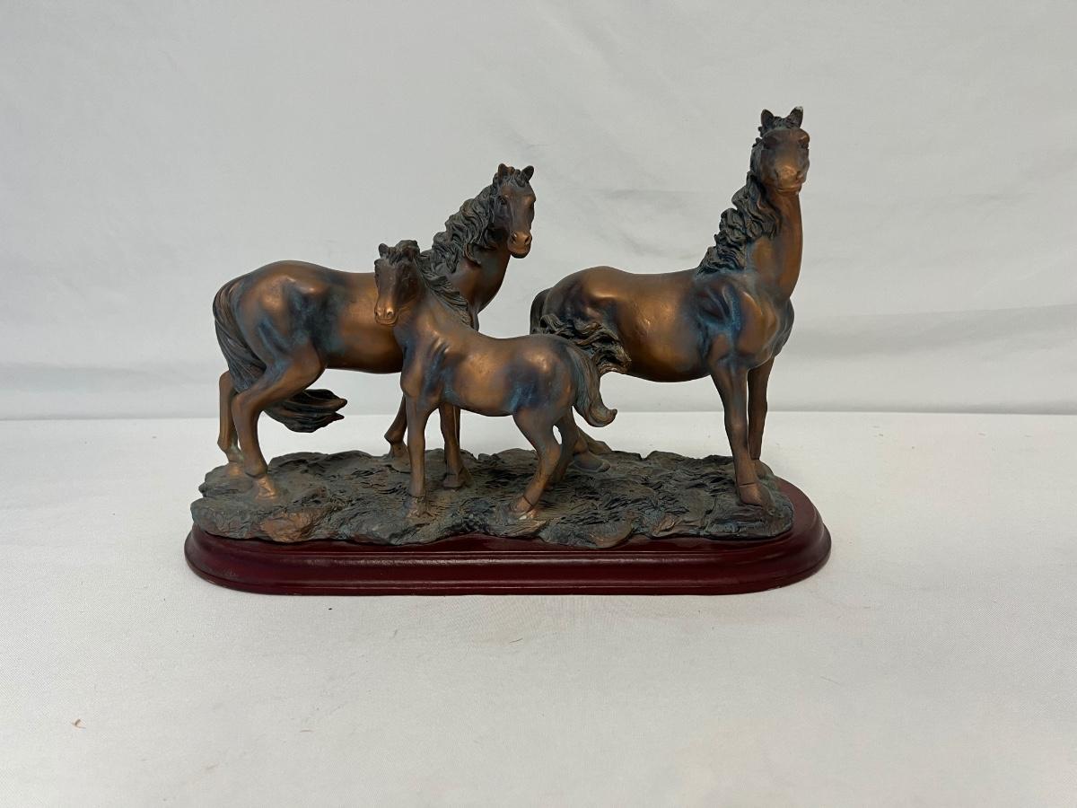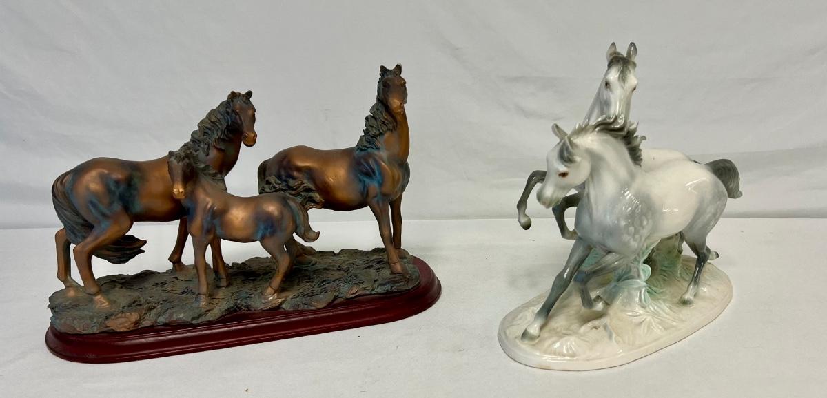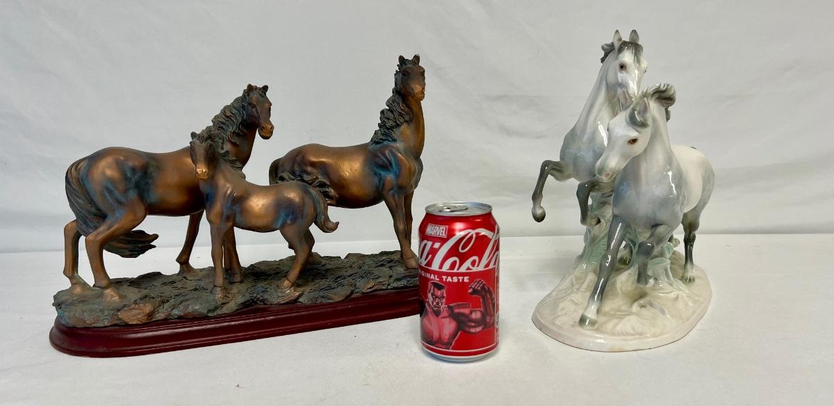 The copper colored statue is believed to be resin, and the other is ceramic. No obvious chips or cracks. Measurement of largest: 10.5"H. [ML]