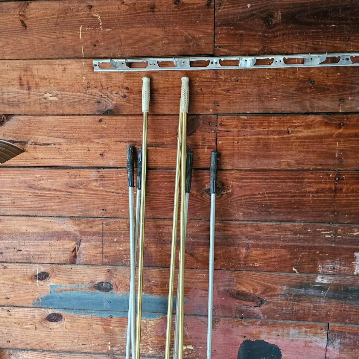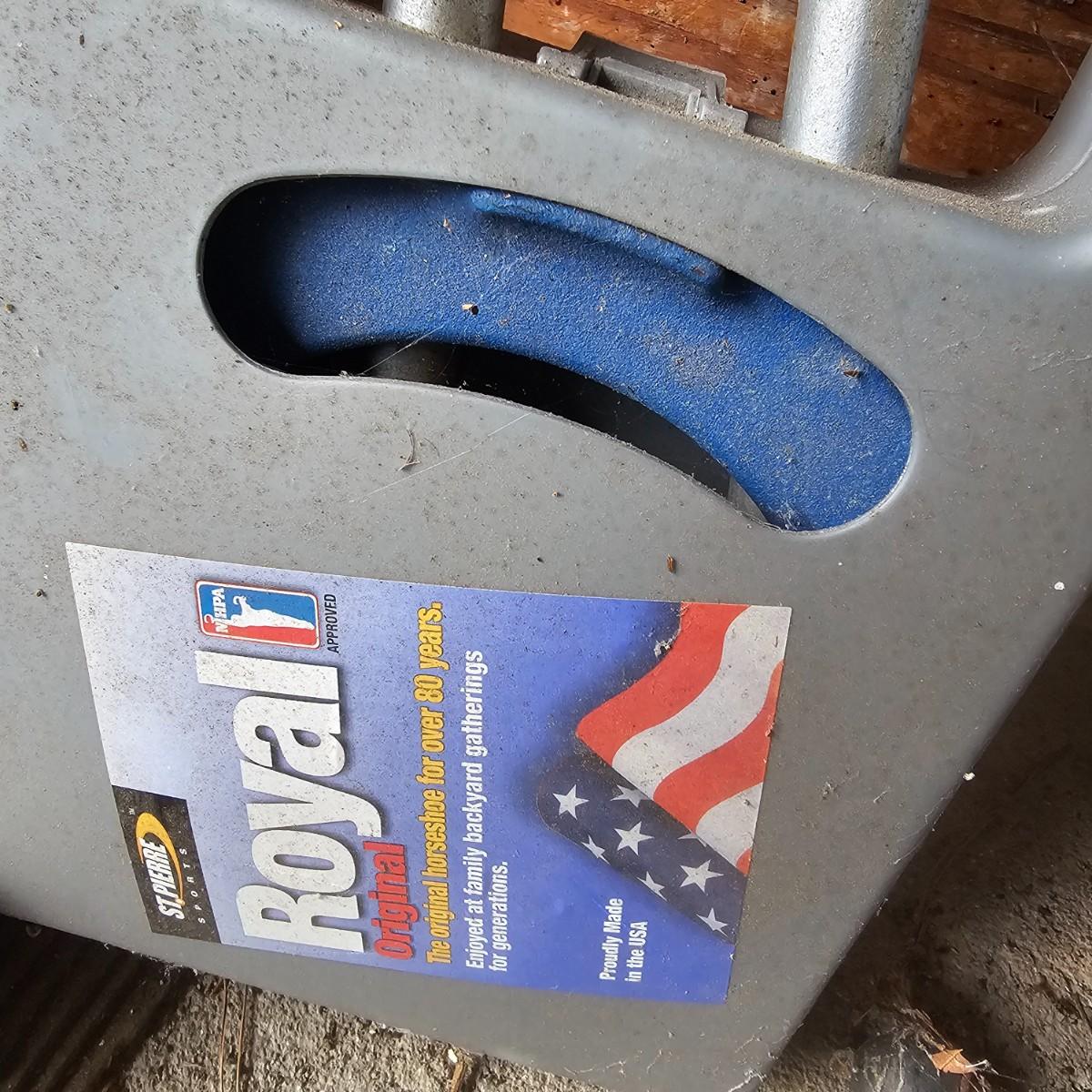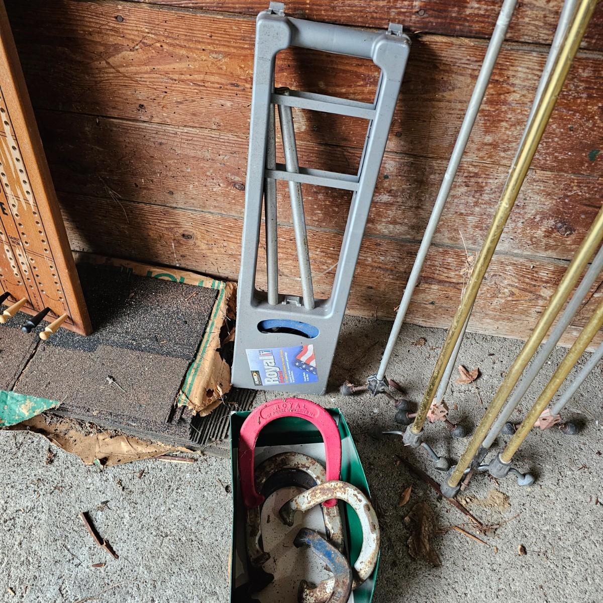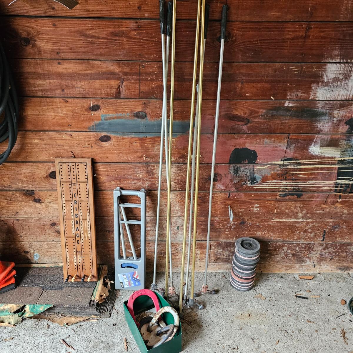 Full set of horseshoe equipment including stakes and iron shoes. Extra large size cribbage board, 8" x 31"H plus four scoring pegs. Six aluminum shuffleboard sticks plus the discs to go with. Sticks measure 64" and 74" H. All items used. See photos for details. Local pickup only.