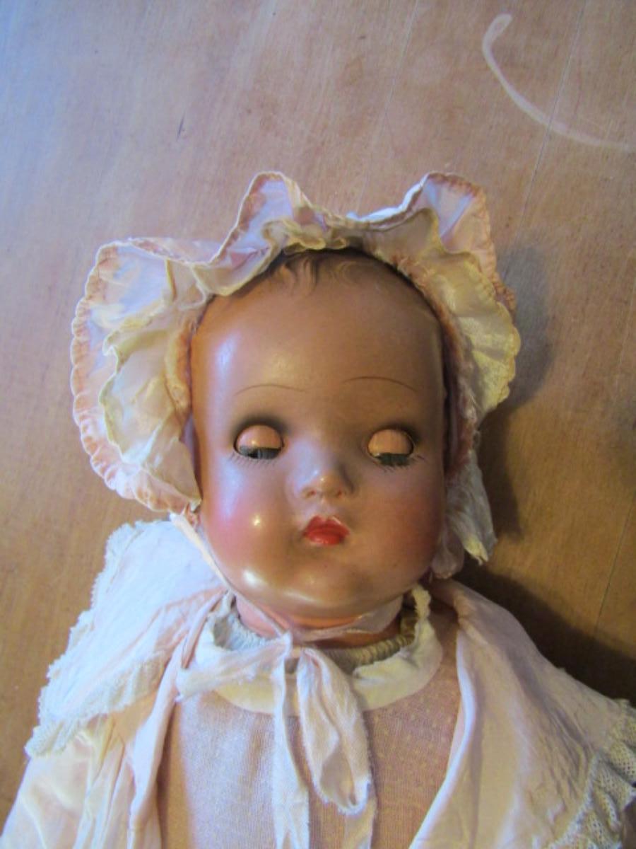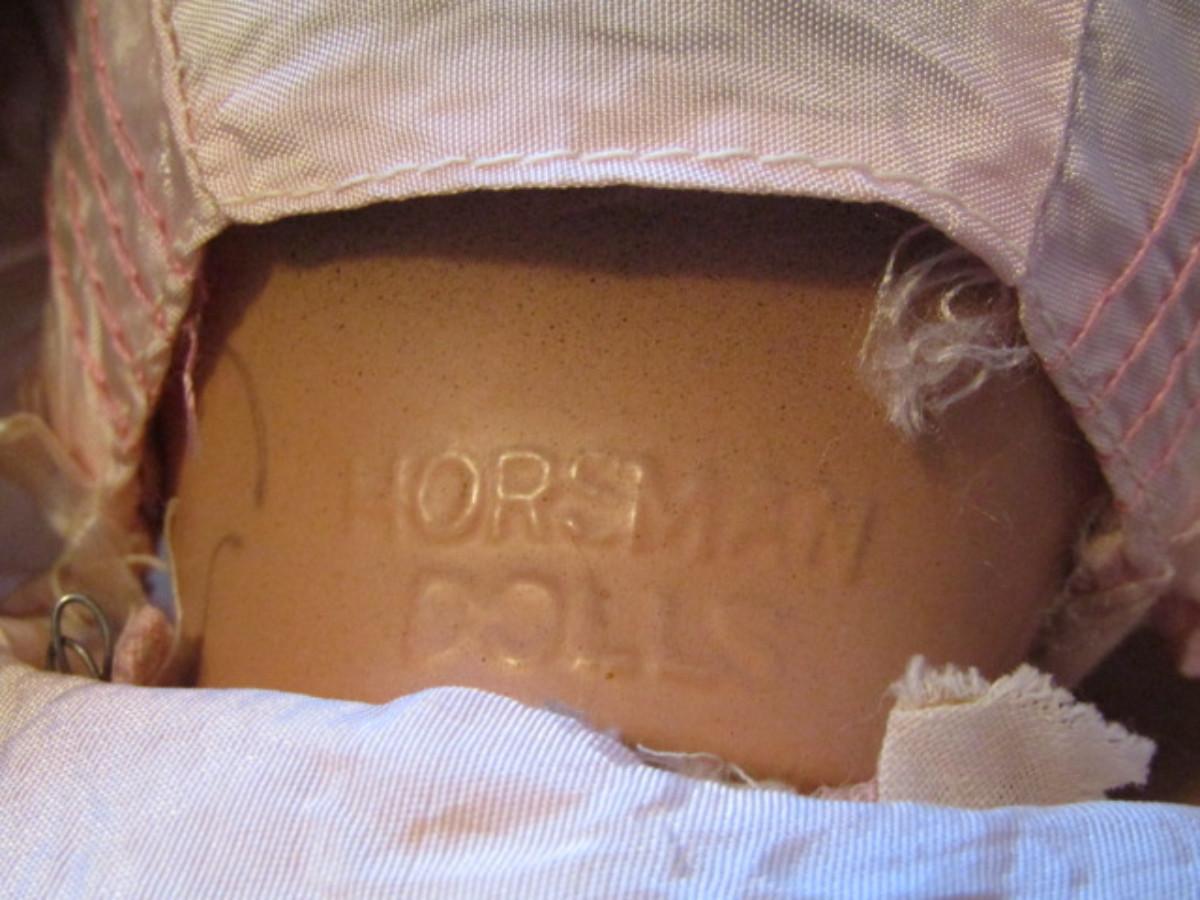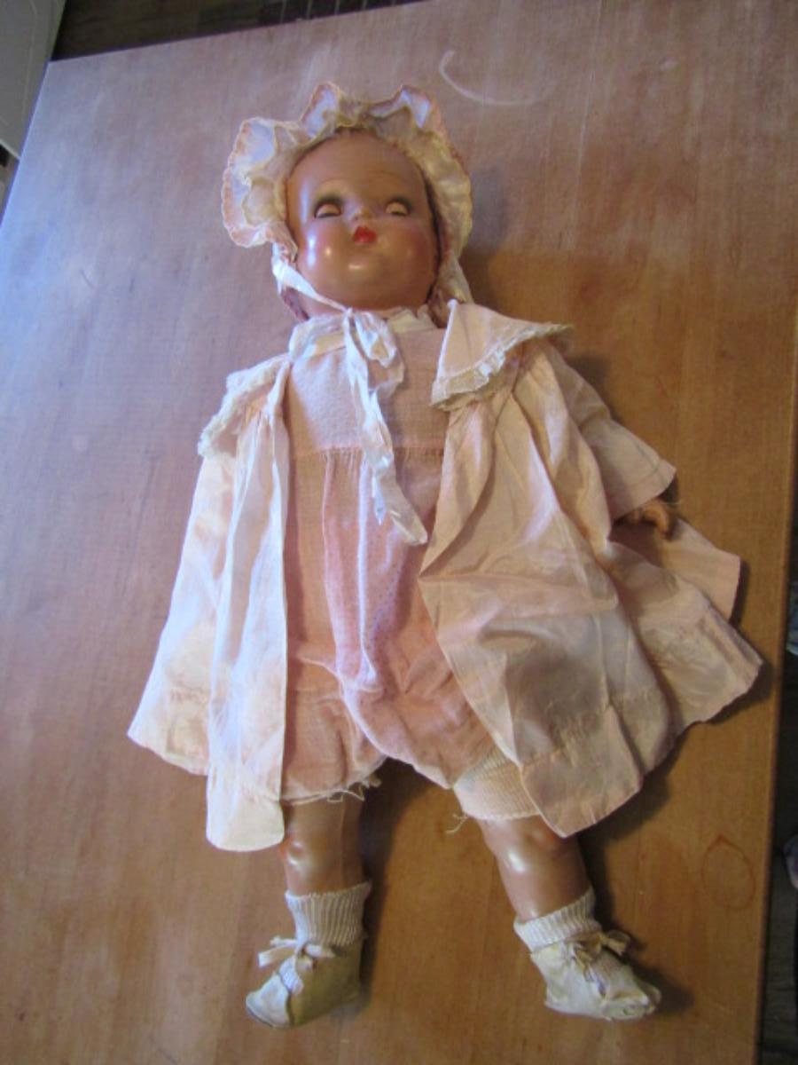 Horsman Doll- 18 Inch. Combination fabric and plastic body. Eyes open and close.