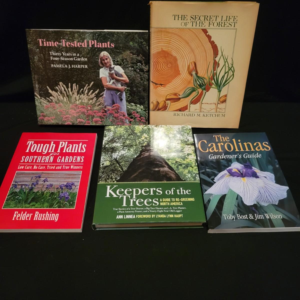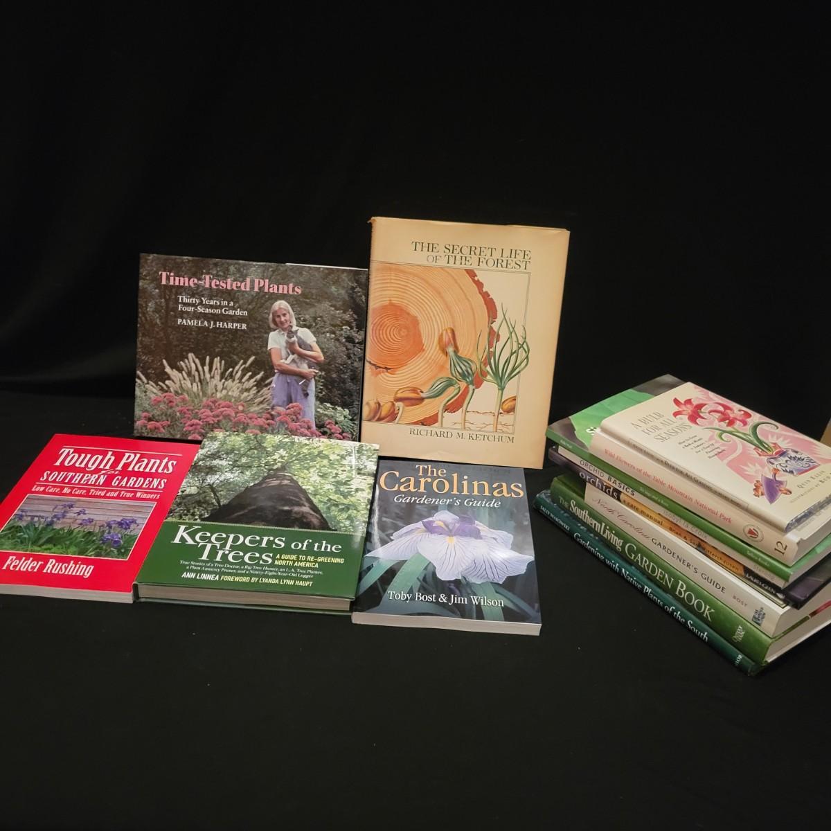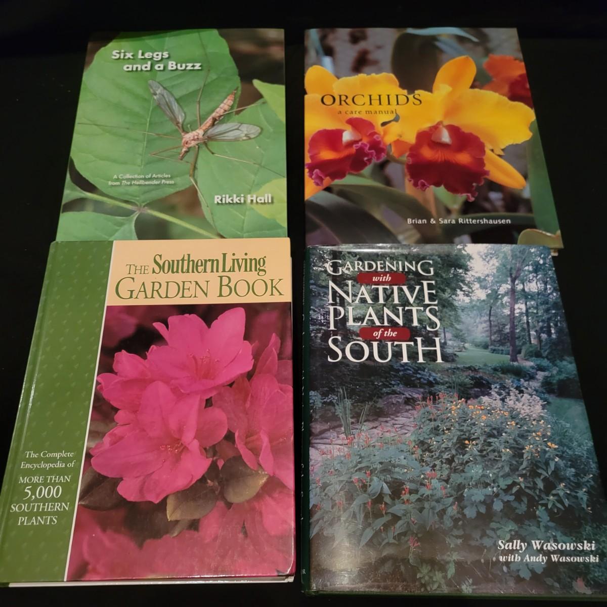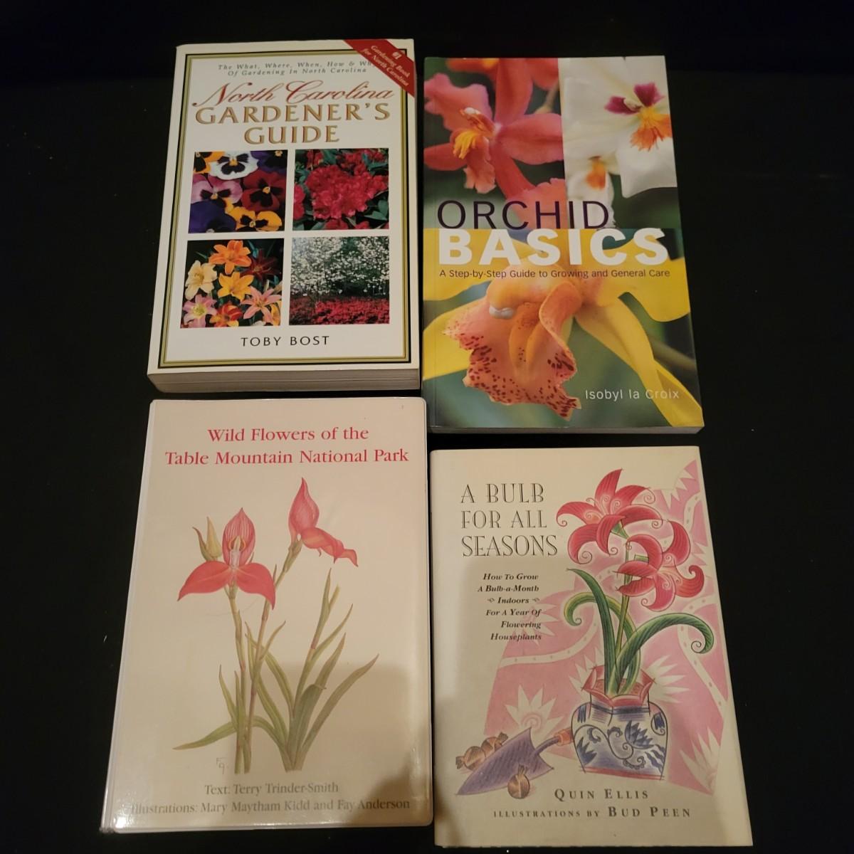 A dozen books on various types of horticultural interests. Subject matter ranges from native NC gardening to books about orchids. Shipping available.