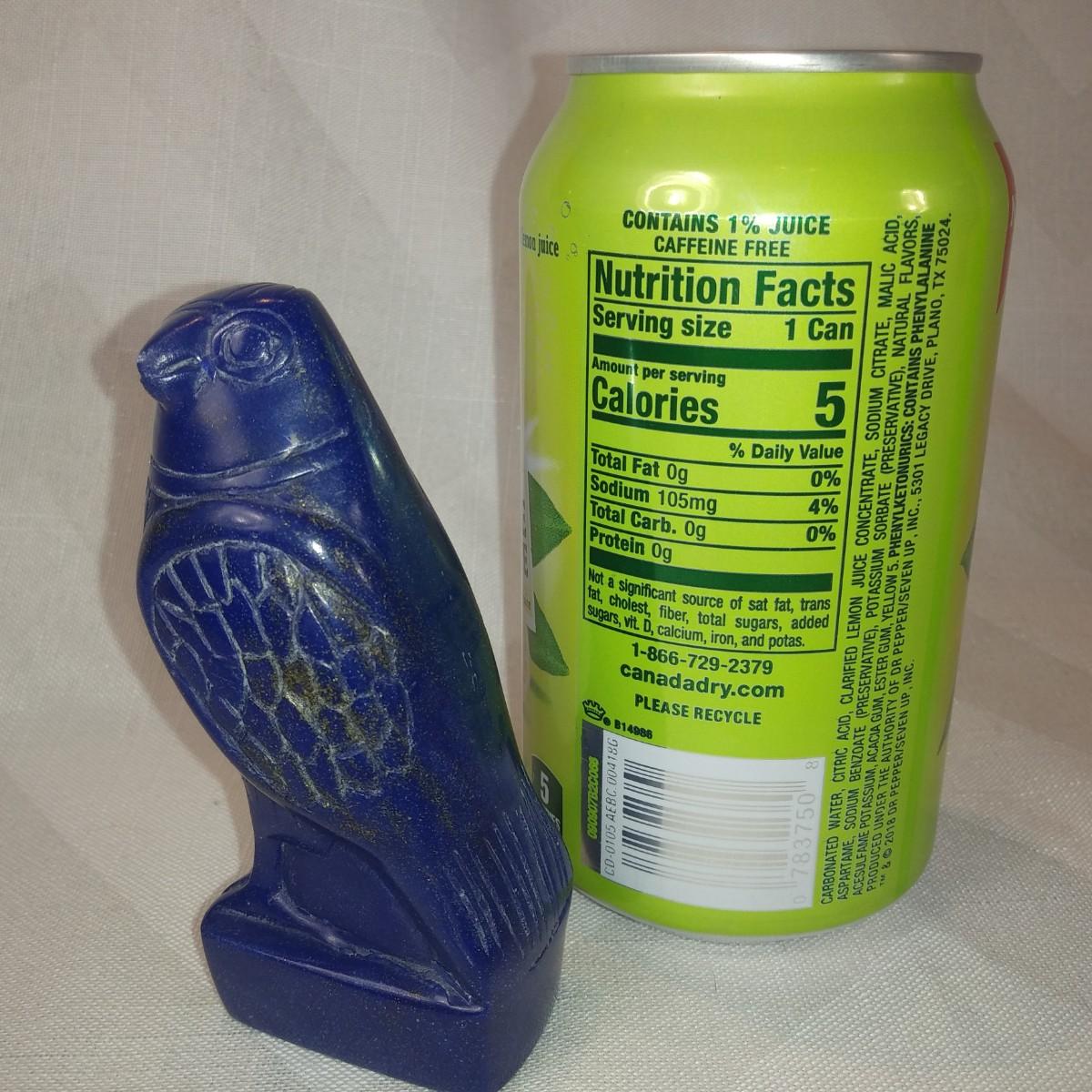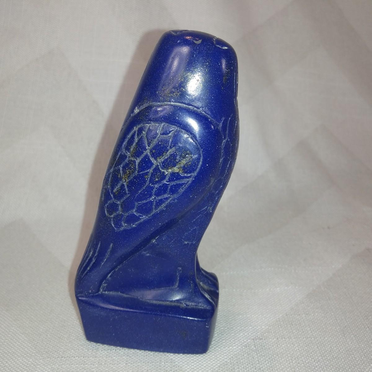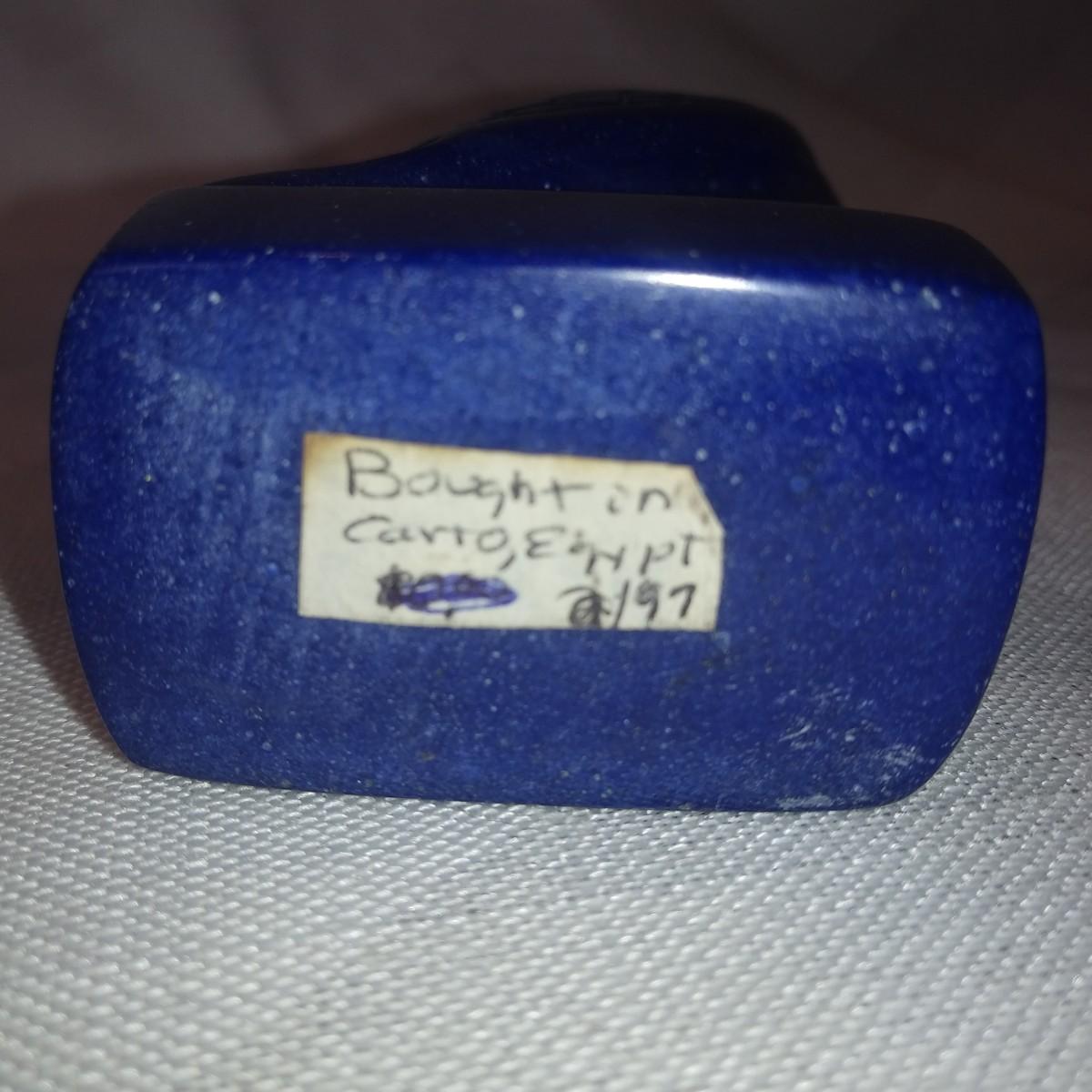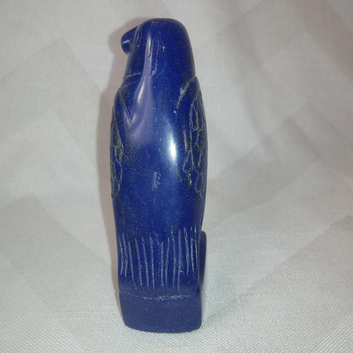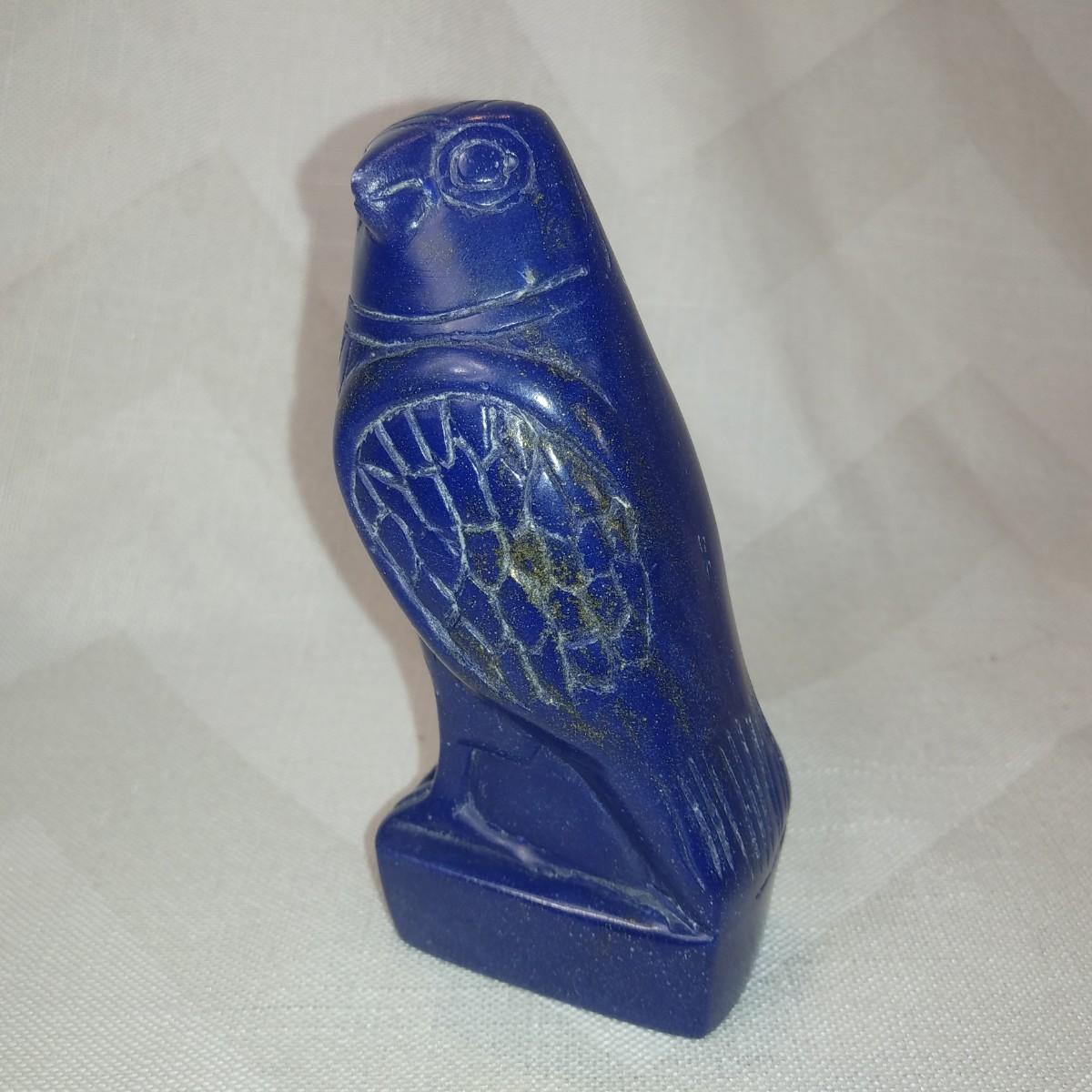 This auction lot is for what looks to be a hand-carved unknown blue stone depicting the Egyptian God "Horus" (Falcon.) The statue measures about 4-inches tall and is heavy for its size. In very good condition. Horus in Ancient Egyptian, is one of the most significant ancient deities who served many functions, most notably god of kingship and the sky. He was worshiped from at least the late prehistoric Egypt until the Roman Egypt.
