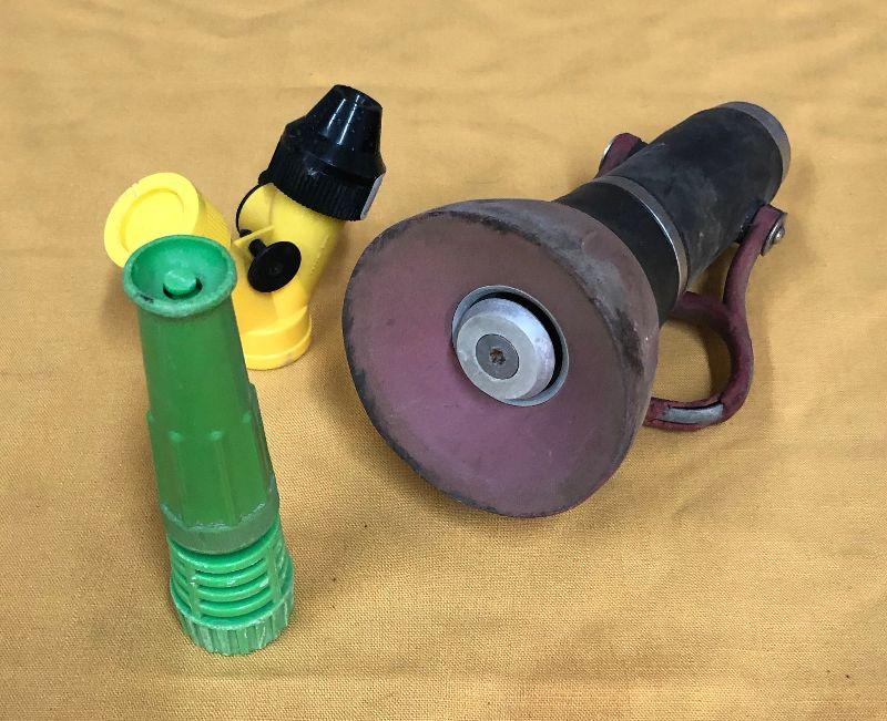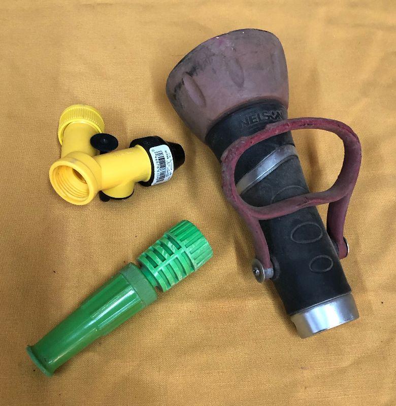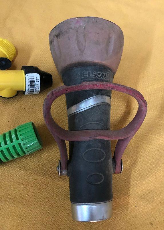Here are a few garden hose nozzle attachments including a large fire hose type spout....Used..