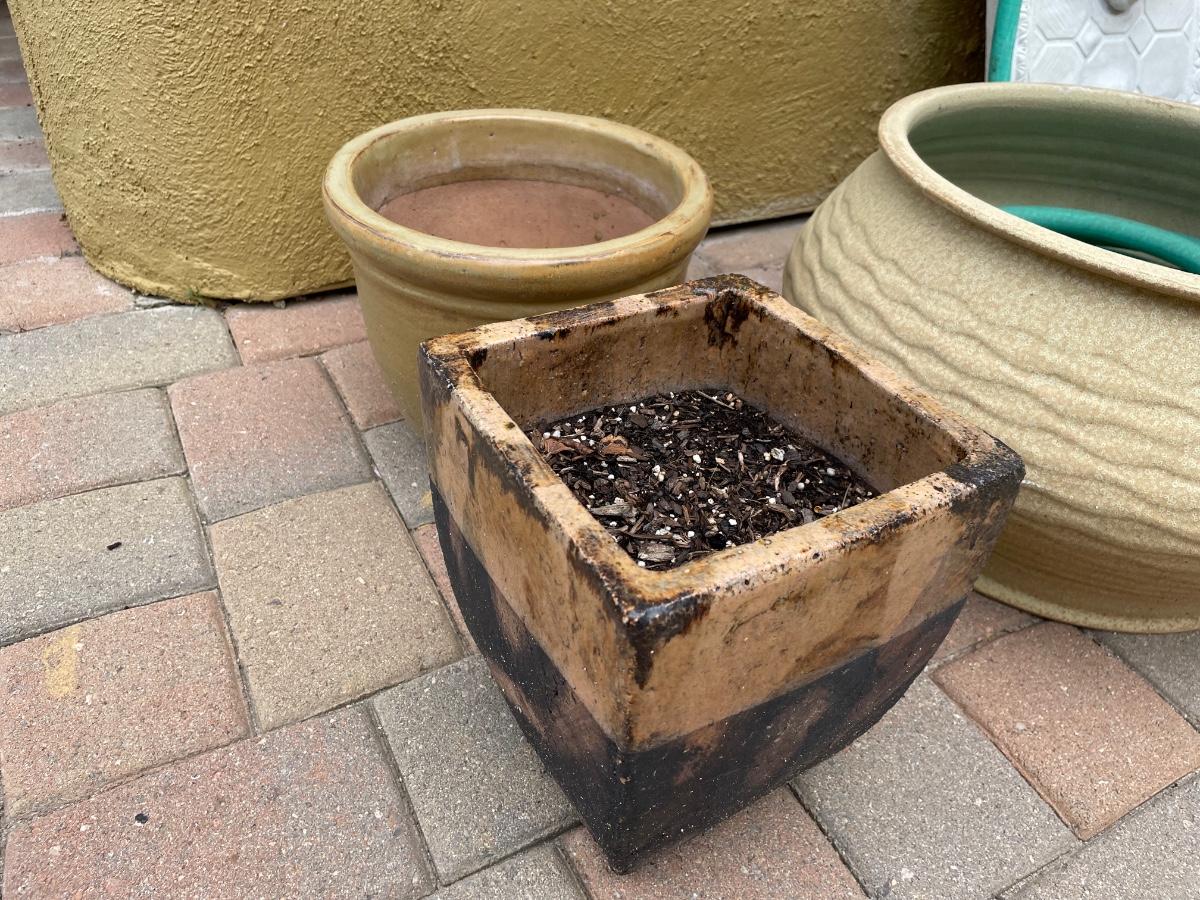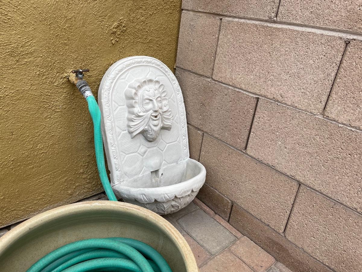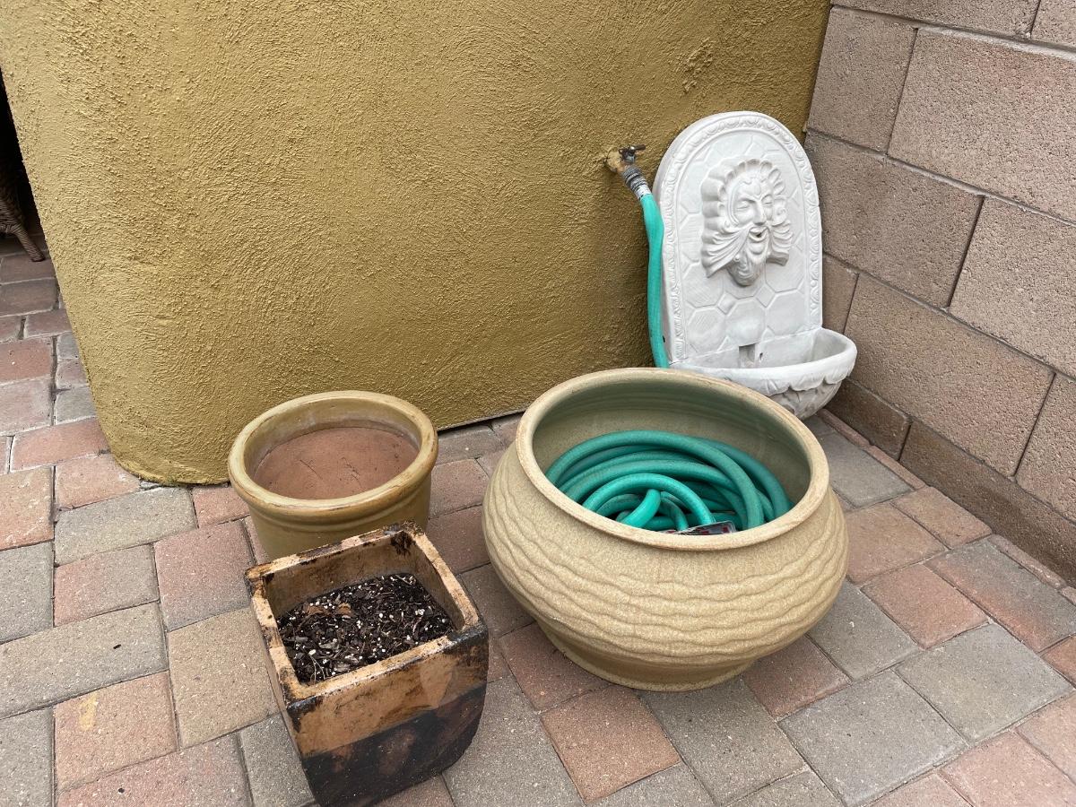 A hose pot (hose not included), two ceramic pots and a ceramic wall fountain
