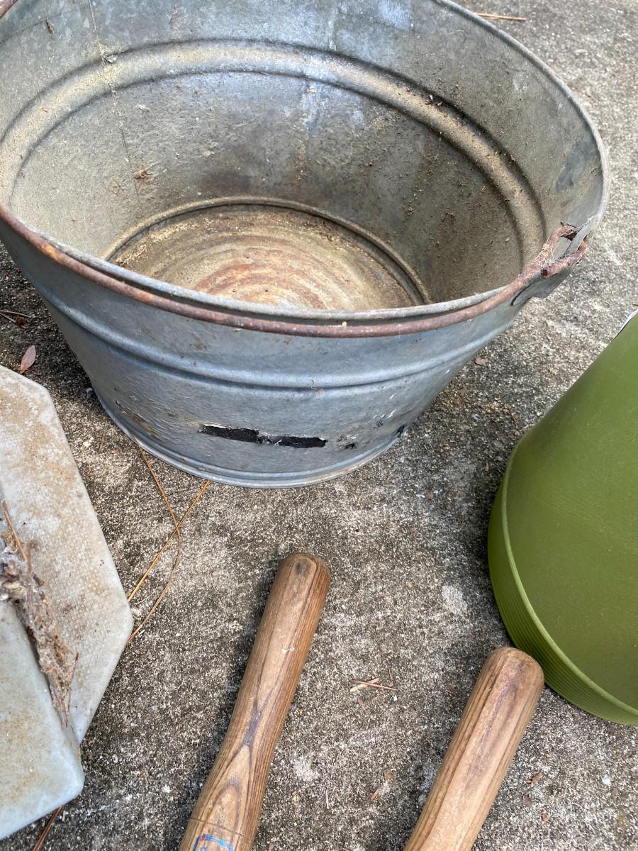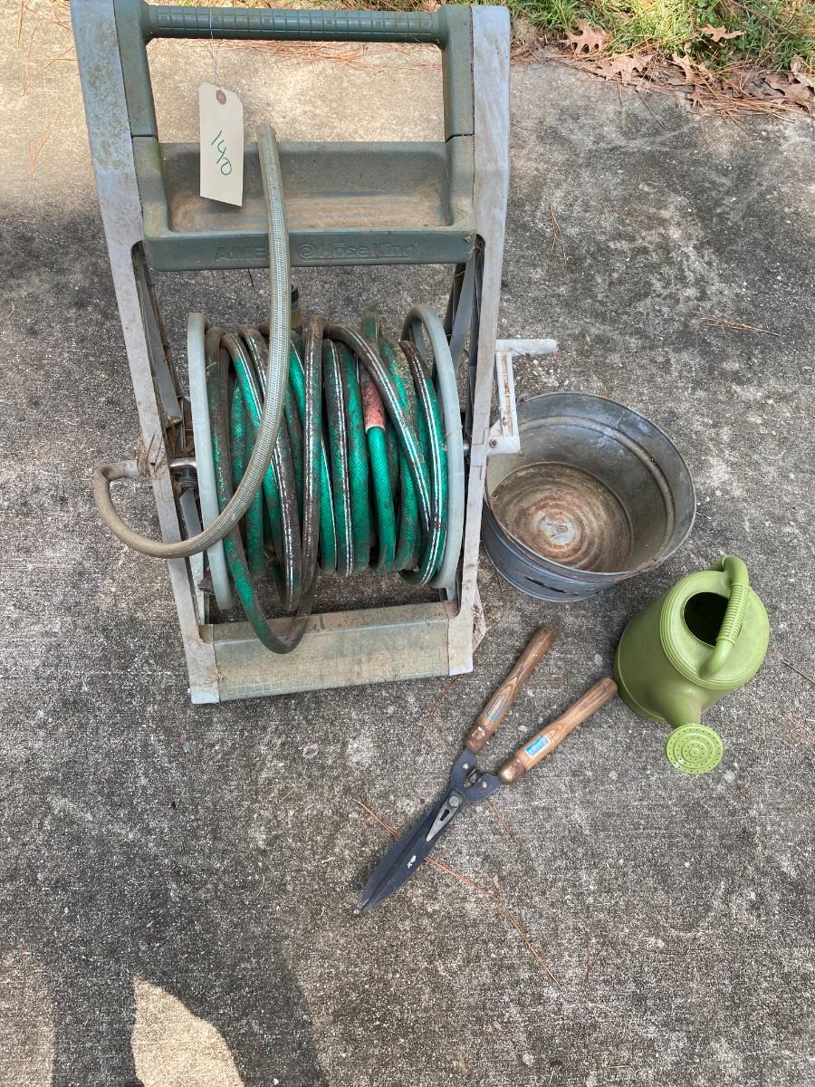 LOT 140 hose, reel, bucket, water can, clippers