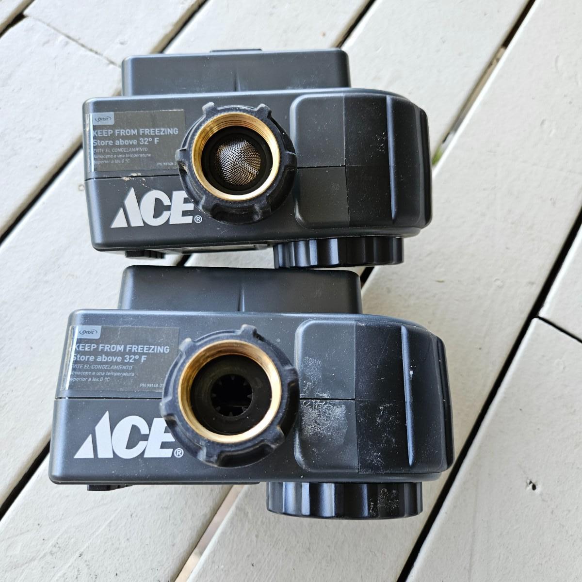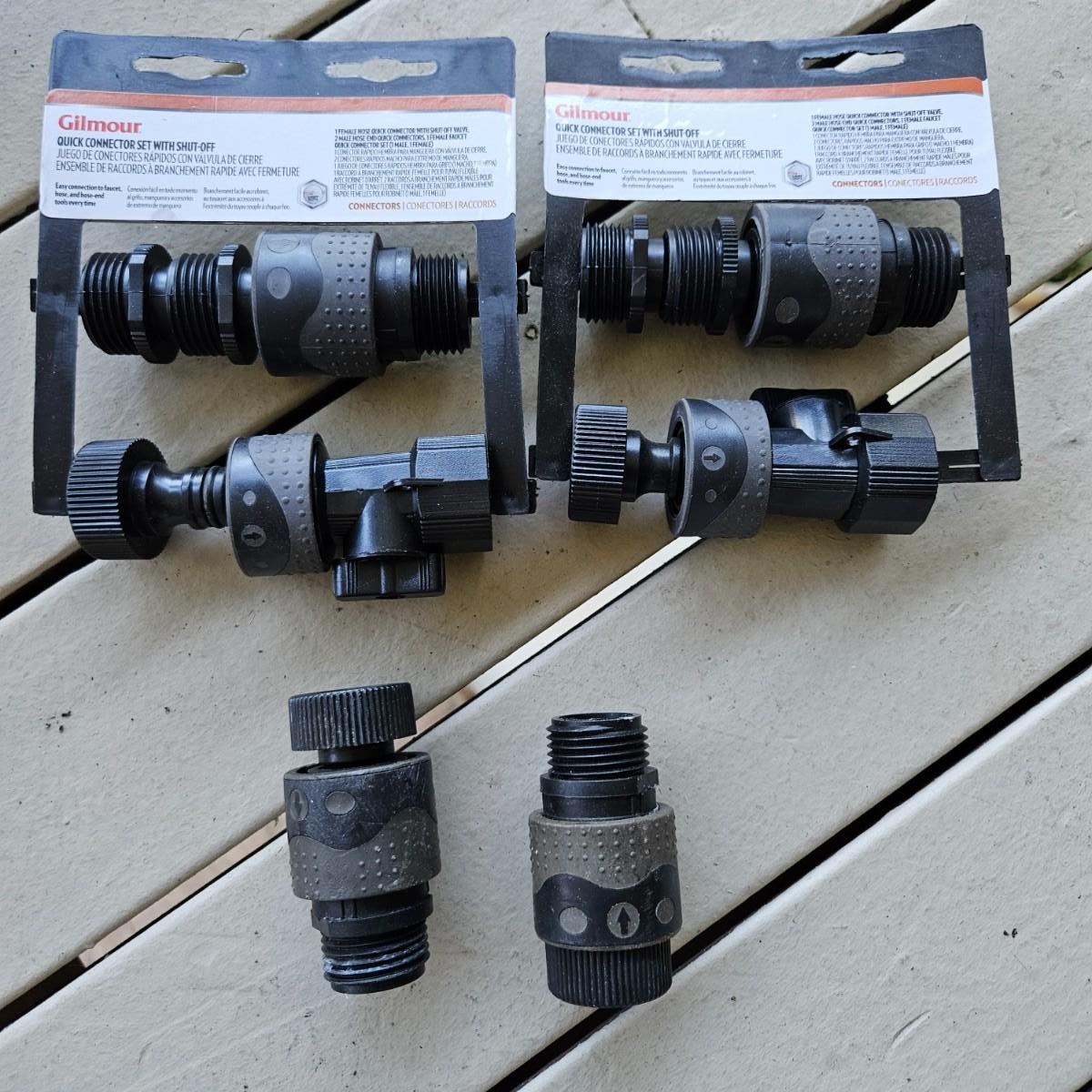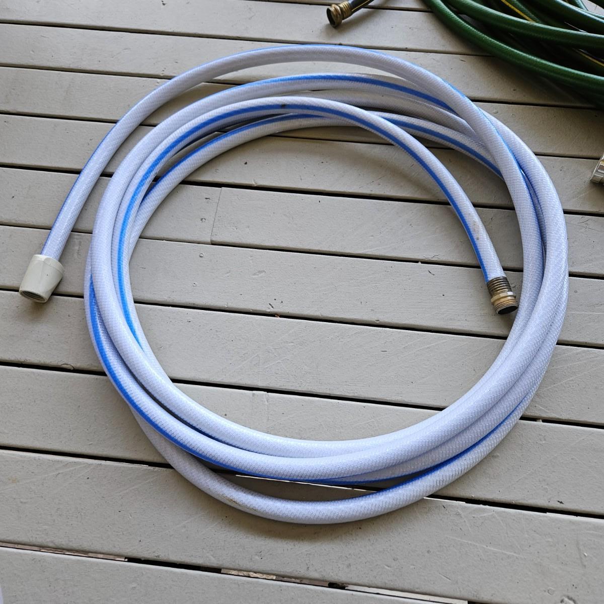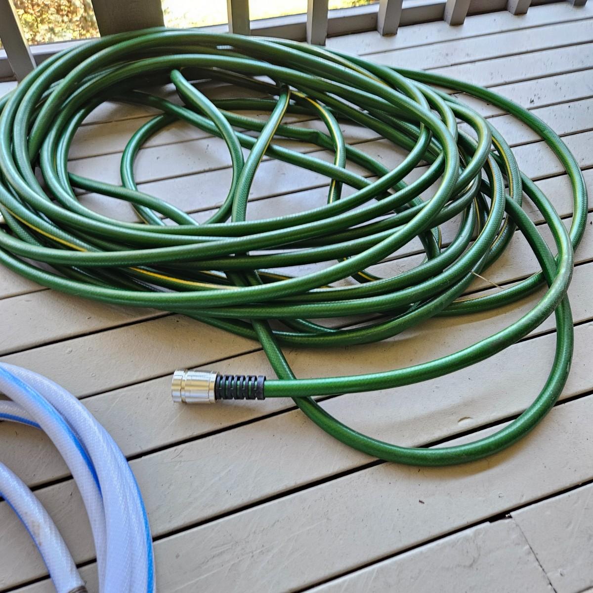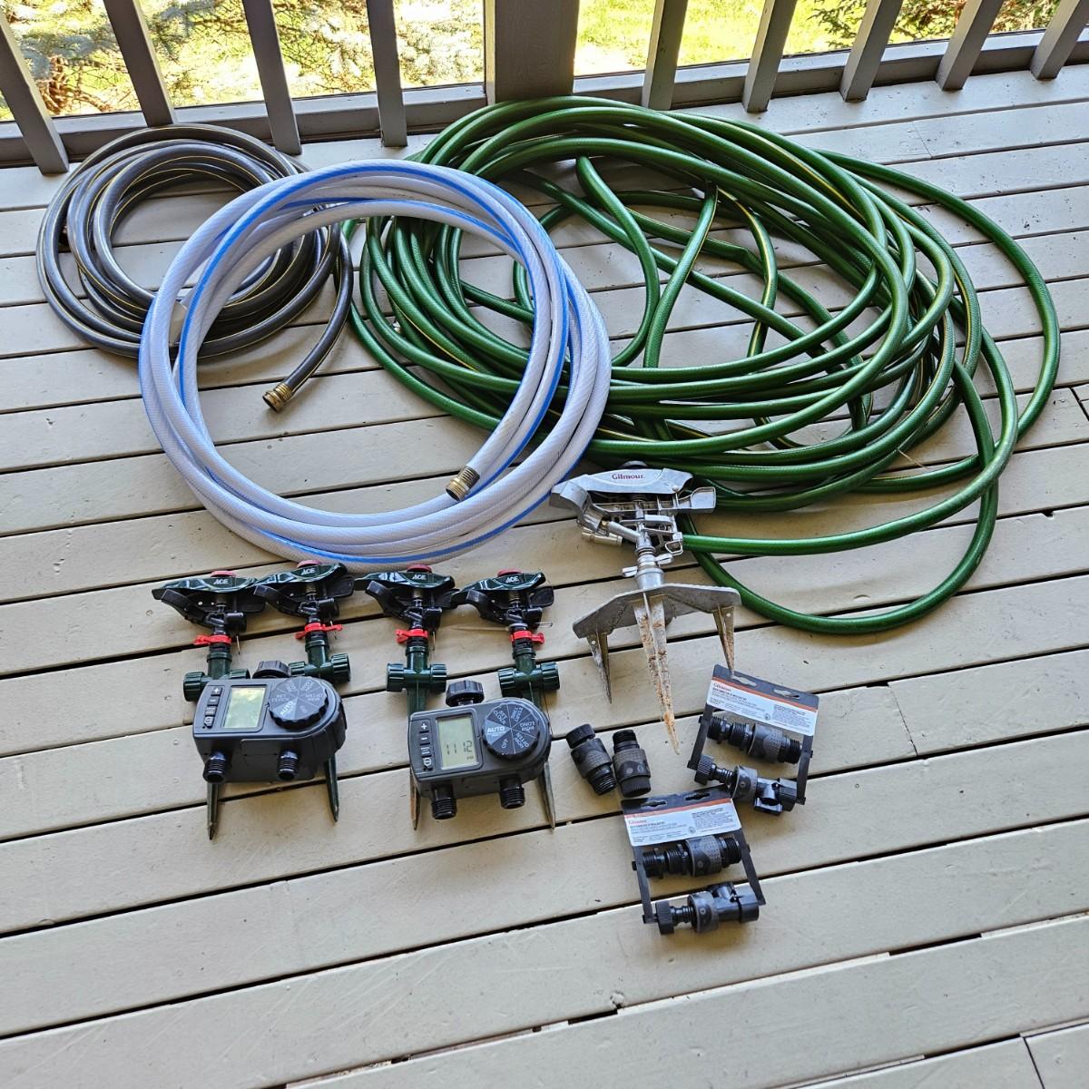 An assortment of three hoses. The green one appears to be 50' and the other the white one is approximately 15' and the black one is approximately 25'. Also includes multiple hose quick release connections and two automated watering controllers. Local pickup only