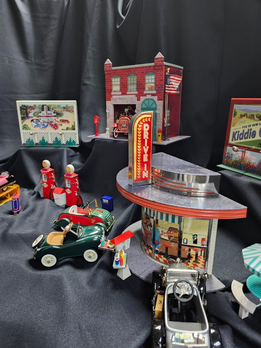 We have included 6 Hallmark Classic cars., Hallmark Kiddie Cars, pedal cars, some with lights, pedals work, steering works. They are also brand new in box, and are a little off scale to the display.