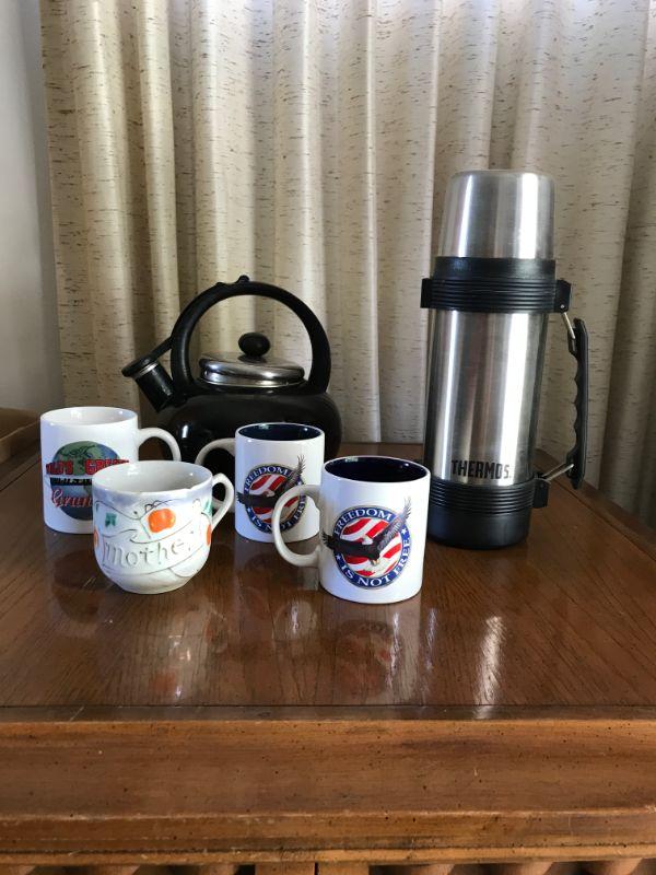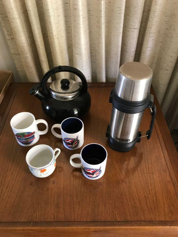 HOT BEVERAGE LOT - tea kettle, mugs, thermos