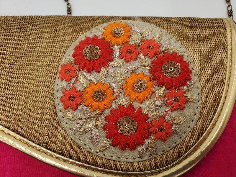 This purse is hot, hot pink, gold trim and accents...blue and green flowers adorned over hot pink. Gold color lining...small stain on back...Make a fashion statement with this retro purse.