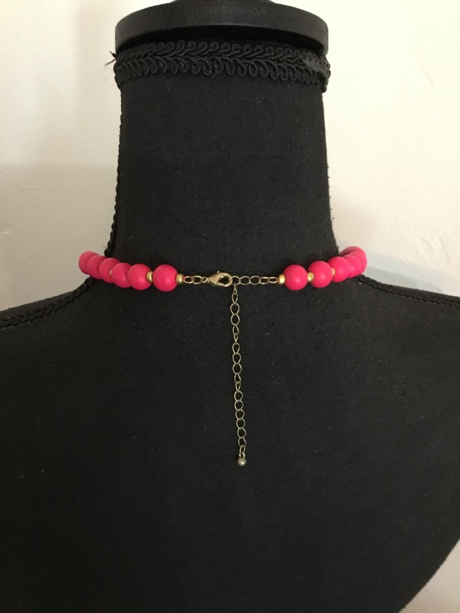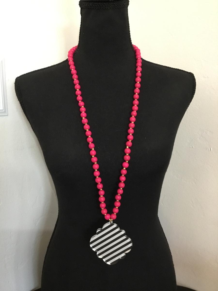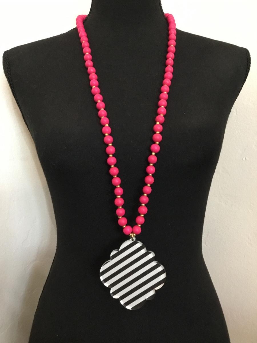Hot pink wooden beads, black and white acrylic, pendant statement, necklace
