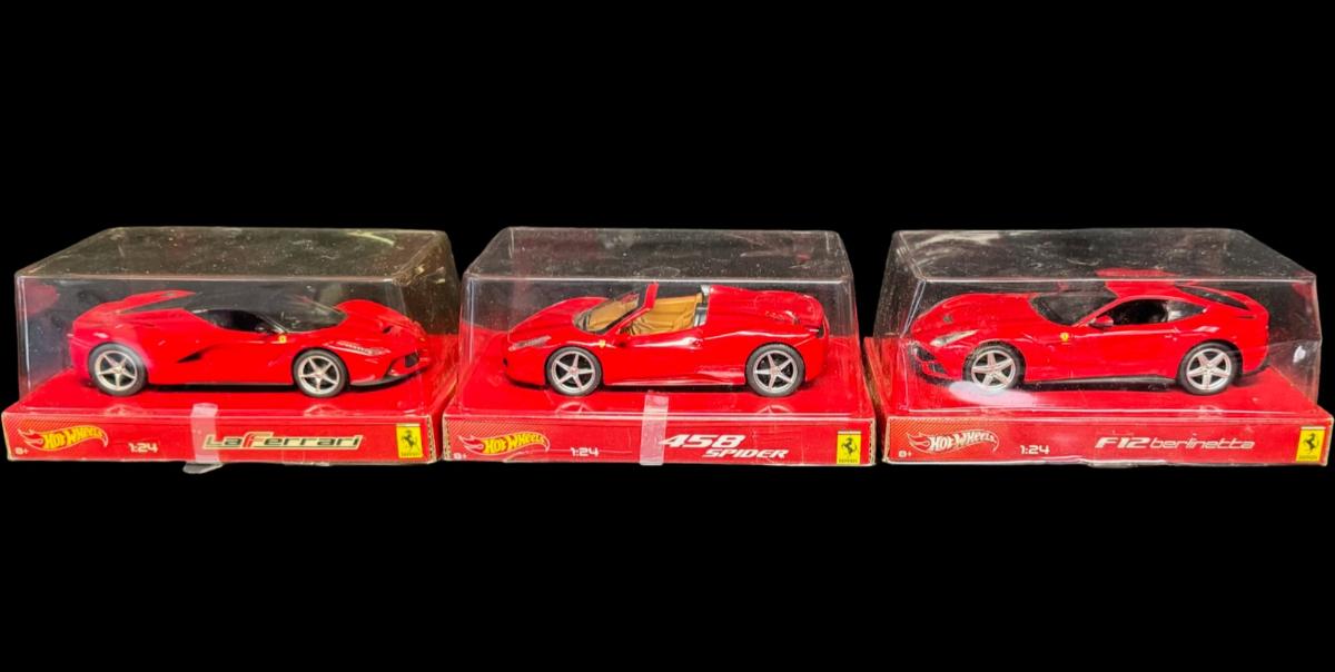 Includes an F12 Berlineta, a La Ferrari, and a 458 Spider. Total of three pieces. In the original packaging.