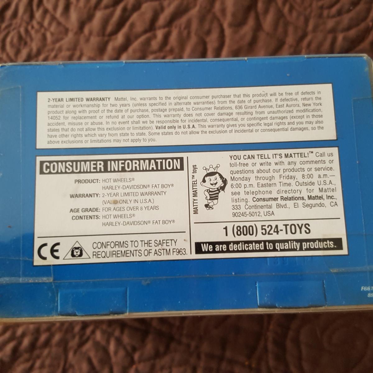 This auction lot is for a nice example of a Hot Wheels Harley Davidson Fat Boy Motorcycle. In display box as sold - appears to have never been taken from the box. This is a 1:18 Die-Cast Motorcycle with some plastic parts. The box shows a date of 2001. The item is in good condition with natural aging of the plastic display box and a slight bend in the front.