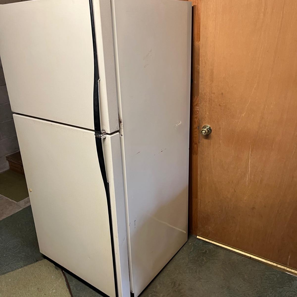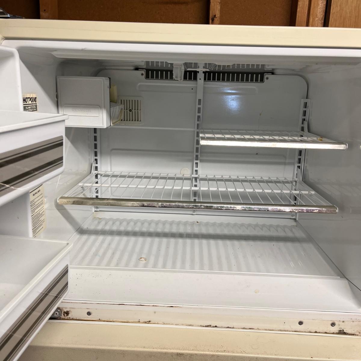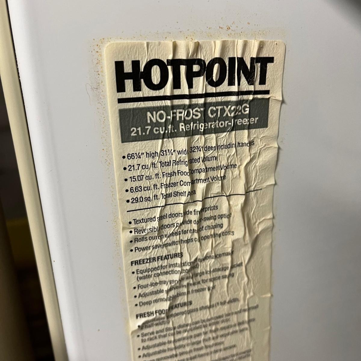Lot includes a Hotpoint Refrigerator 21.7 cubic foot model # CTG22G. Refrigerator worked when tested. Refrigerator will need to have winning bidder take doors off to get out of basement. Refrigerator measures 31” x 31.5” x 67.5”. Bring help item is substantial.