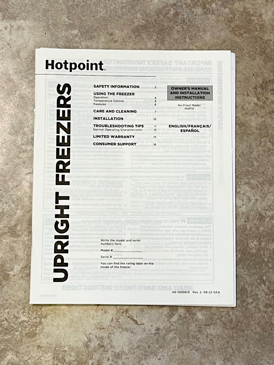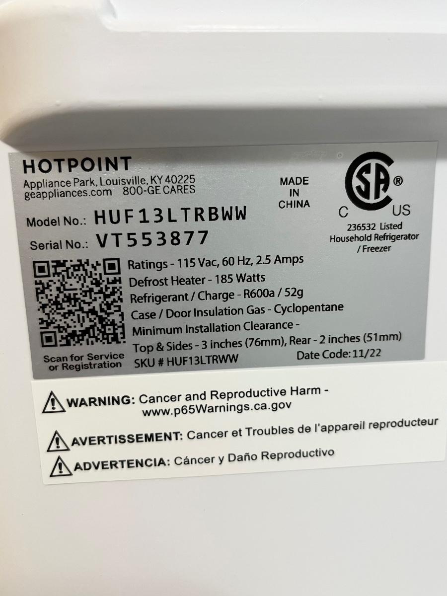 Model #HUF 13LTRBWW ~ 65 1/4”H x 27 5/8” W x 26 1/8” D ~ Owner purchased brand new in June 2023 ~Manufacturer date 11/22
