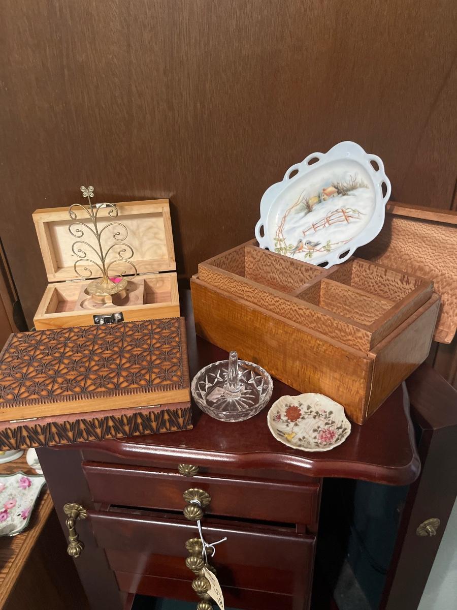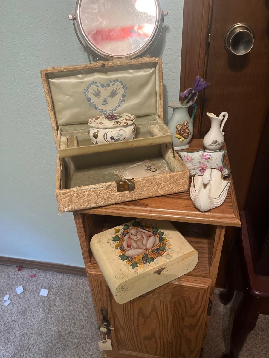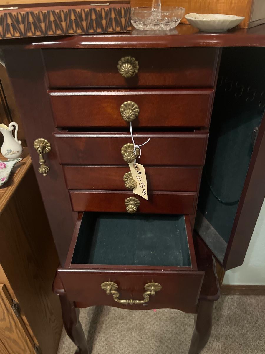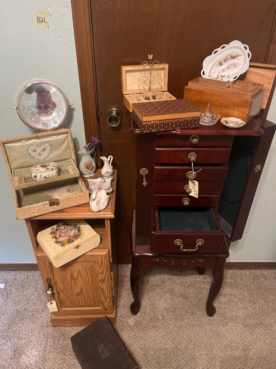 House items, jewelry box and stand, cabinet