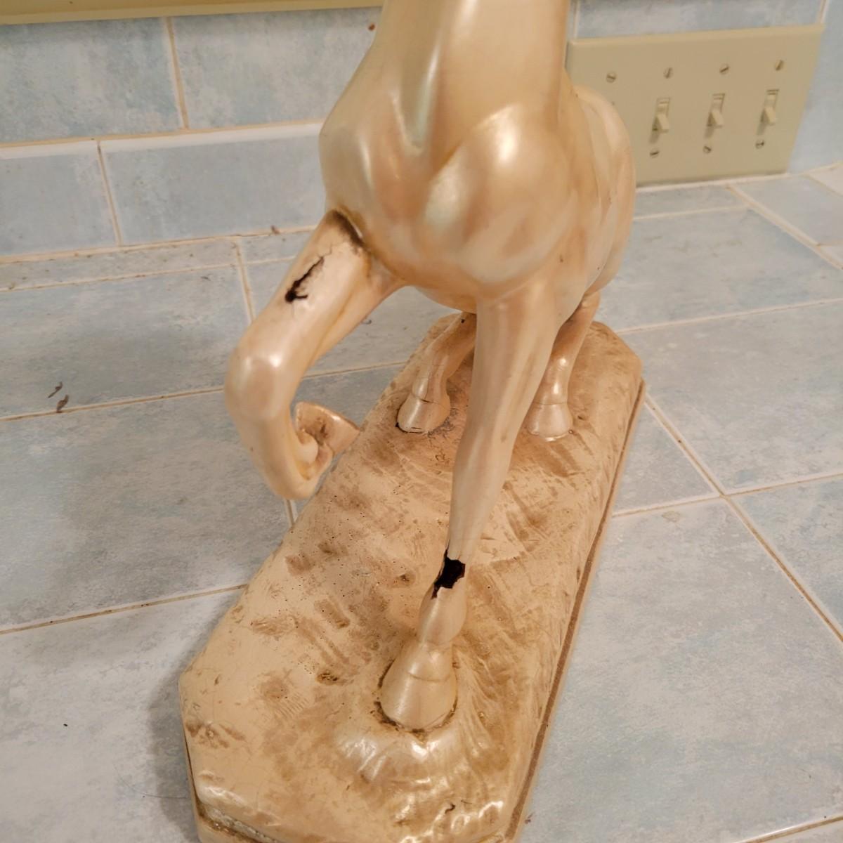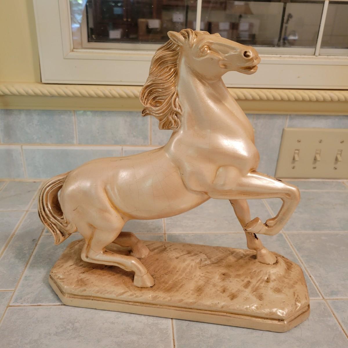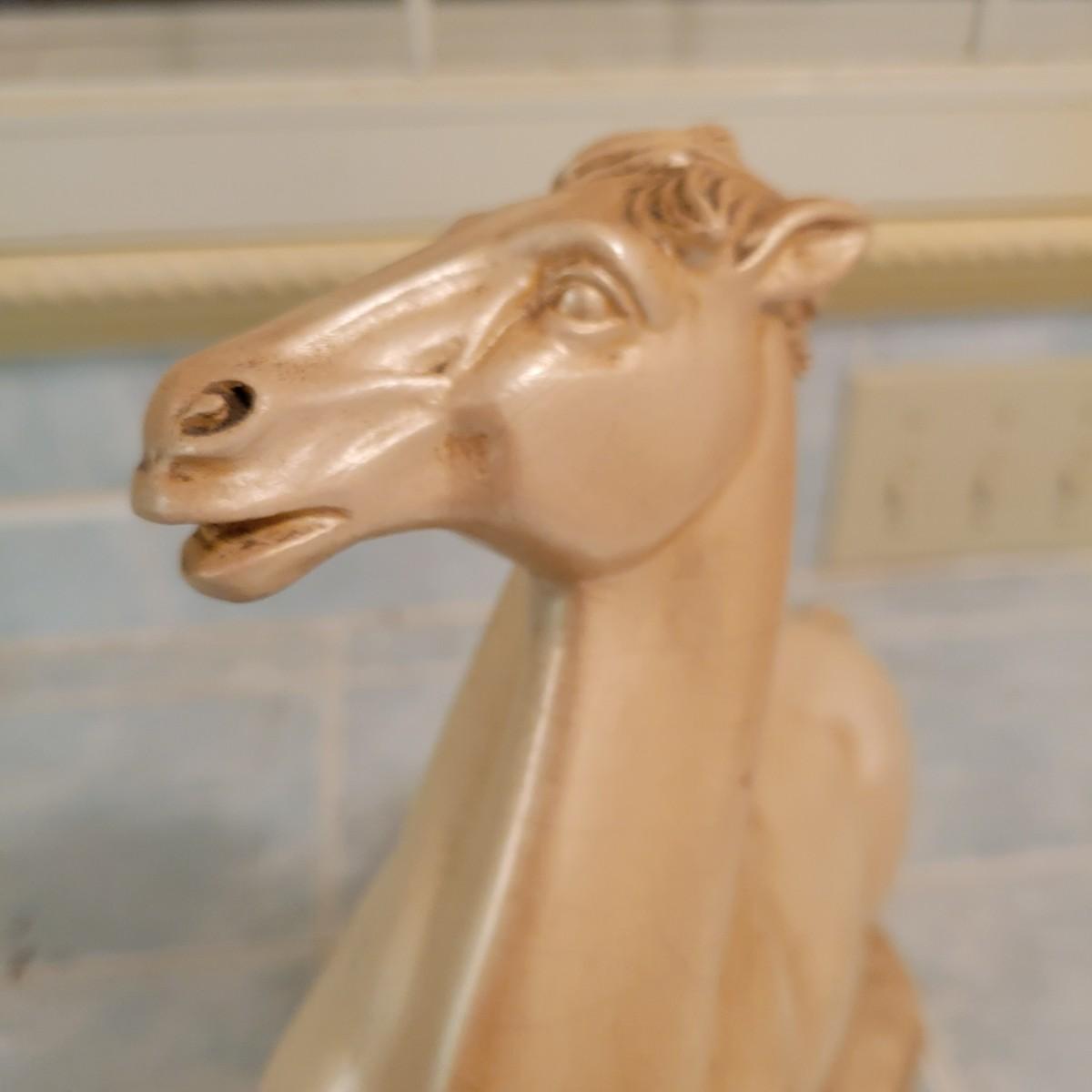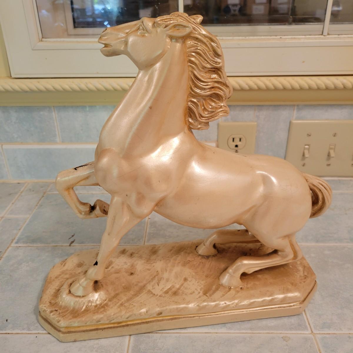 Up for bid is the pictured House Of David horse art statue. It is from Benton Harbor, Michigan. It is composed of hard plaster they called "hydrostone". The Italian artist was Frank Rosetta. The piece is in fair condition as there are sections of the pearlization flaking off and cracking on the rest of the body. Piece measures approximately 13" x 5" x 13" Shipping available