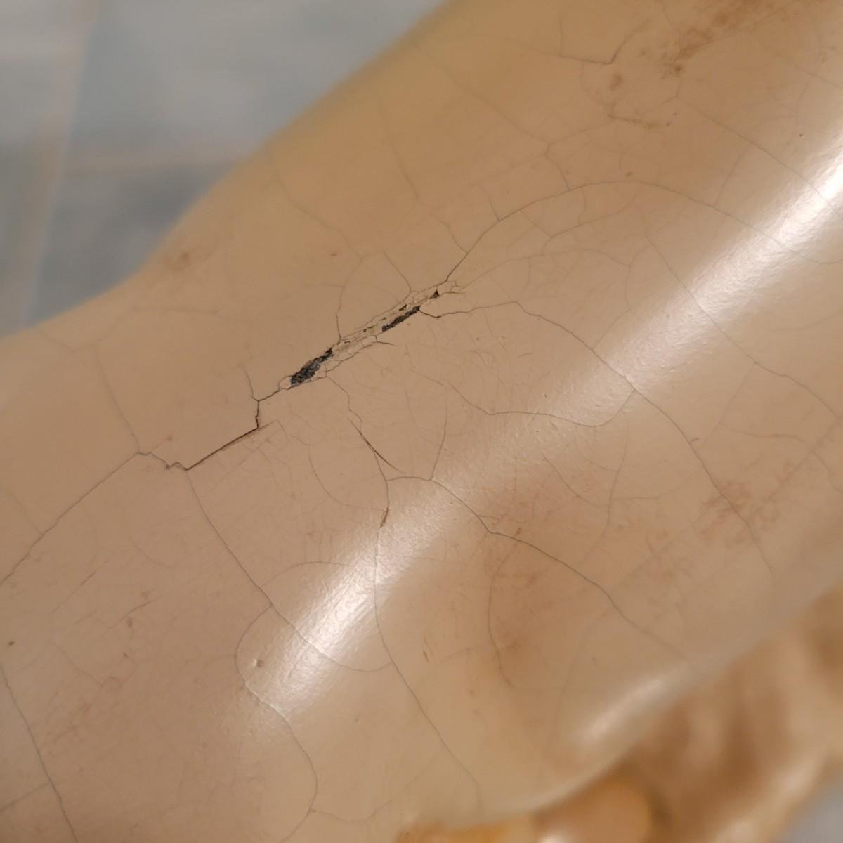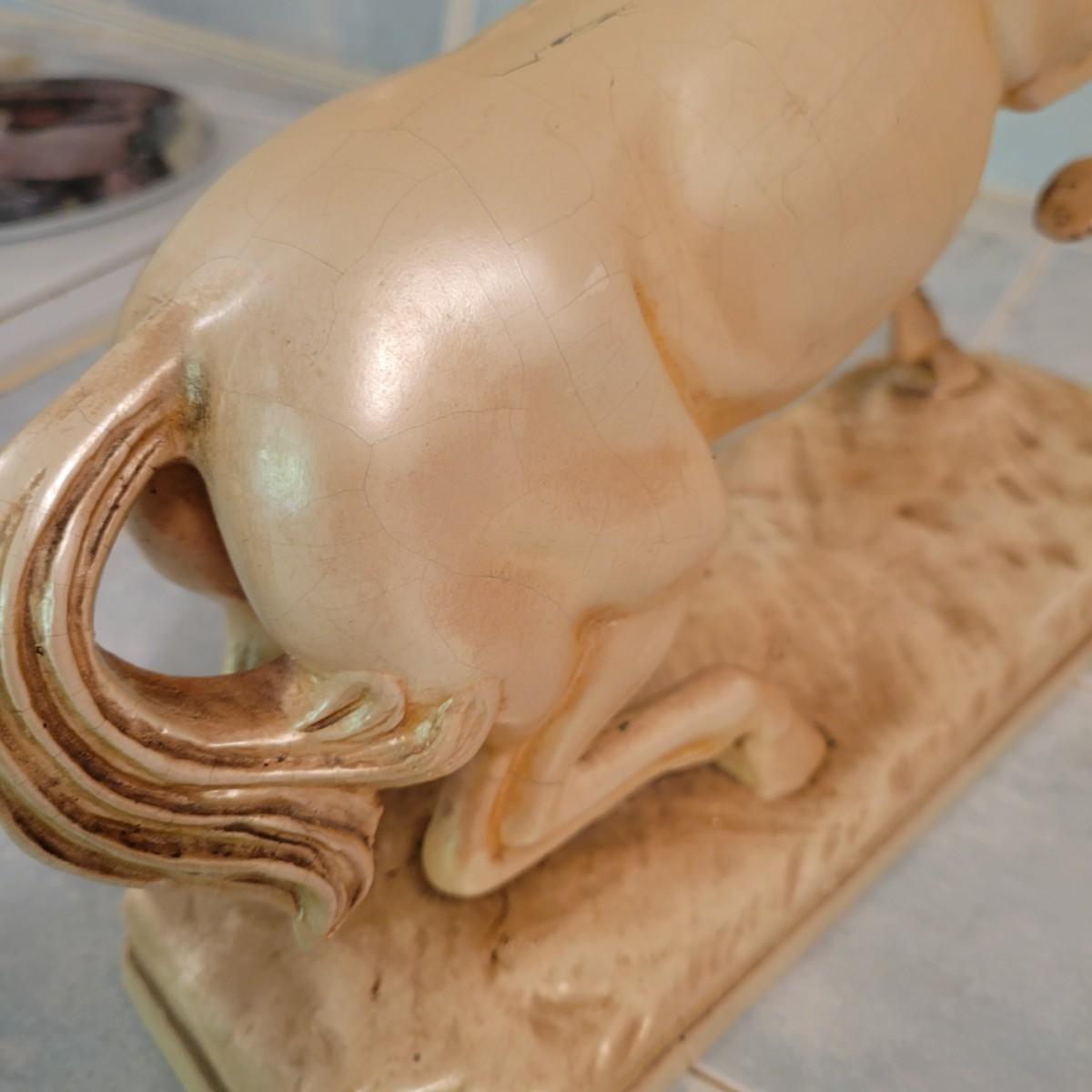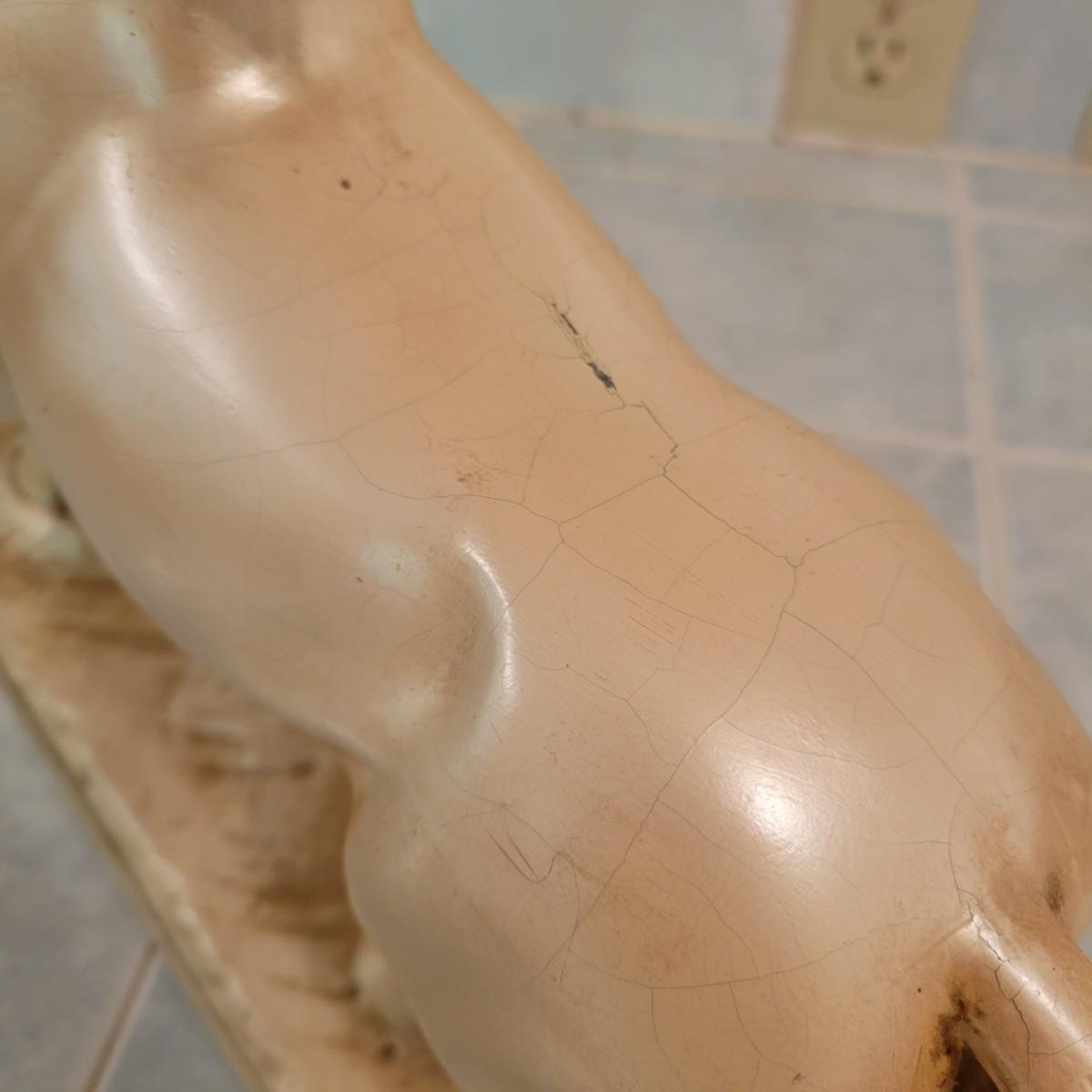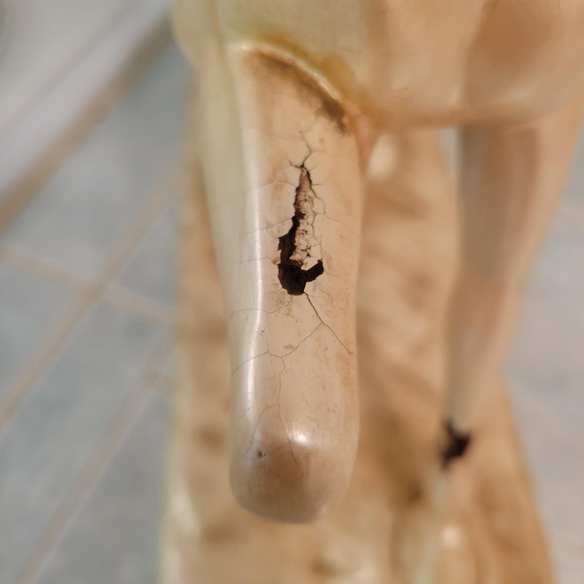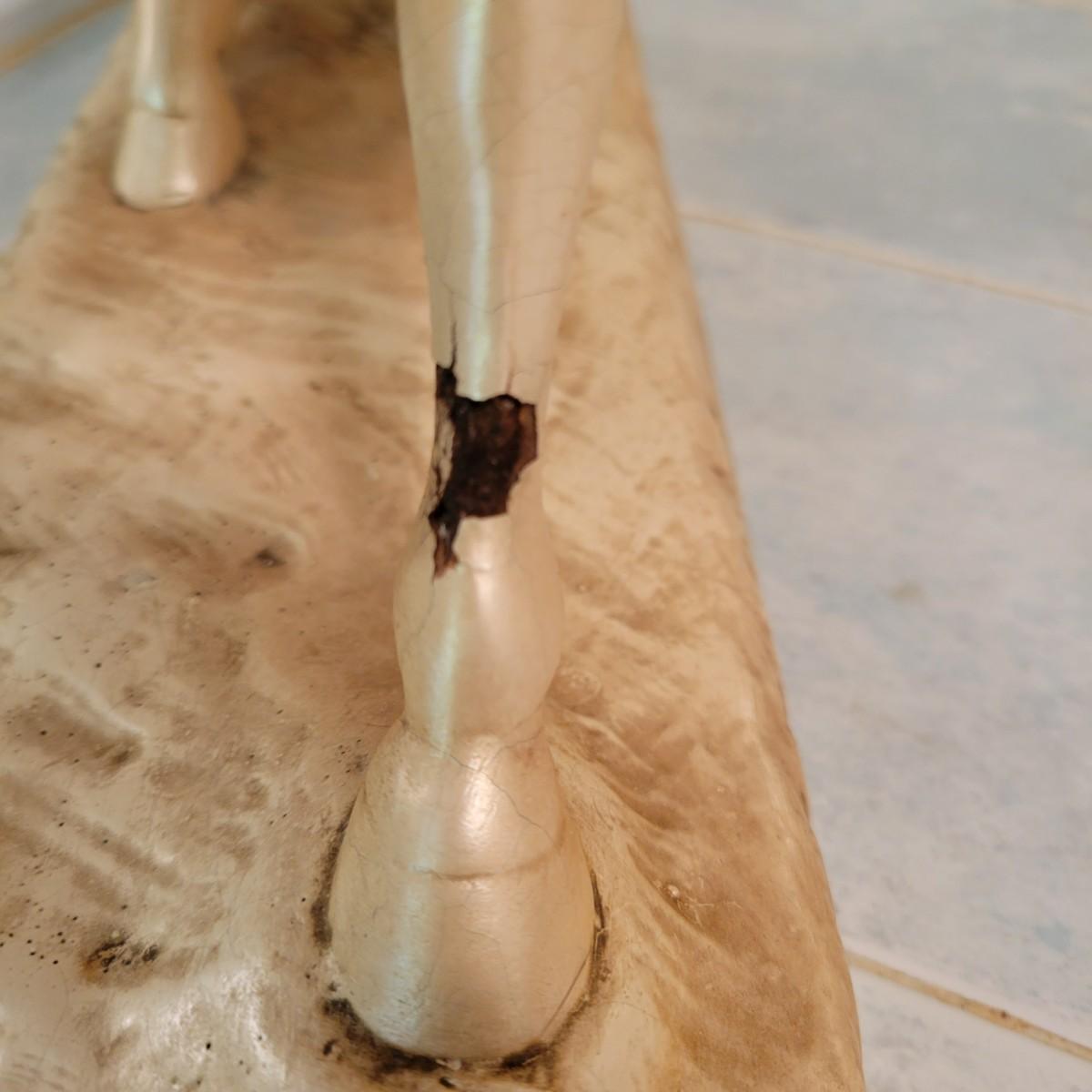 Up for bid is the pictured House Of David horse art statue. It is from Benton Harbor, Michigan. It is composed of hard plaster they called "hydrostone". The Italian artist was Frank Rosetta. The piece is in fair condition as there are sections of the pearlization flaking off and cracking on the rest of the body. Piece measures approximately 13" x 5" x 13" Shipping available