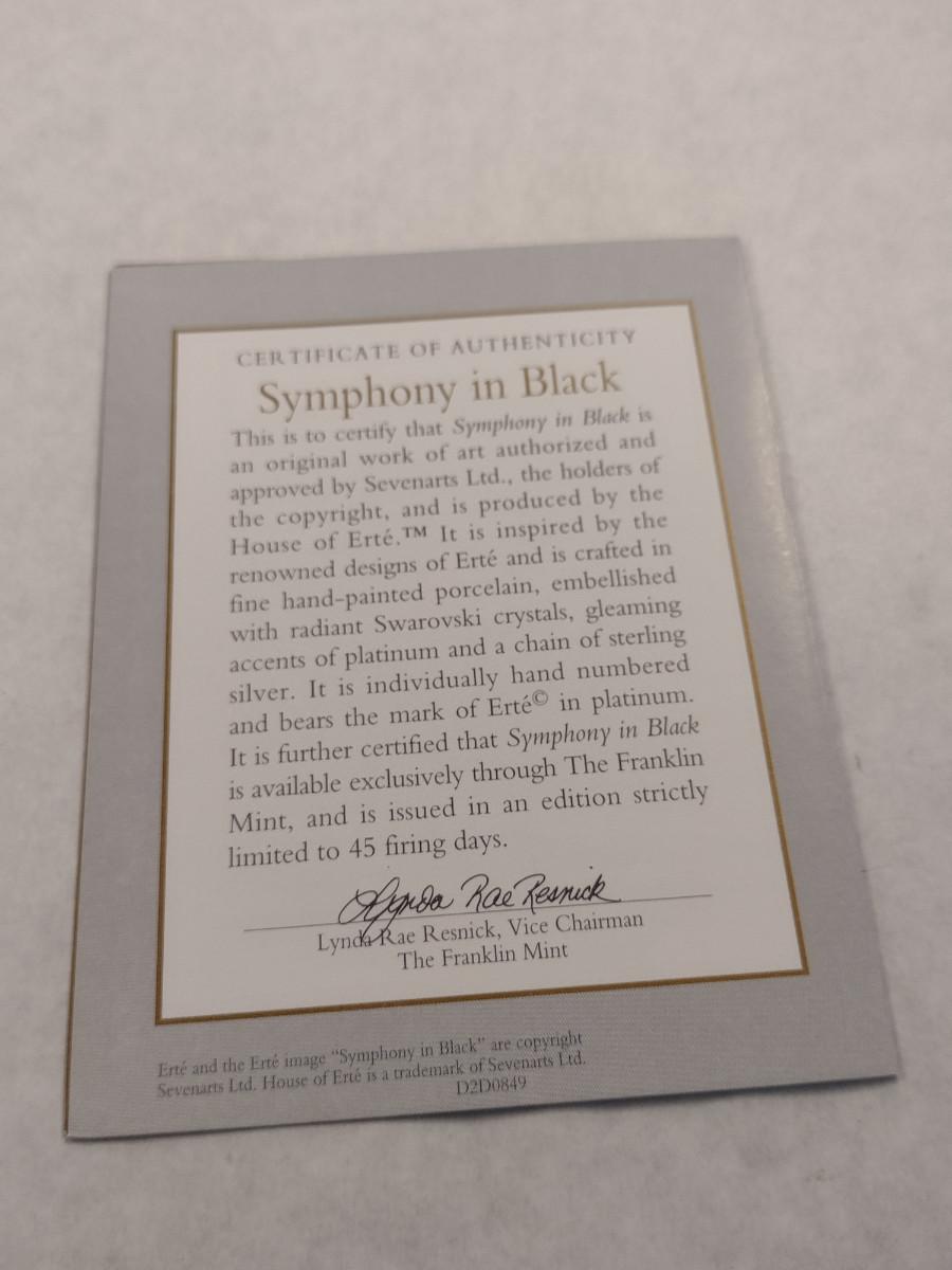 House of Erte Numbered, Limited Edition, Hand Painted Porcelain 'Symphony in Black' Art Deco Figurine- No. M5166. Part of a collection released by Franklin Mint. Figurine stands approx 10 1/2" tall and comes with COA. No noticeable chips or cracks. Appears to be in good condition. Item will be available for third party packing and shipping only.