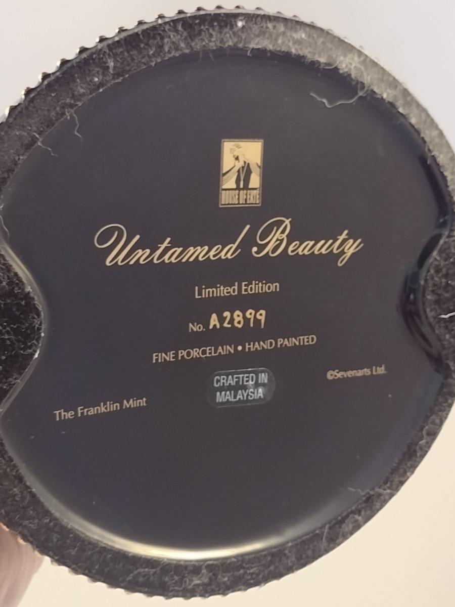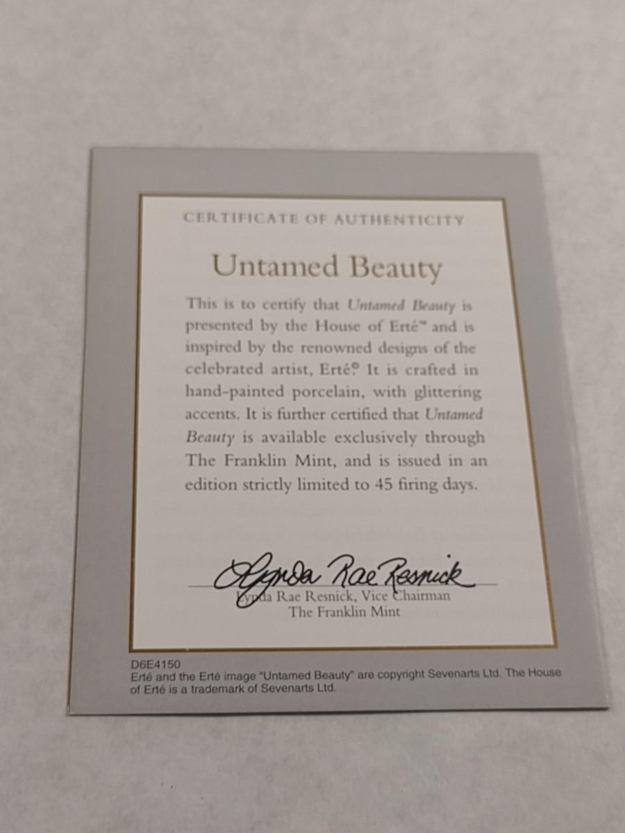 House of Erte Numbered, Limited Edition, Hand Painted Porcelain 'Untamed Beauty' Art Deco Figurine- No. A2899. Part of a collection released by Franklin Mint. Figurine stands approx 9 3/4" tall and comes with COA. No noticeable chips or cracks. Appears to be in good condition. Item will be available for third party packing and shipping only.
