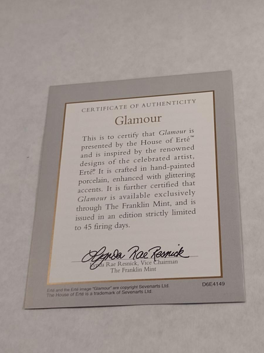 House of Erte Numbered, Limited Edition, Hand Painted Porcelain 'Glamour' Art Deco Figurine- No. 4035. Part of a collection released by Franklin Mint. Figurine stands approx 10 1/4" tall and comes with COA. Please see all pictures- item appears to be missing part of one finger. Item will be available for third party packing and shipping only.
