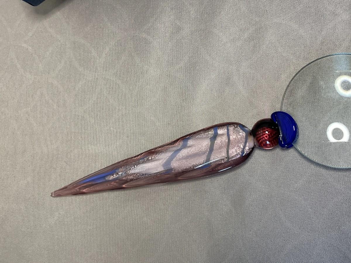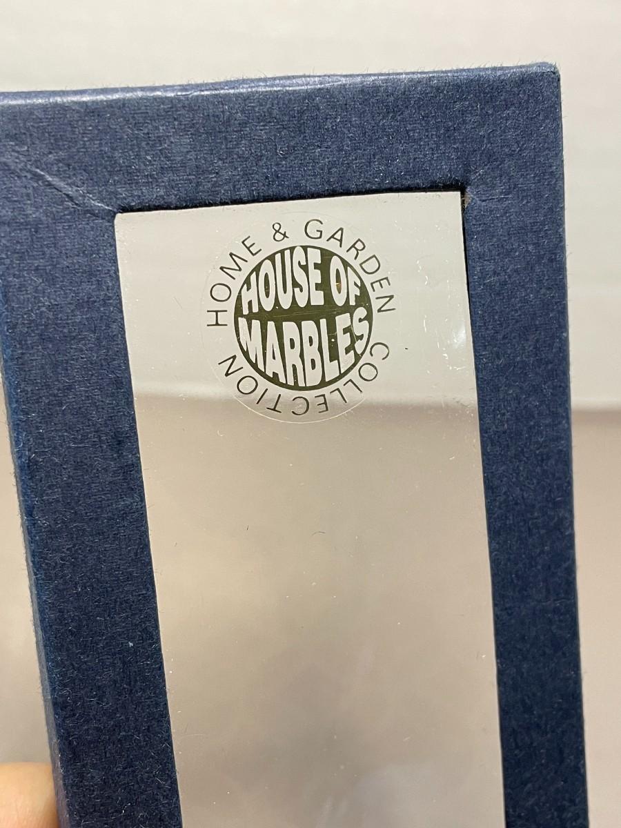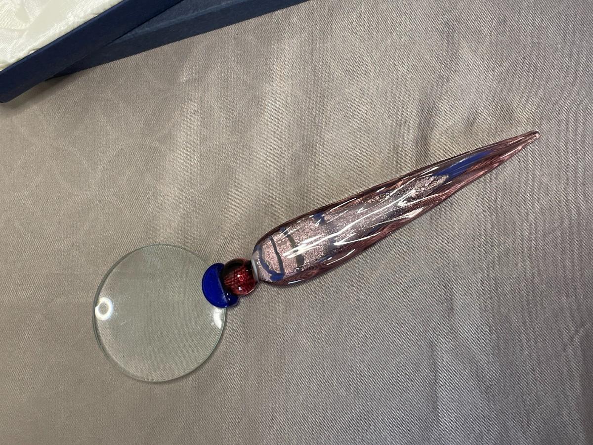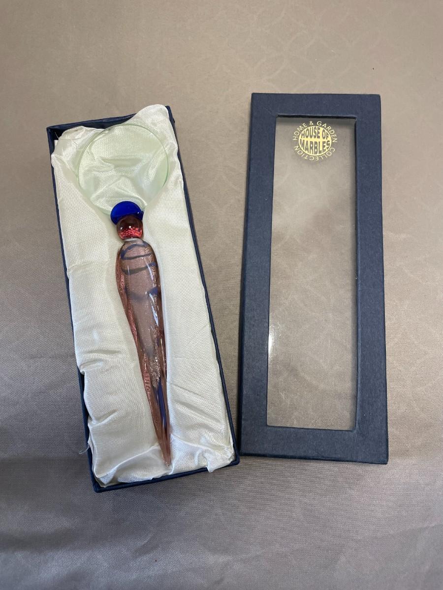 This is a pretty magnfier that has a glass handle and the magnifier is in great condition. The total length is about 7 inches and it has the original box which is still in gift giving condition.