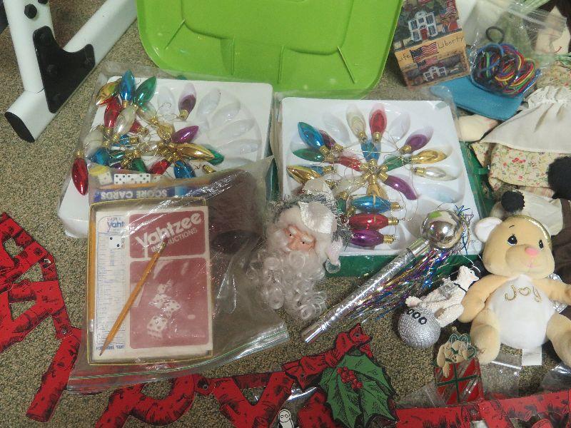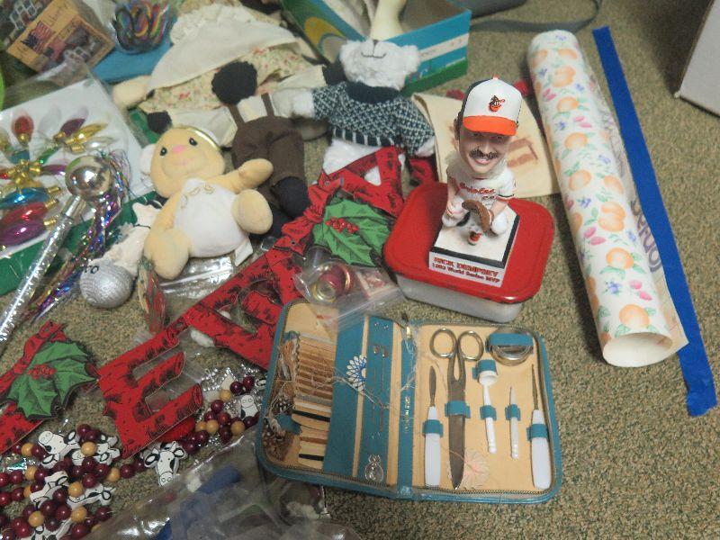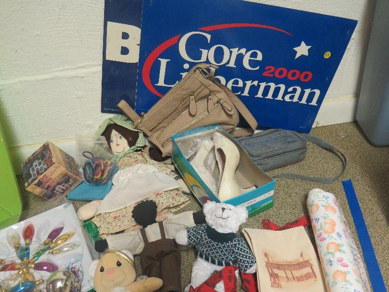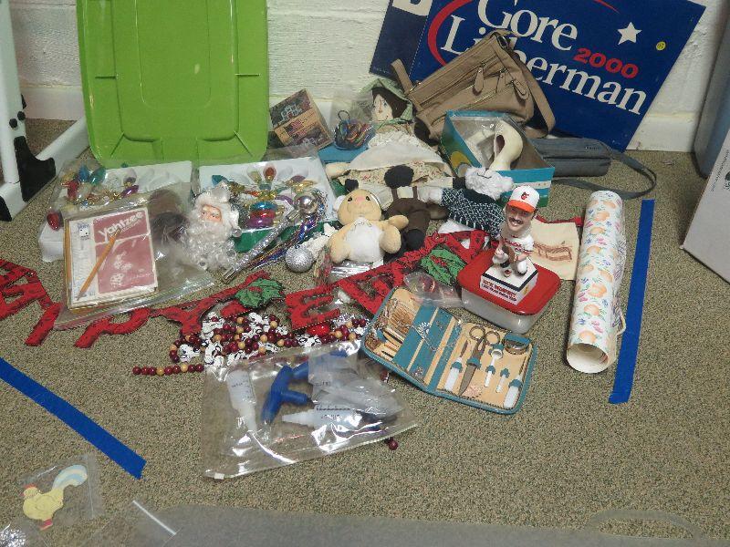 Christmas ornaments, games, woman's purses and shoes, dolls, stuffed animals, political signs, and more. Bring box to move from basement.
