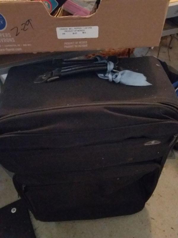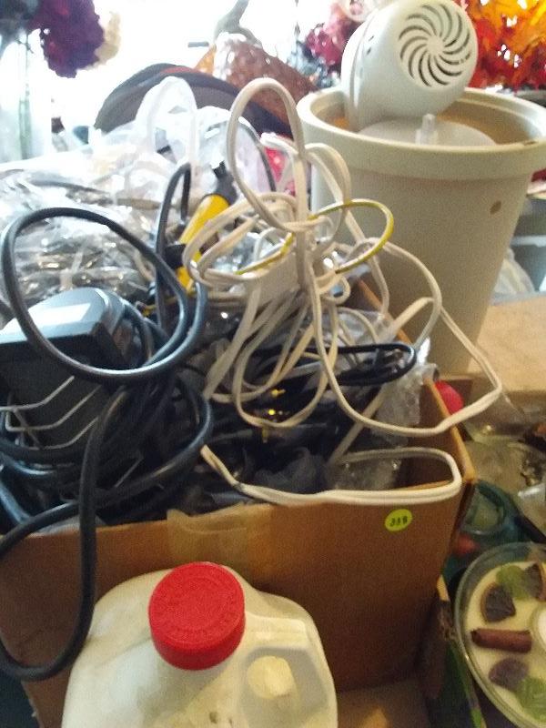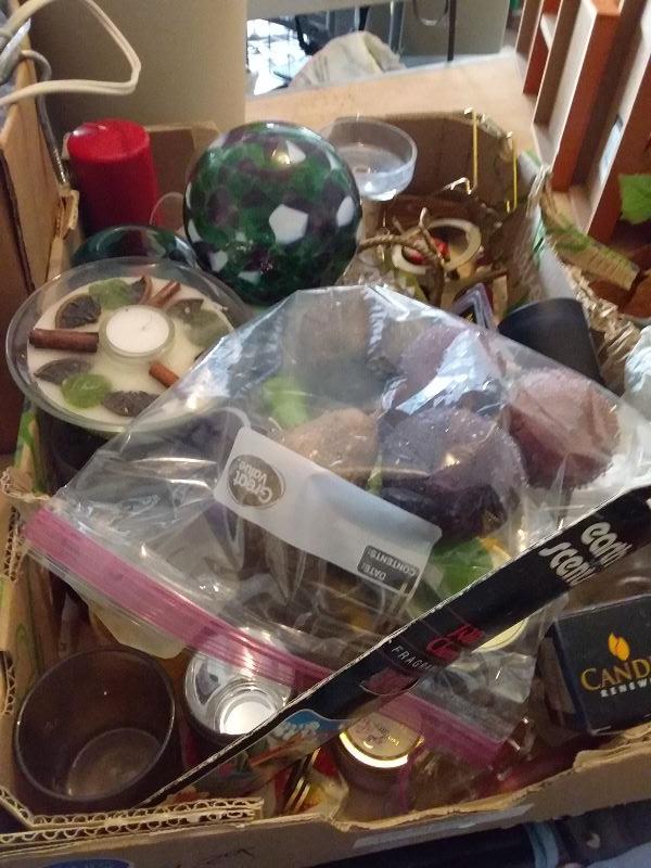 Suitcase, electrical cords, ice cream maker, box of candles and candle holders