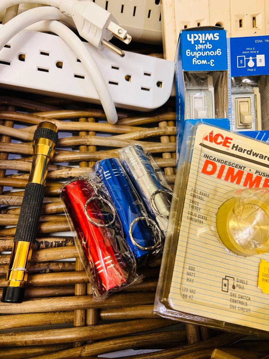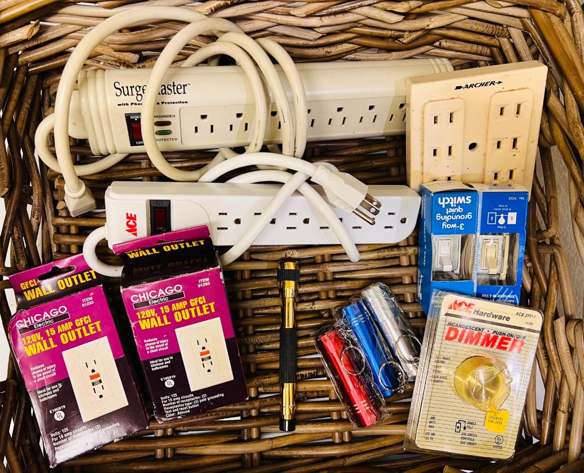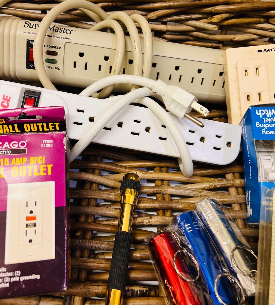 Household lot includes power cords, wall outlets, and flashlights. Please note that basket is not included.