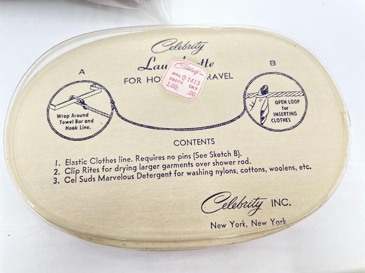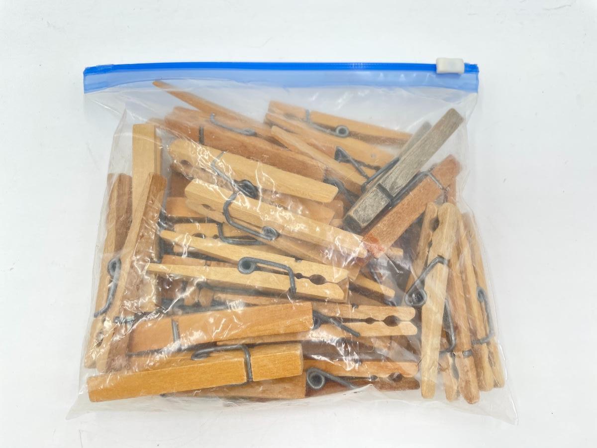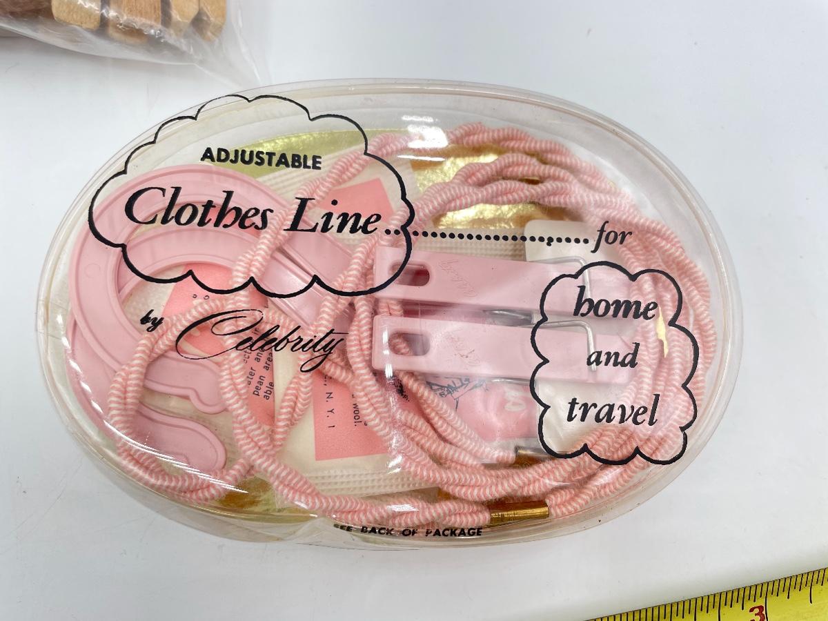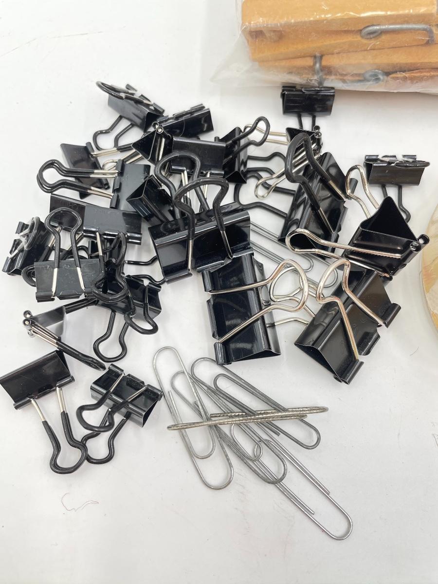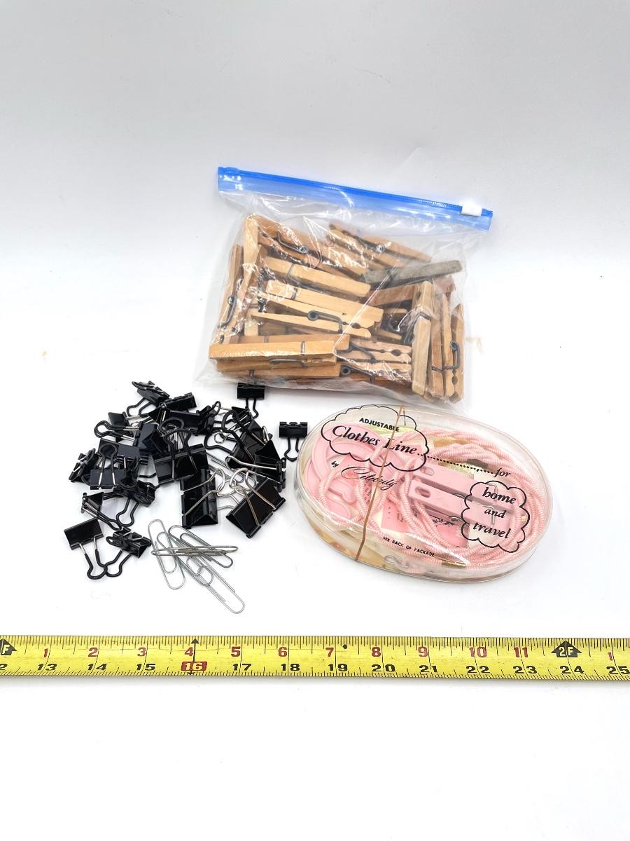Includes vintage pink clothesline and clips, wooden clothespins, a few paper clips, and binder clips.