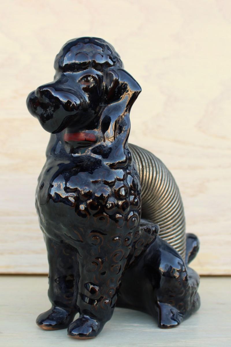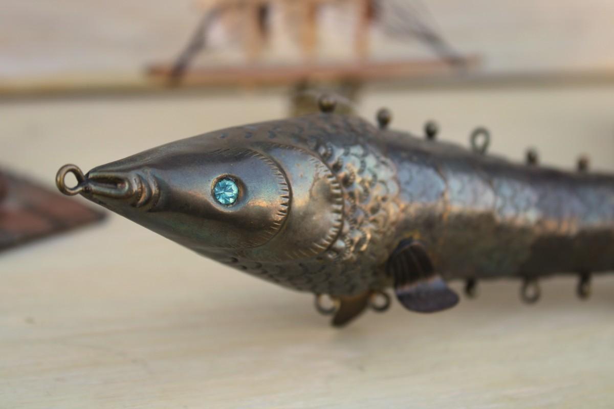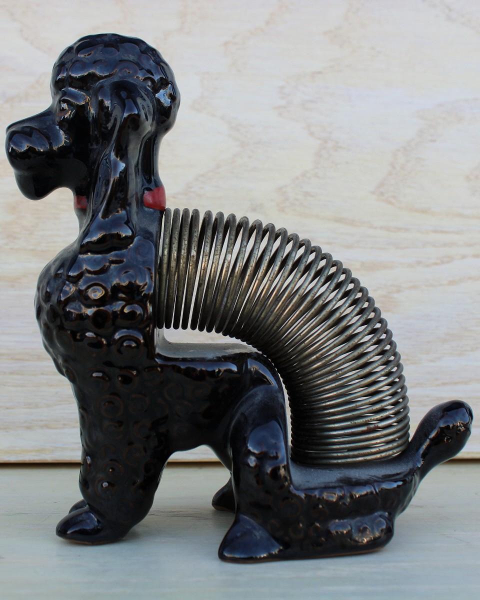 Household décor: piano music box, slinky dog statue, metal fish, shell boat figurine