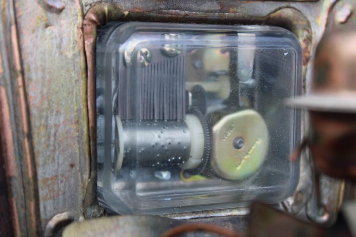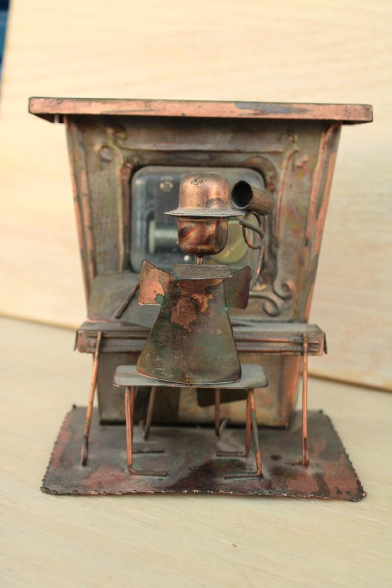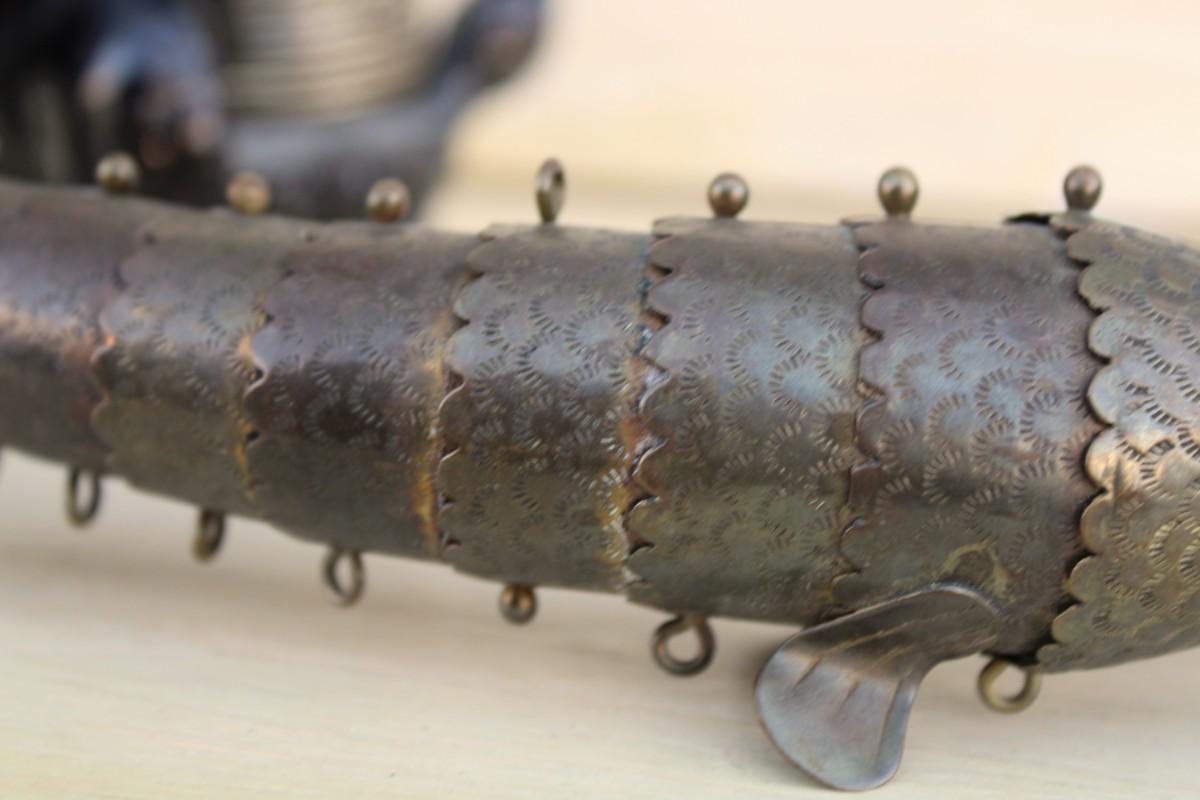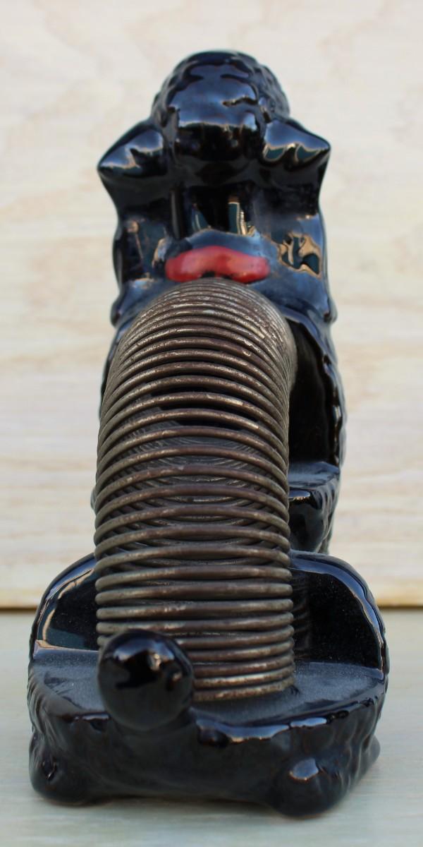 Household décor: piano music box, slinky dog statue, metal fish, shell boat figurine
