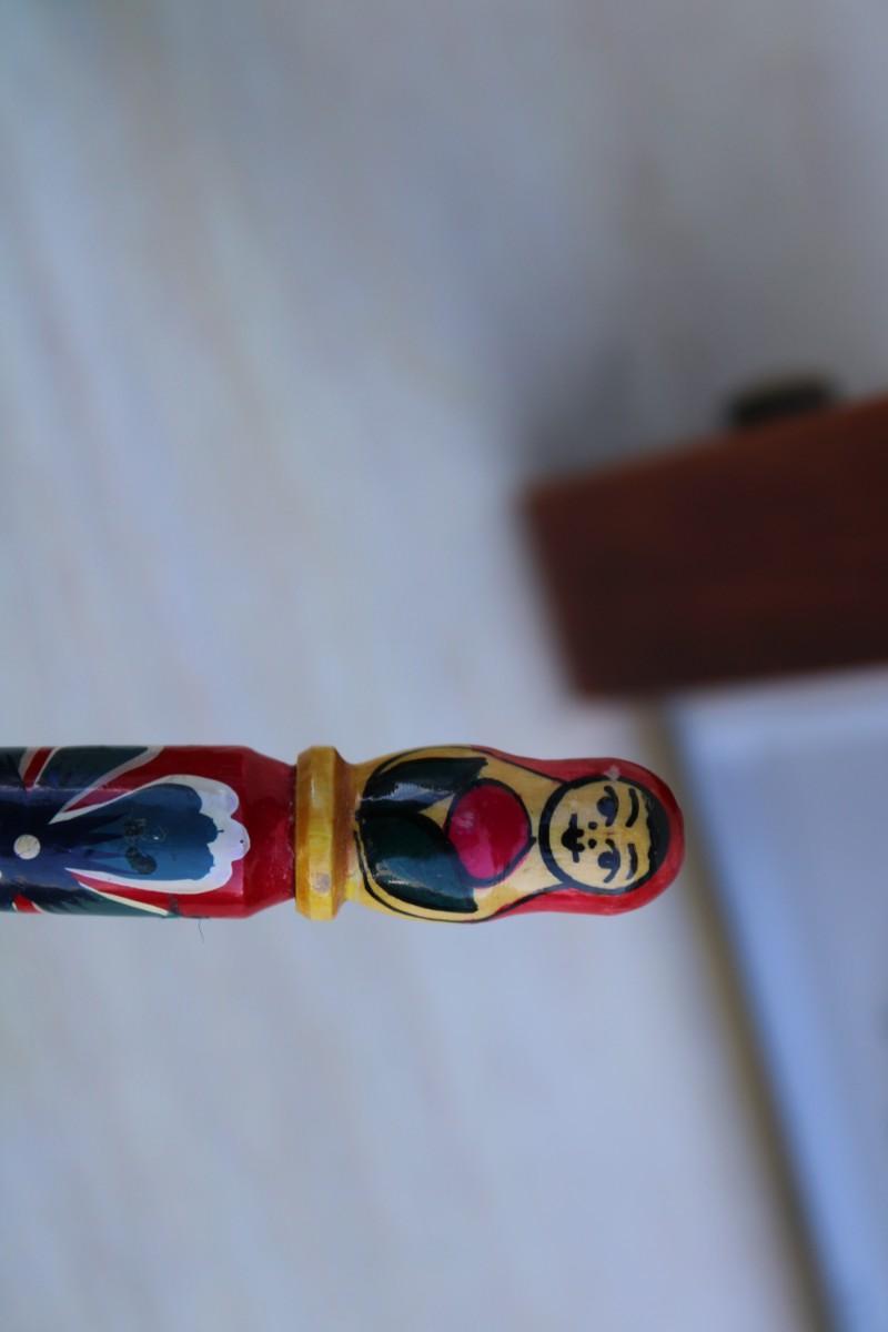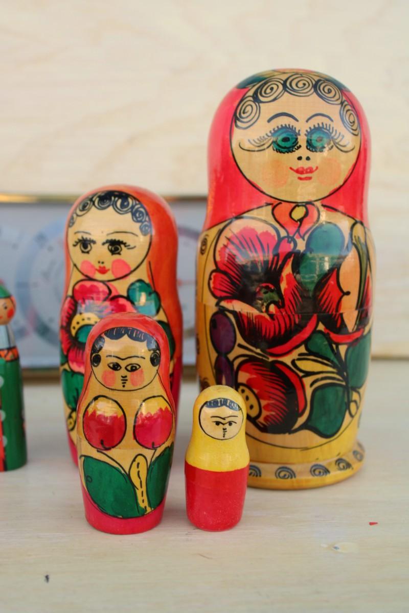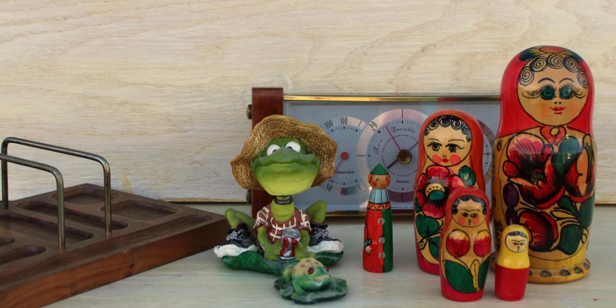 Household décor: Russian nesting doll, weather clock, Russian nesting doll pen, frog figurines, organizational tray